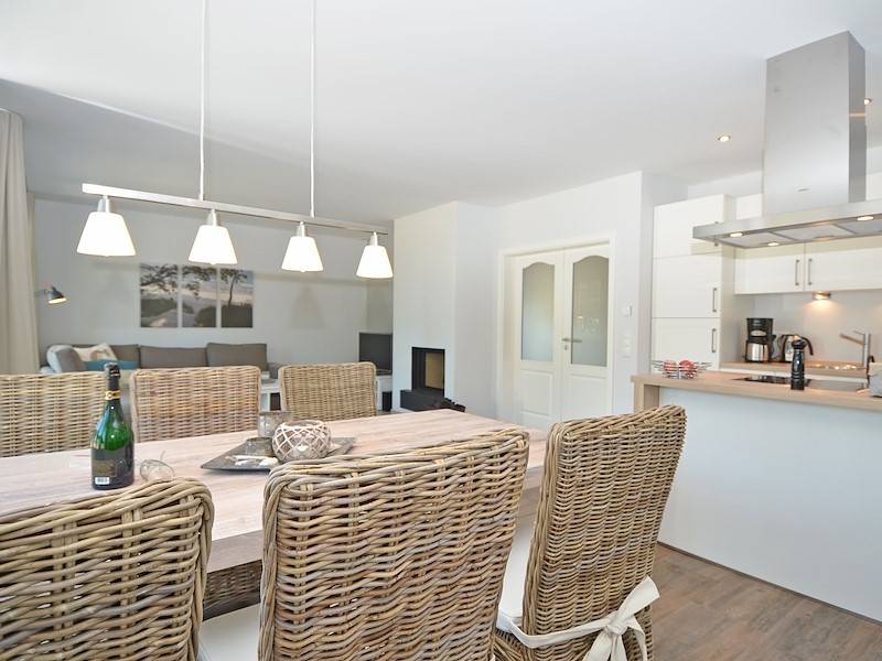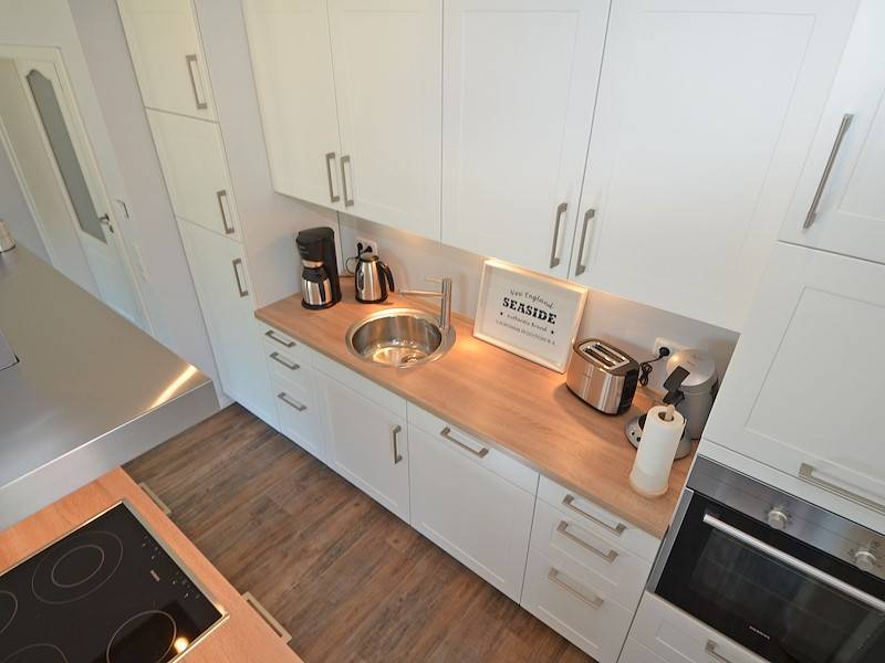 Die moderne Einbauküche mit Backofen in Arbeitshöhe und einer Kochinsel mit Blick auf das Meer ist ein wahres Highlight, in der sogar ein Kochmuffel zum Hobbykoch mutiert.
