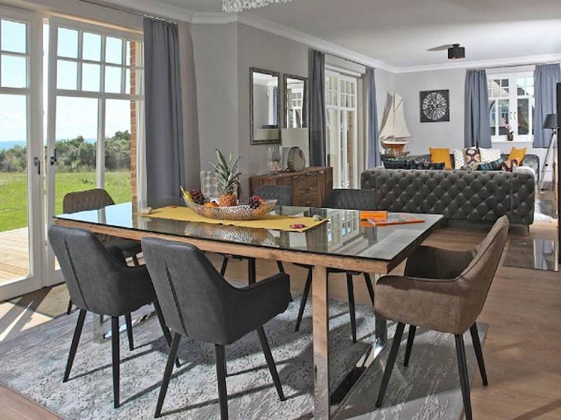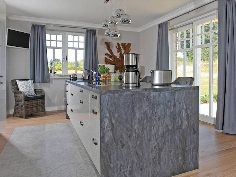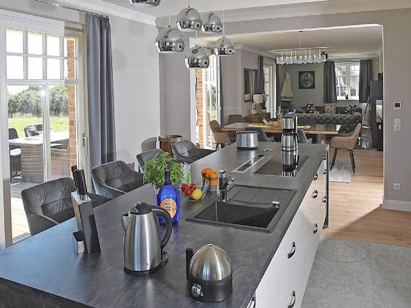 Im Inneren des Ferienhaus East Sea in Lobbe laden 240 m² Wohnfläche zum Wohlfühlen und Relaxen ein, in dem ein Kaminofen neben der Fußbodenheizung in der kühleren Jahreszeit für kuschelige Wärme sorgt. Die großzügige Küche ist mit einer Kochinsel und hochwertigen Elektrogeräten samt Mikrowelle ausgestattet. Eine zusätzliche Sitzmöglichkeit und ein Flachbildschirm leisten beste Gesellschaft während des Kochens.