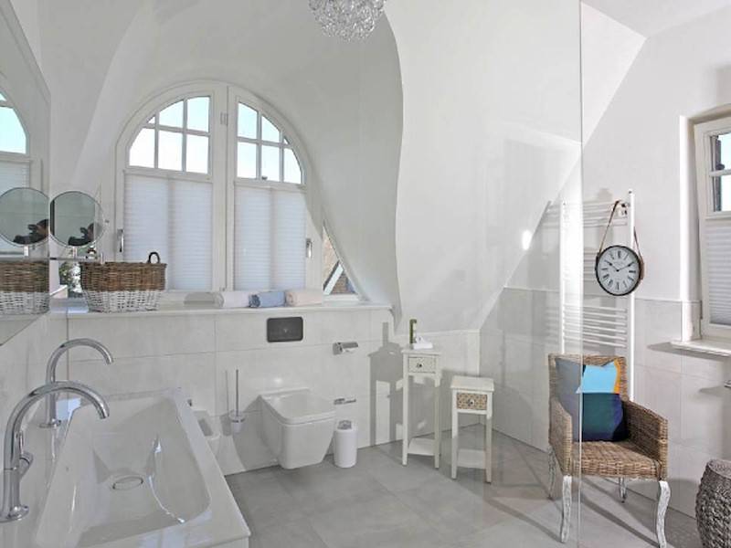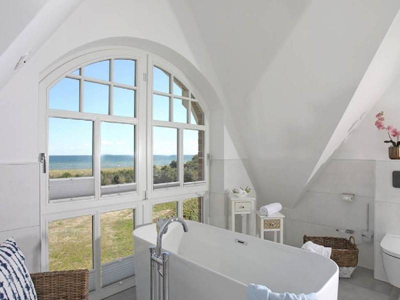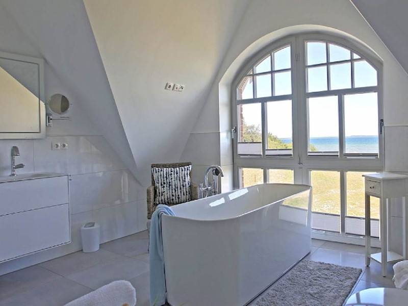 Badetuch Badewanne freistehend Bidet Doppelwaschbecken Fenster Fußbodenheizung Handtuch Handtuchheizkörper Kosmetikspiegel Meerblick Plissees Walk- In- Dusche WC