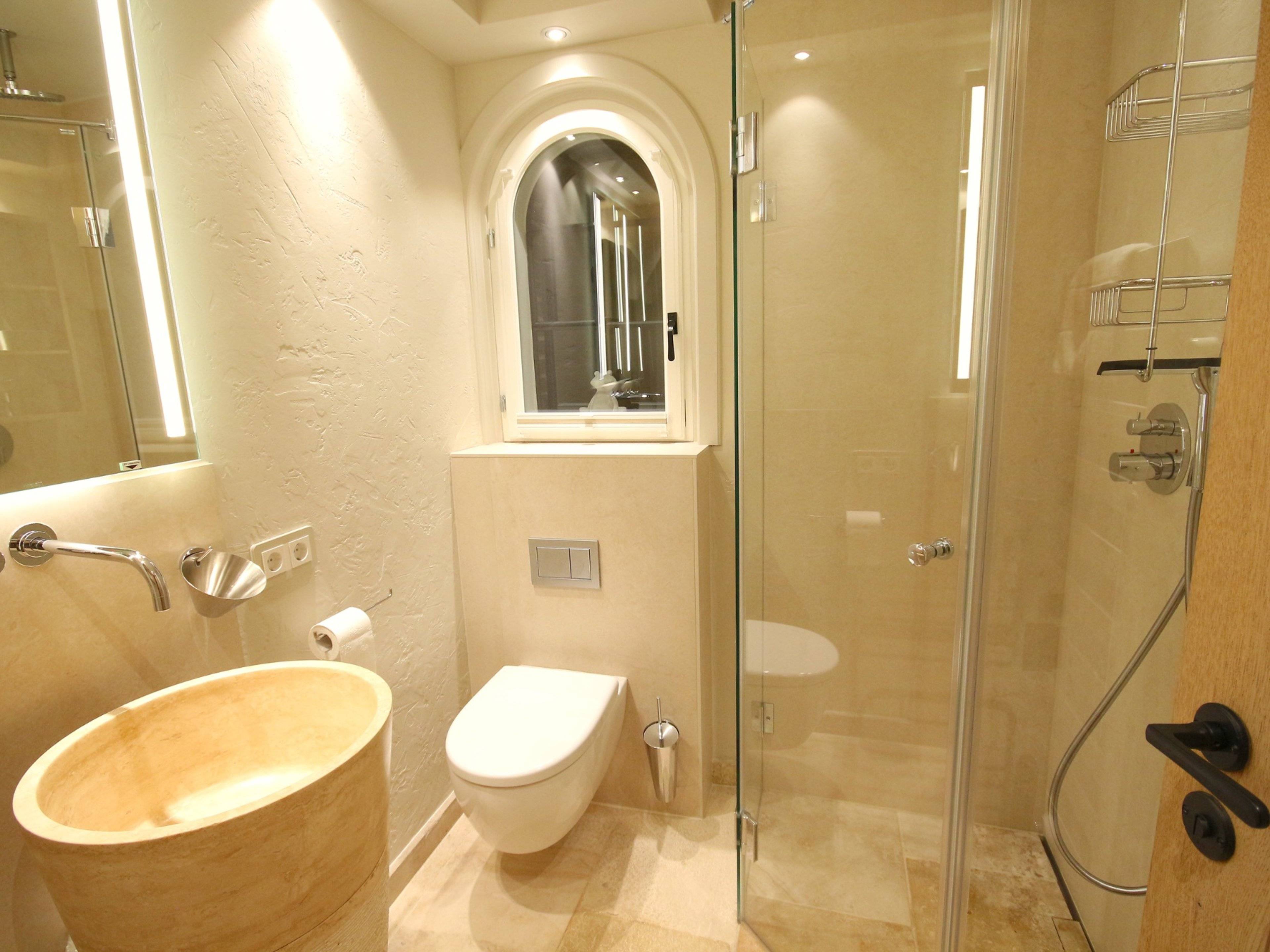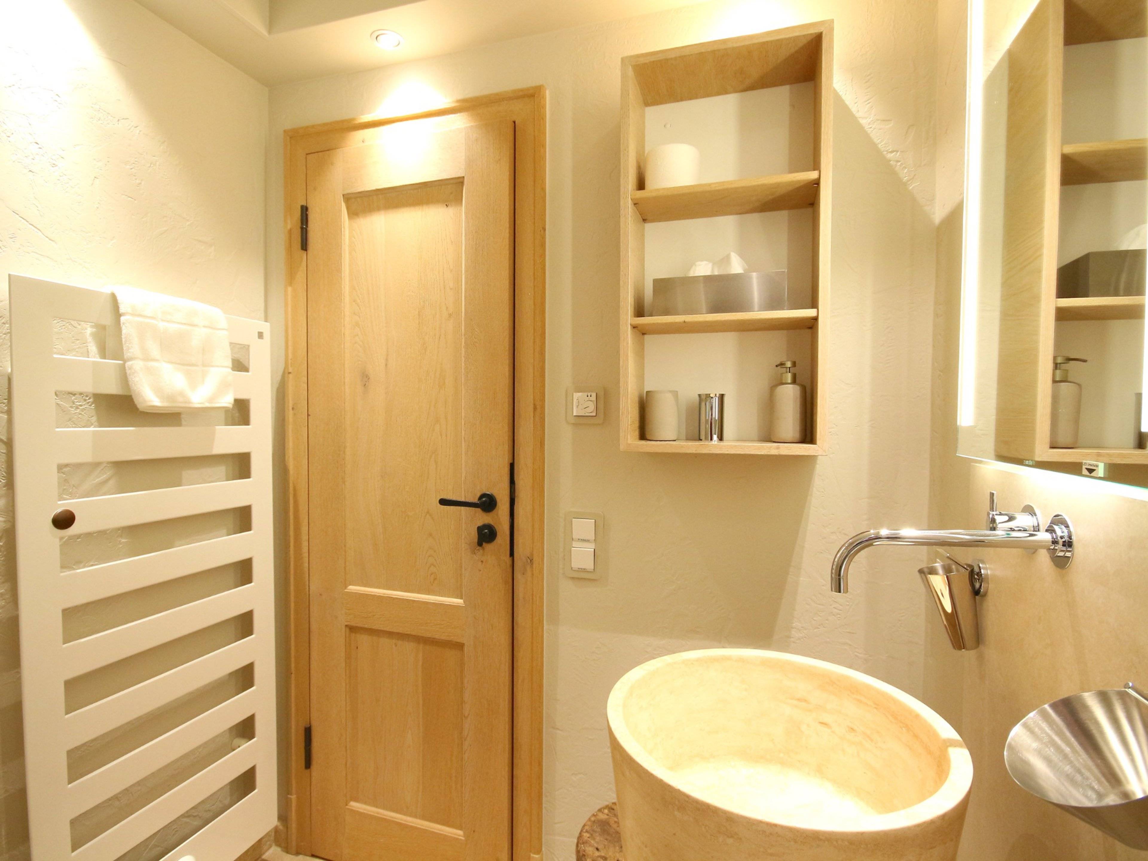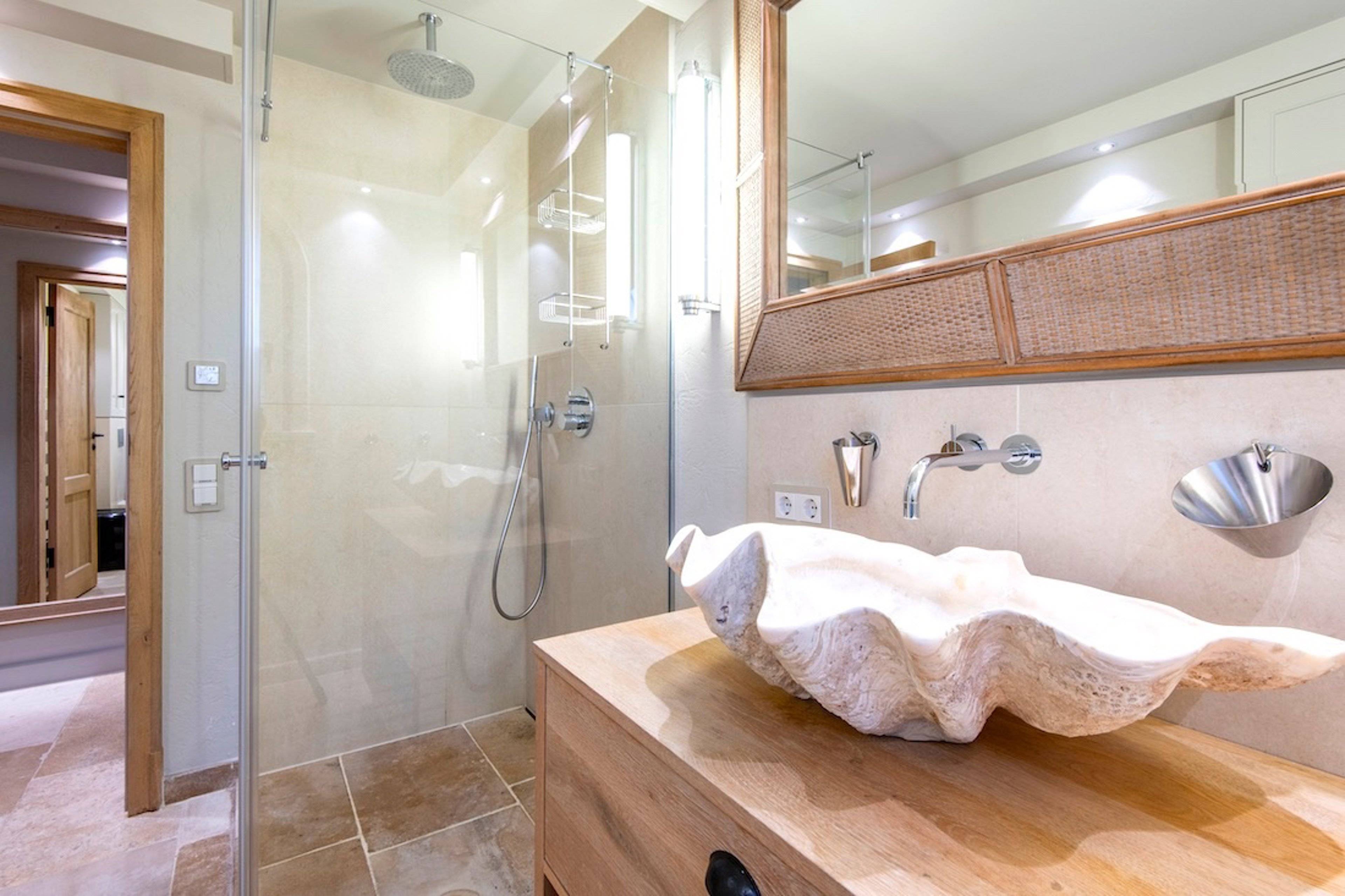 Alle Türen und die Küchenfronten wurden aus ca. 800 Jahre altem Eichenholz maßgefertigt. Der Fußboden ist mit dem Naturstein Old Camaargue Limestone aus Spanien verlegt und mit einer Fußbodenheizung versehen. Ein absoluter Eyecatcher ist in einem der beiden Badezimmer die Waschschale aus einer über 1.600 Jahre alten Riesenmuschel.
