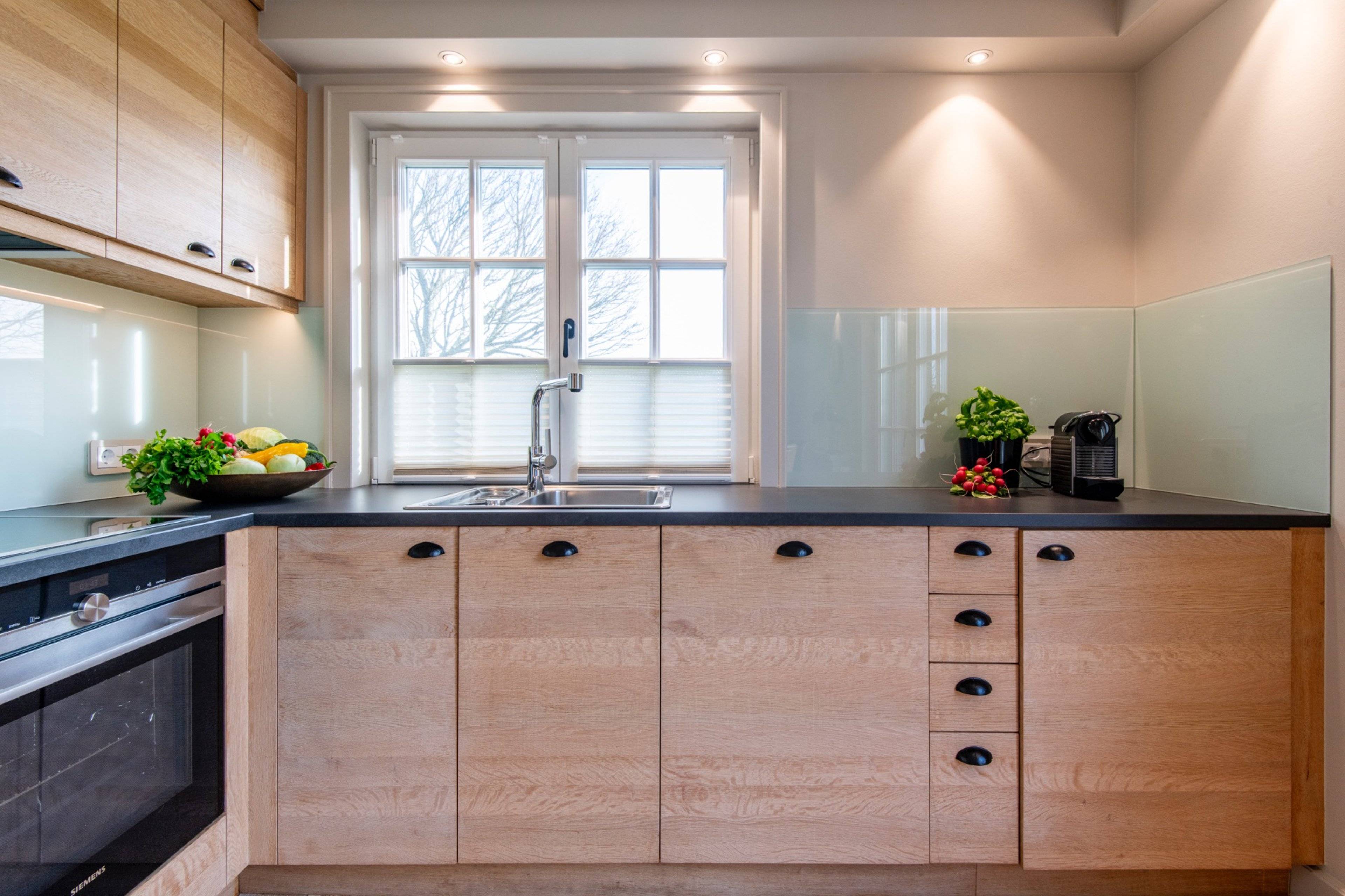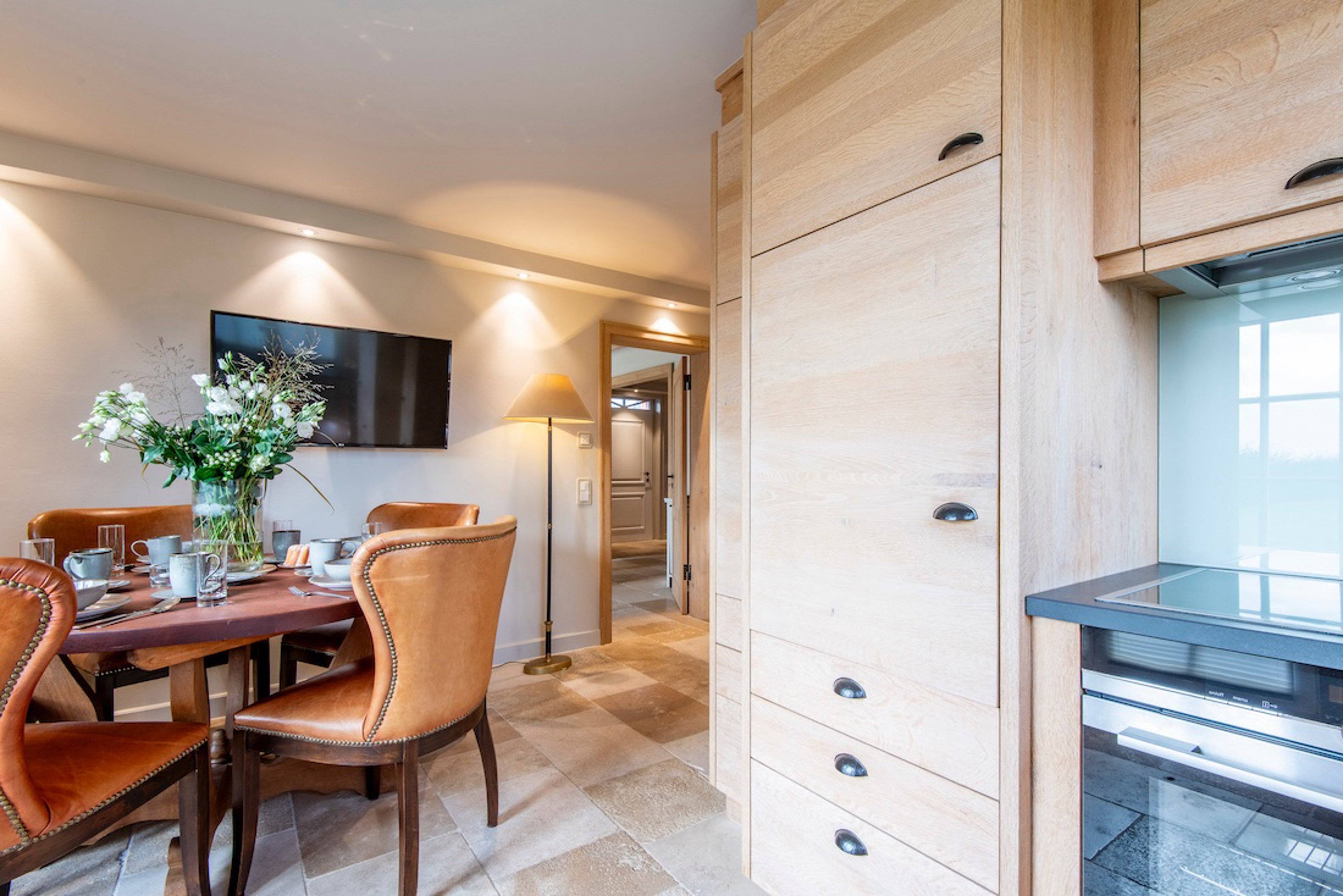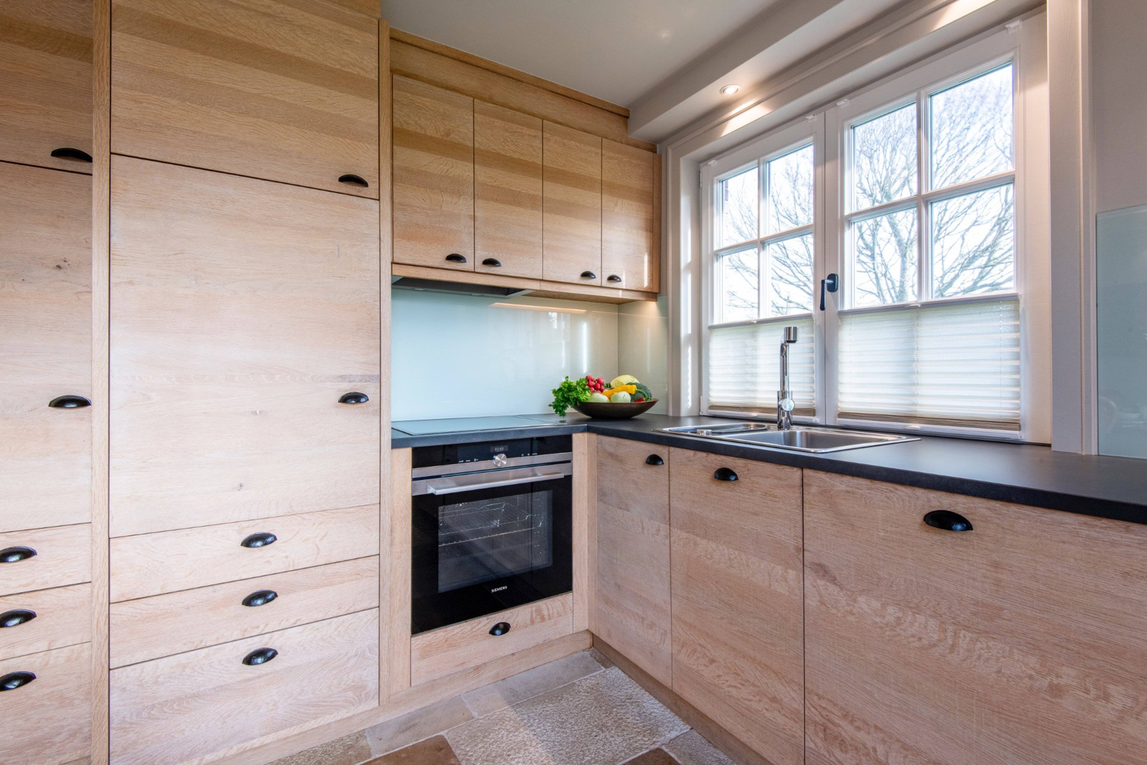 Alle Türen und die Küchenfronten wurden aus ca. 800 Jahre altem Eichenholz maßgefertigt. Der Fußboden ist mit dem Naturstein Old Camaargue Limestone aus Spanien verlegt und mit einer Fußbodenheizung versehen. Ein absoluter Eyecatcher ist in einem der beiden Badezimmer die Waschschale aus einer über 1.600 Jahre alten Riesenmuschel.