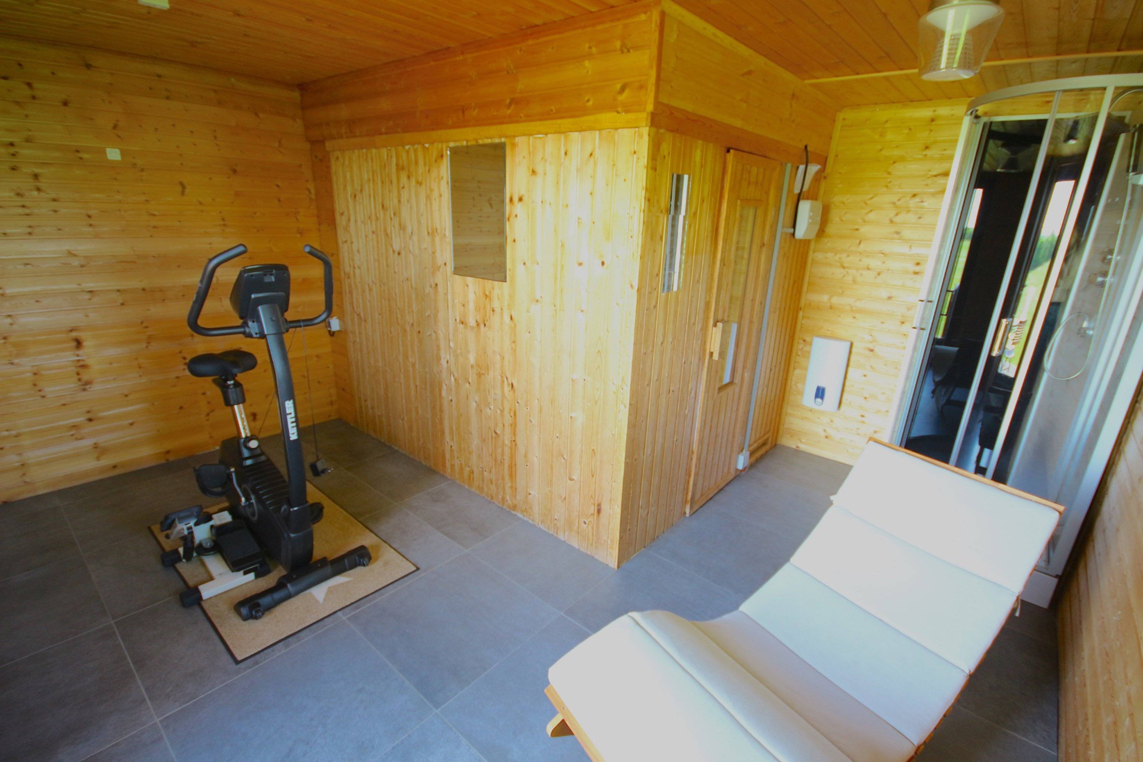 Nicht nur in der kühleren Jahreszeit ist das separate Saunahaus eine Wohlfühloase, in dem Fitnessgeräte genutzt werden möchten. Eine eigene, teils überdachte Terrasse mit Gartenmöbel ist grandios, um zwischendrin den Blick über die Felder schweifen zu lassen und zu entspannen.