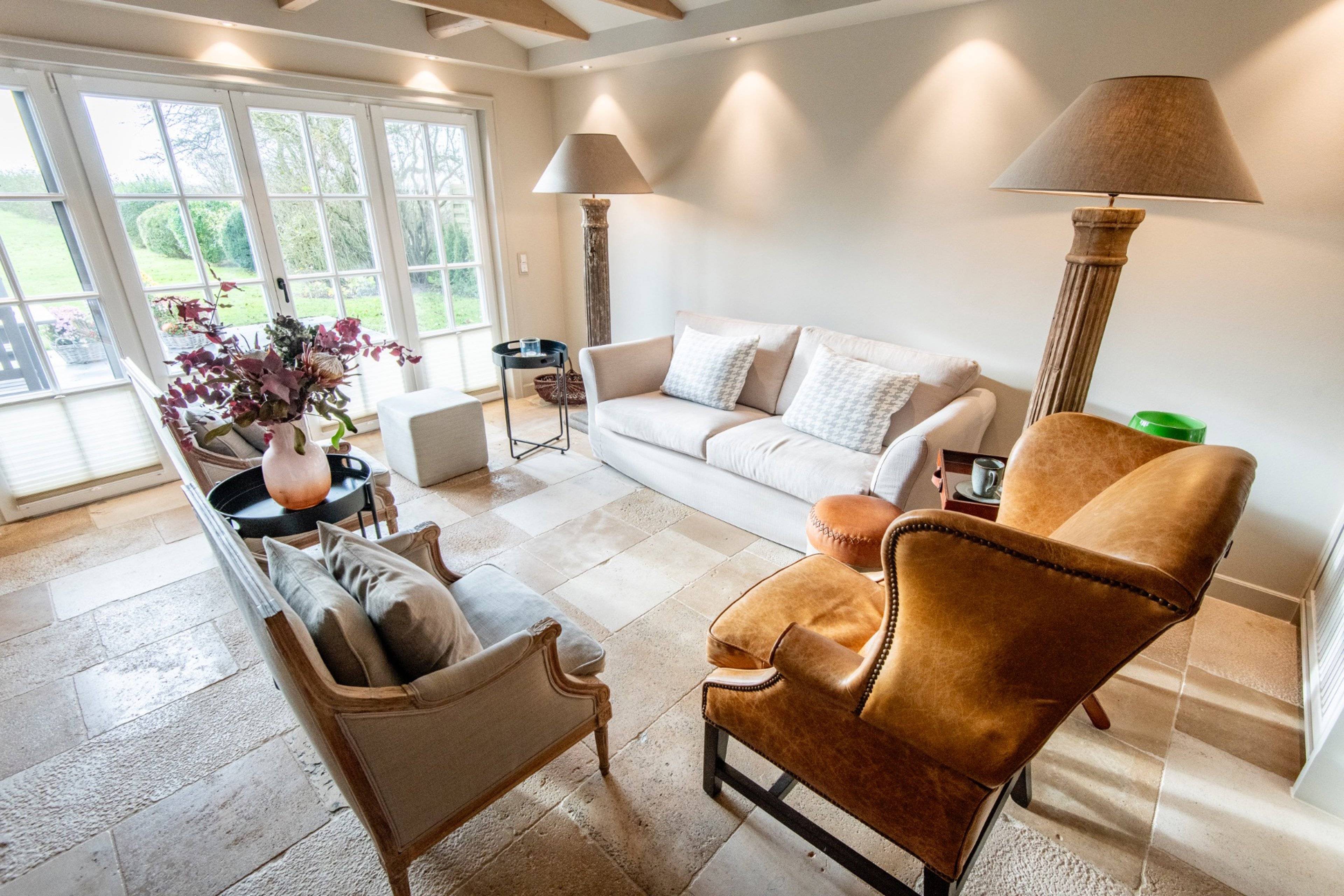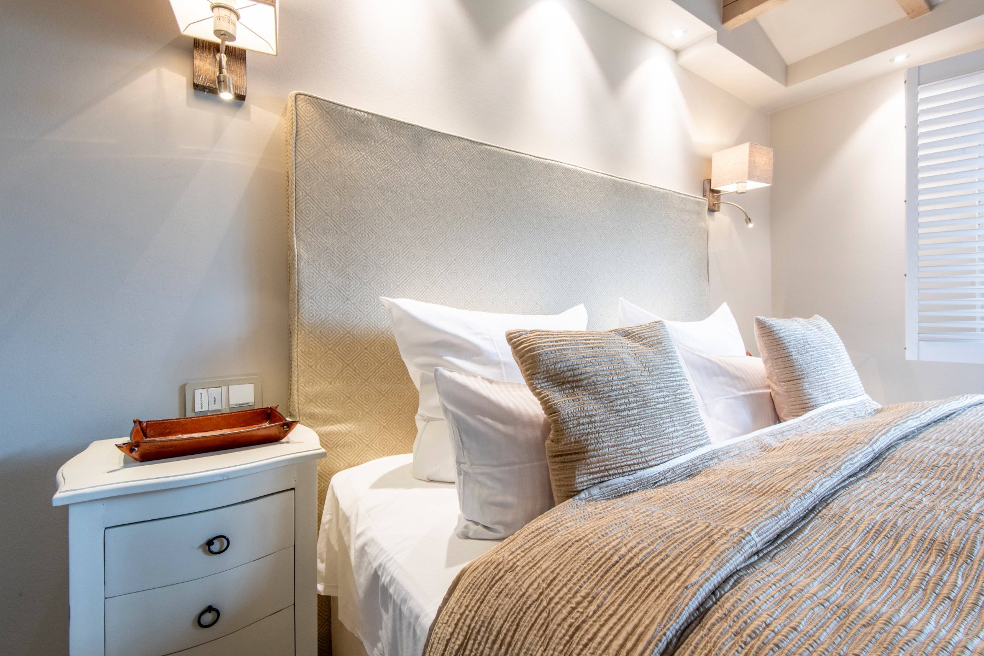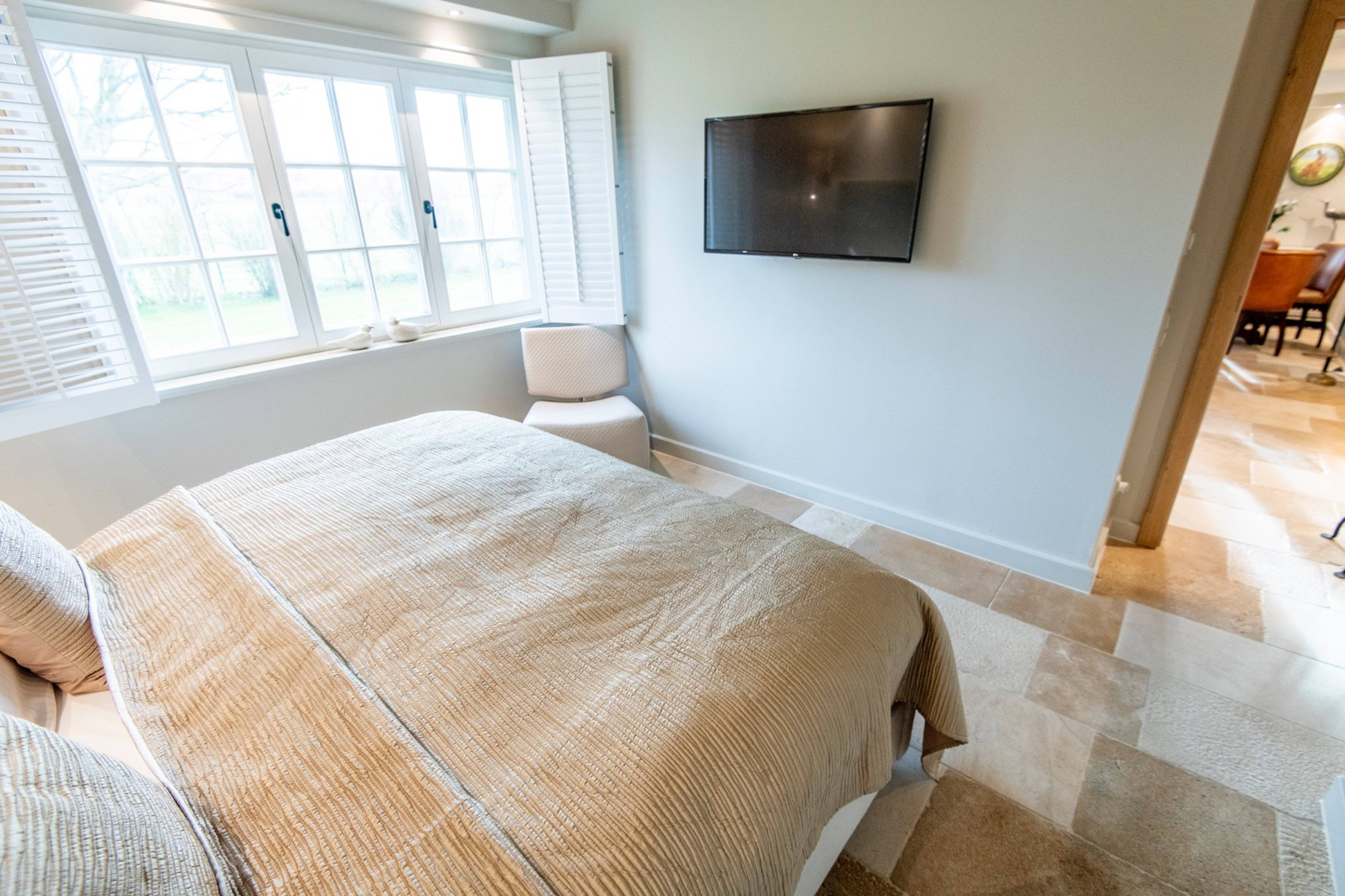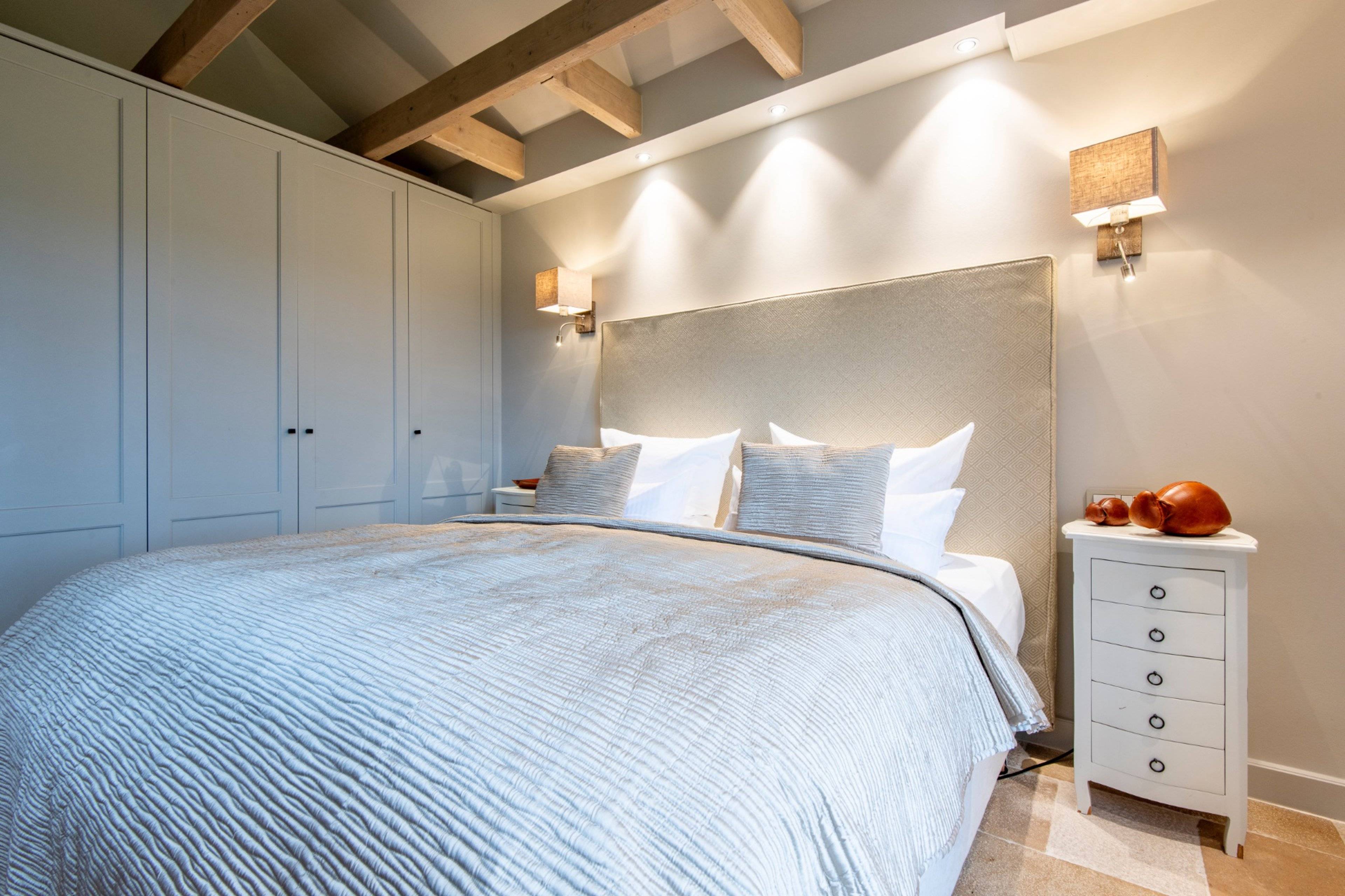 Im Schlafzimmer befindet sich ein elektrisch verstellbares Doppelbett von Treca Interiors Paris, welches zum Träumen verführt. Der Blick aus dem Bett führt entlang an den freigelegten Dachstreben, bis hin in die Dachspitze. Darüber hinaus gibt es in einem separaten Zimmer ein Ruf Day Bett und ein Schlafsofa, so dass bis zu fünf Personen den Urlaub in diesem exklusiven Landhaus genießen können. Außergewöhnlich sind auch die beiden Bäder, wie beispielsweise eine überdurchschnittlich große, ca. 1.600 Jahre alte Muschel, die als Waschschale dient.