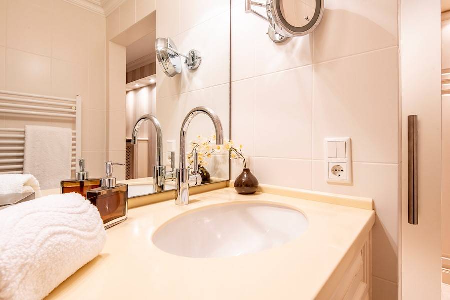 Dank der angenehmen Raumtemperaturen und einem höchst komfortablen Doppelbett, ist ein tiefer und ergiebiger Schlaf in dem hochwertigen Bett garantiert. Wählen Sie aus den zahlreichen Kissen verschiedener Größen, die Ihnen hierzu zur Auswahl liegen. Eine senkrecht gestreifte Tapete unterstreicht den gehobenen Standard in diesem exklusiven Appartement.