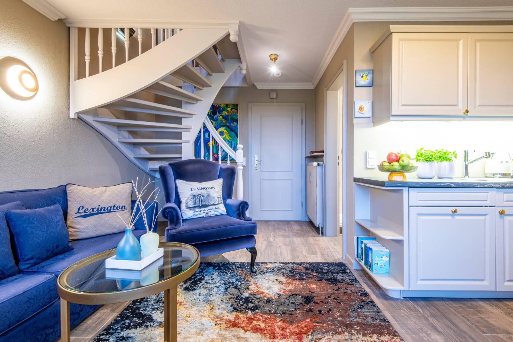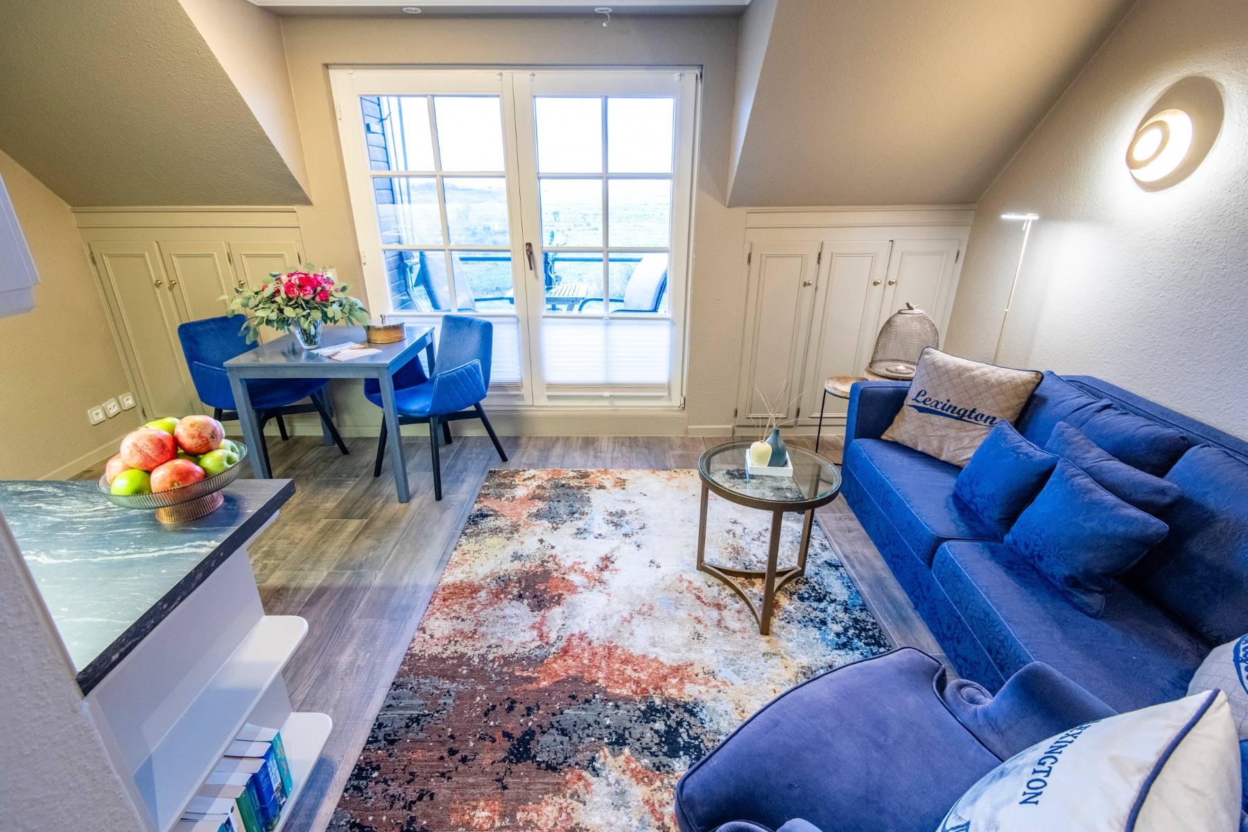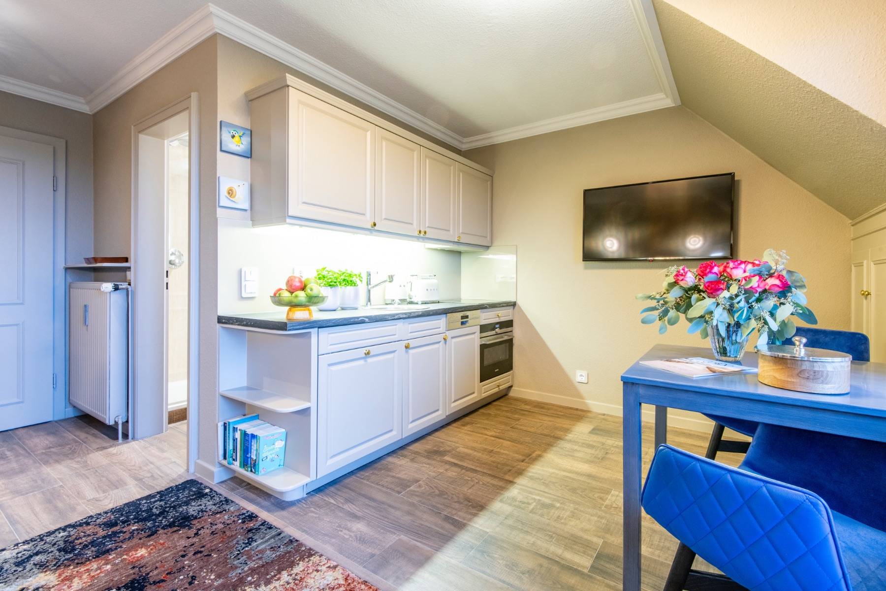 Bequeme Polstermöbel, moderne Malerei der Künstlerin Dümke, schöne, sylter Holzeinbauten, eine Landhausküchenzeile und ein modernes Duschbad Eine charmante Dach-Loggia mit sympathischem Balkon, auf dem Sie in Gartenmöbeln einen direkten Blick auf die Salzwiesen genießen, komplettieren dieses exklusive Quartier.