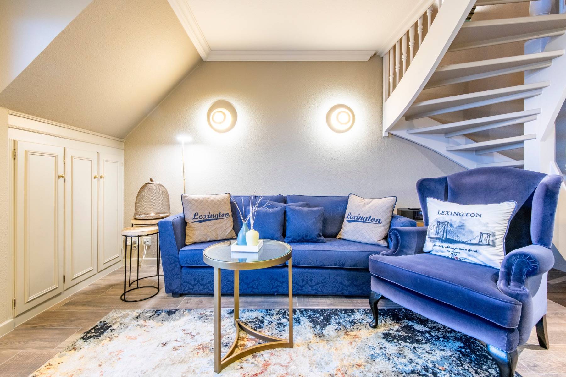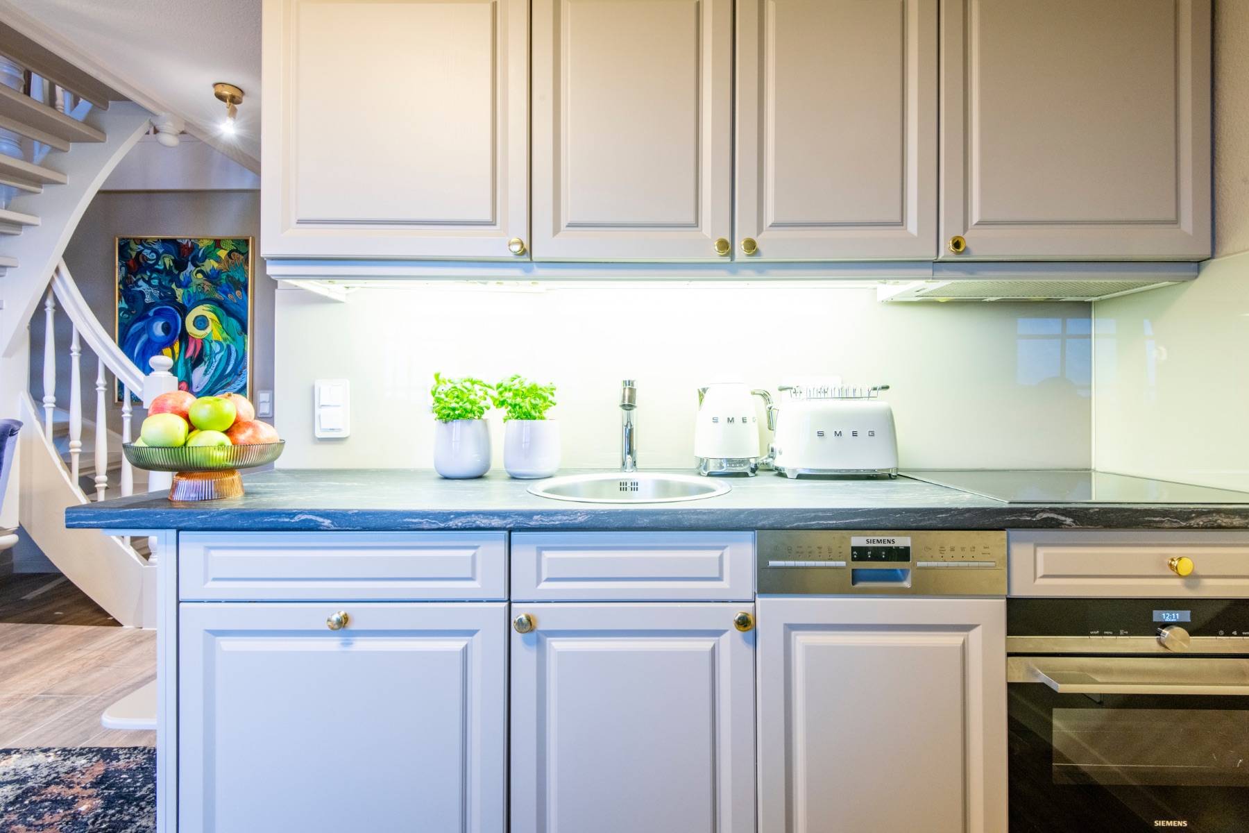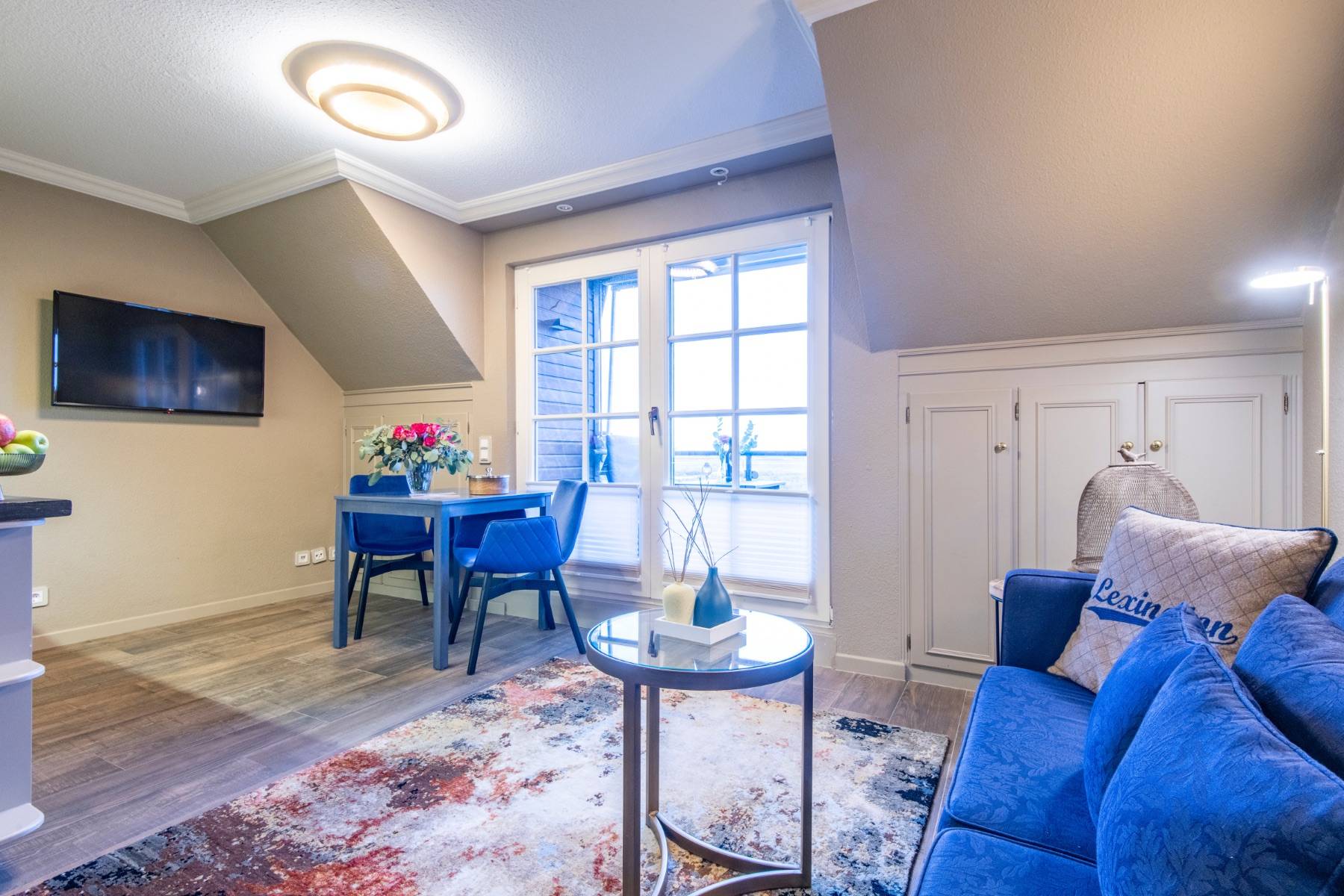 Bequeme Polstermöbel, moderne Malerei der Künstlerin Dümke, schöne, sylter Holzeinbauten, eine Landhausküchenzeile und ein modernes Duschbad Eine charmante Dach-Loggia mit sympathischem Balkon, auf dem Sie in Gartenmöbeln einen direkten Blick auf die Salzwiesen genießen, komplettieren dieses exklusive Quartier.