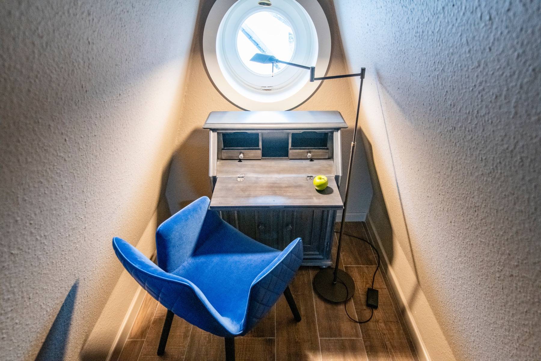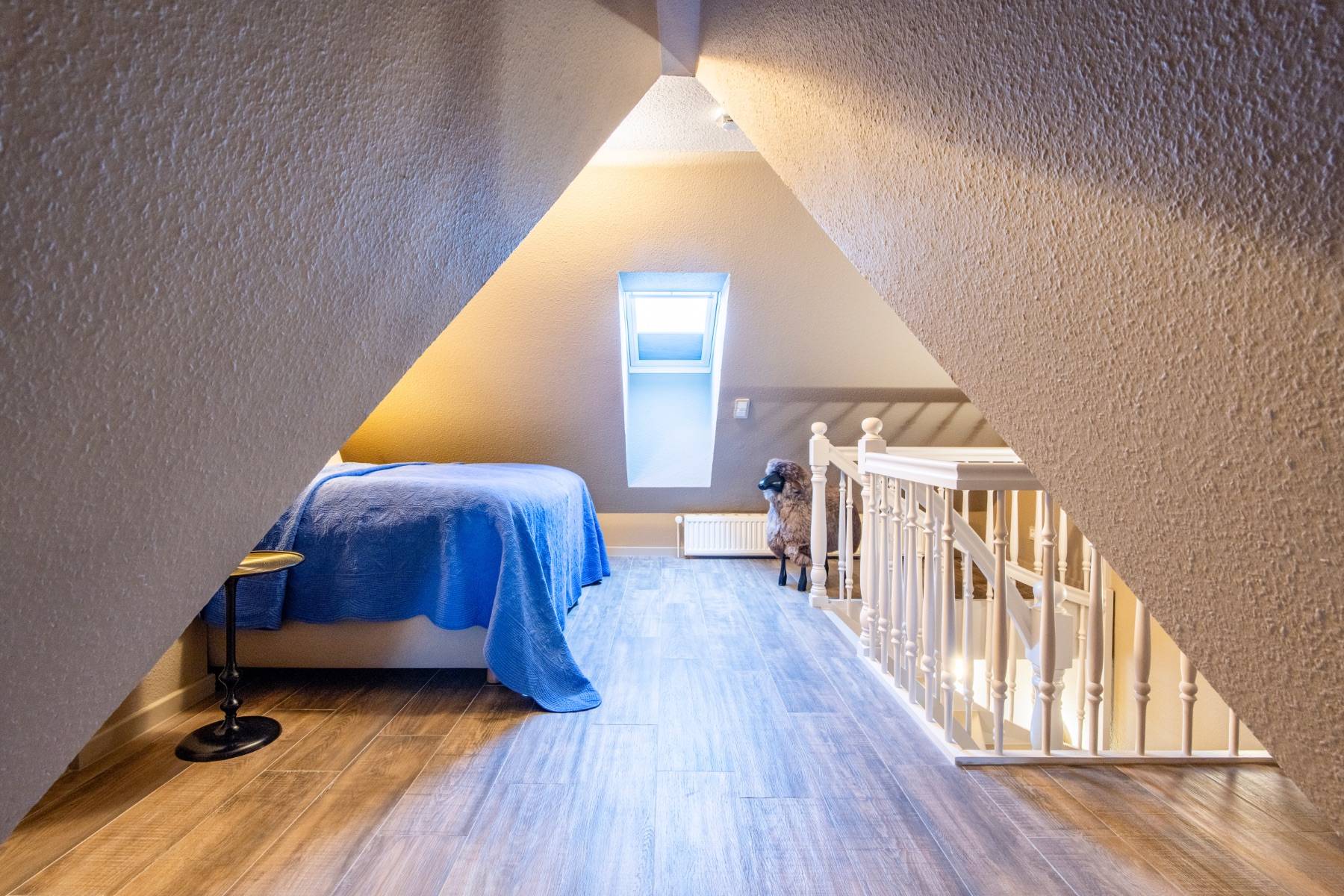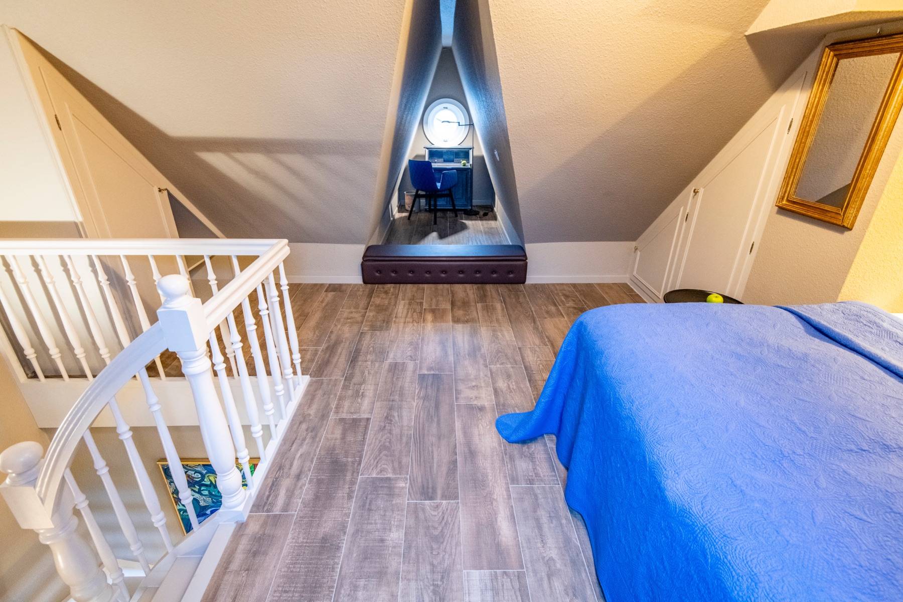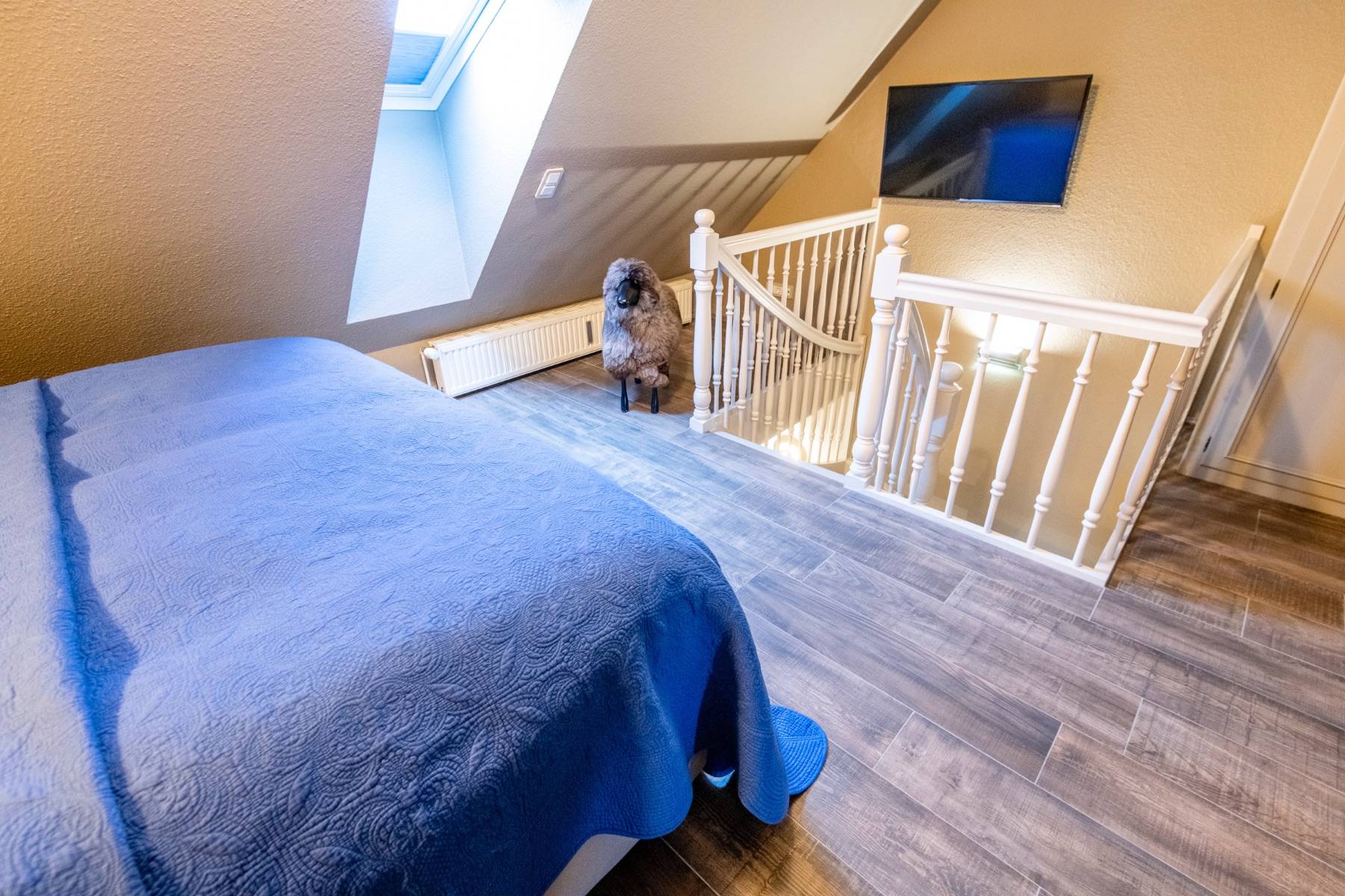 Viel Charme und noch mehr Aussicht: Ein himmlisches Schlafzimmer auf der Galerie mit französischen Polsterbetten und direktem Blick auf das Wattenmeer sind die Höhepunkte unserer Wohnung Heefwaihus 2 in Morsum, die zwei Menschen genügend Platz für einen entspannten Sylt-Urlaub bietet.