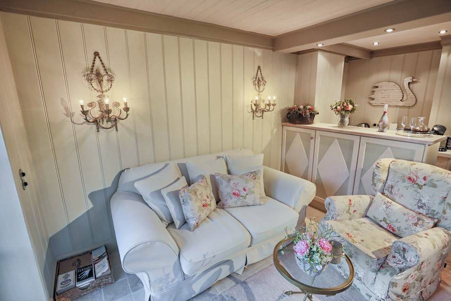 Lassen Sie sich unter der Regendusche berieseln und blicken dabei in den beleuchteten Sternenhimmel. Eine gelungene Kombination aus nostalgischen Armaturen und moderner Einrichtung bietet den verdienten Luxus, ohne auf den Komfort zu verzichten. Dabei wird sogar der chromfarbene Handtuchheizkörper zum Kunstobjekt.