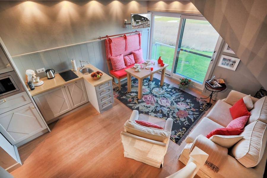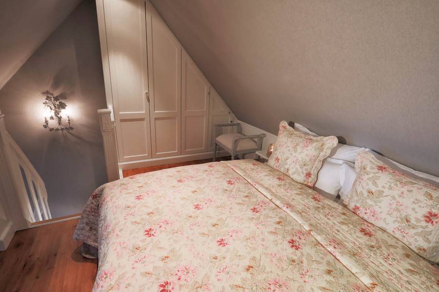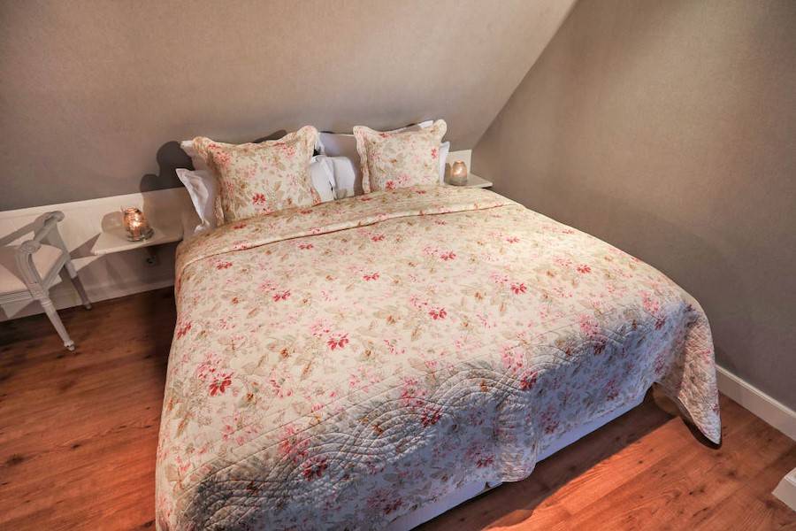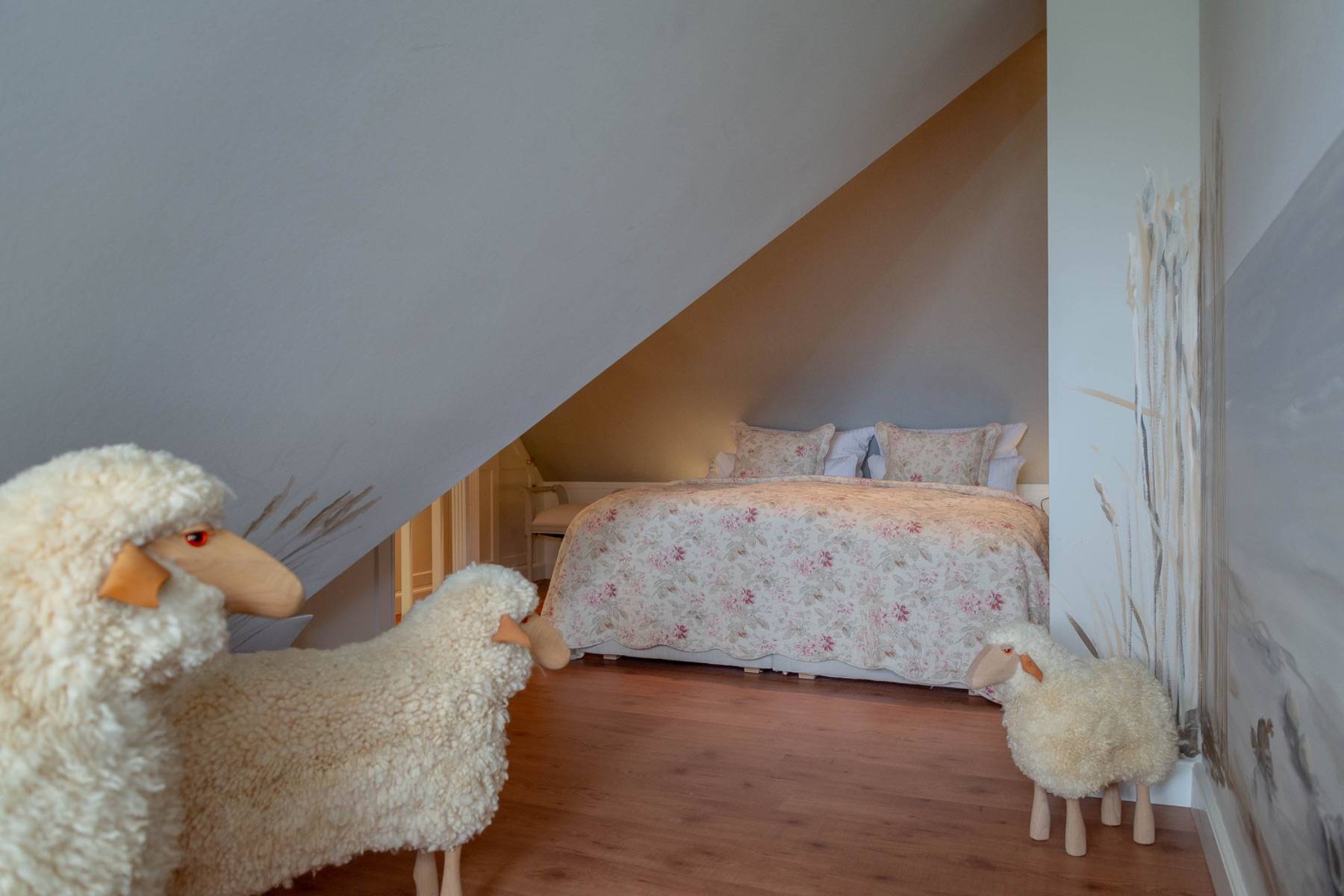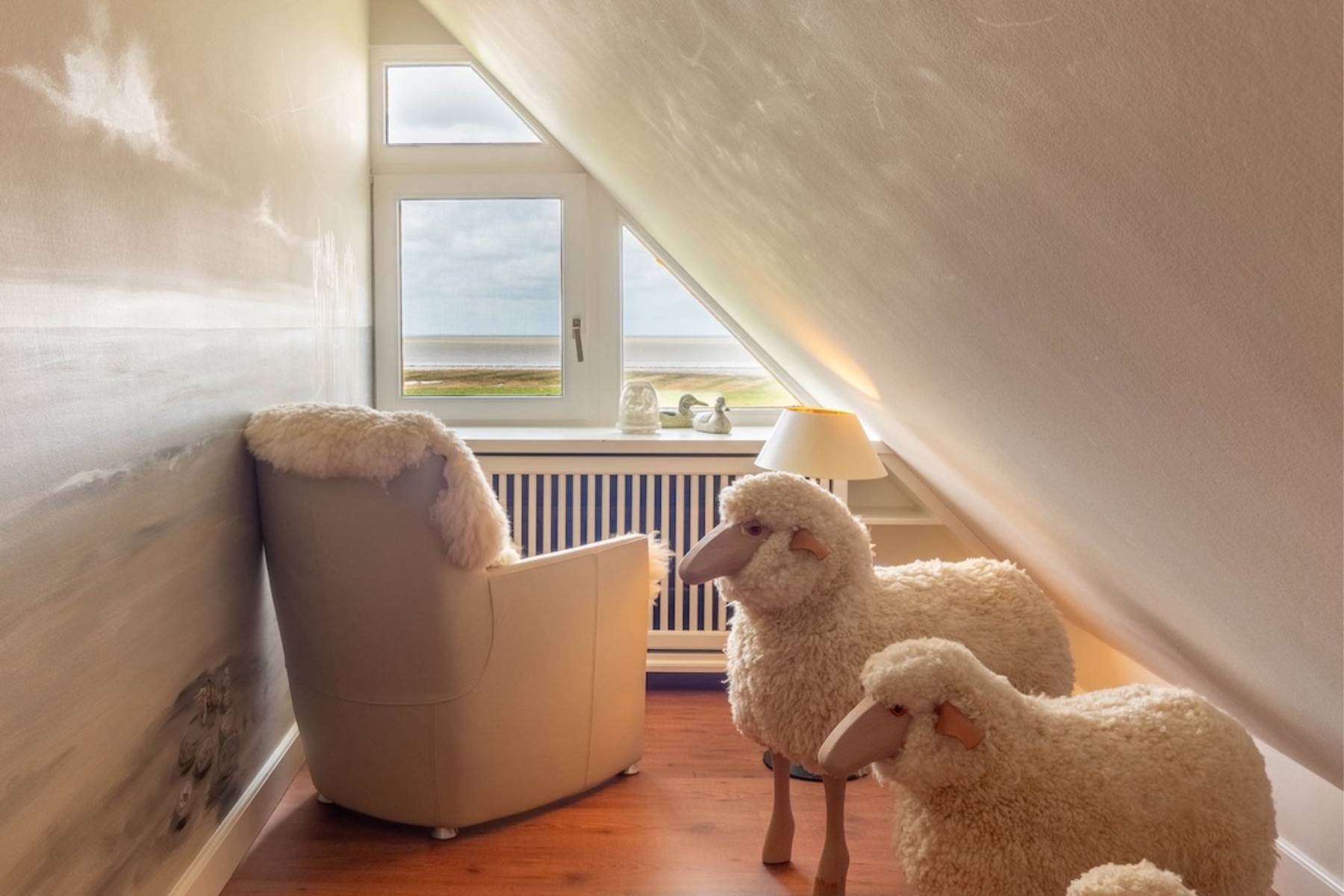 Ein großes Doppelbett, sowie ein Kleiderschrank sind im Dachgeschoss platziert. Zum Abschalten ist ein Polsterstuhl neben einer Schafsherde und direktem, traumhaften Blick auf das Wattenmeer vorhanden.