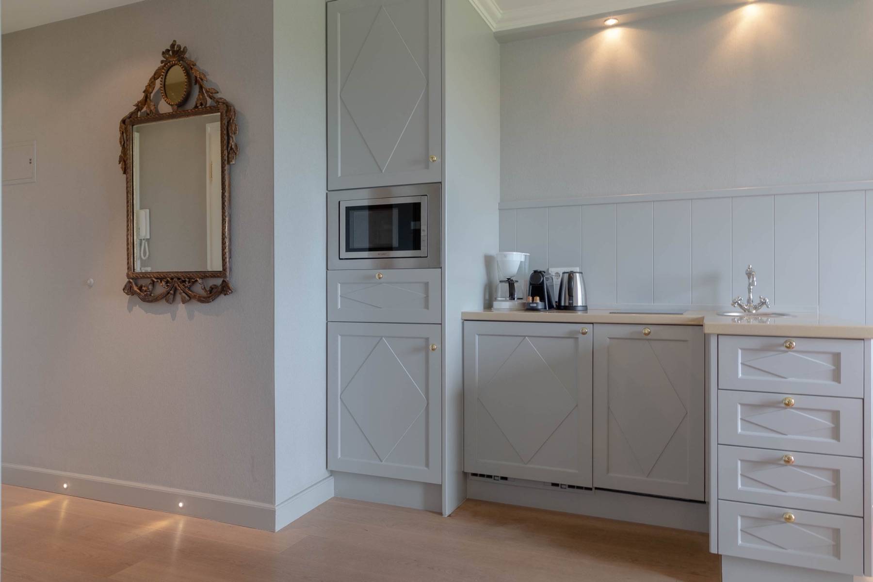 Ein kleines, jedoch sehr feines Badezimmer ist mit einer Dusche und einem goldenen Handtuchheizkörper versehen, der die Badetücher flauschig warm hält.