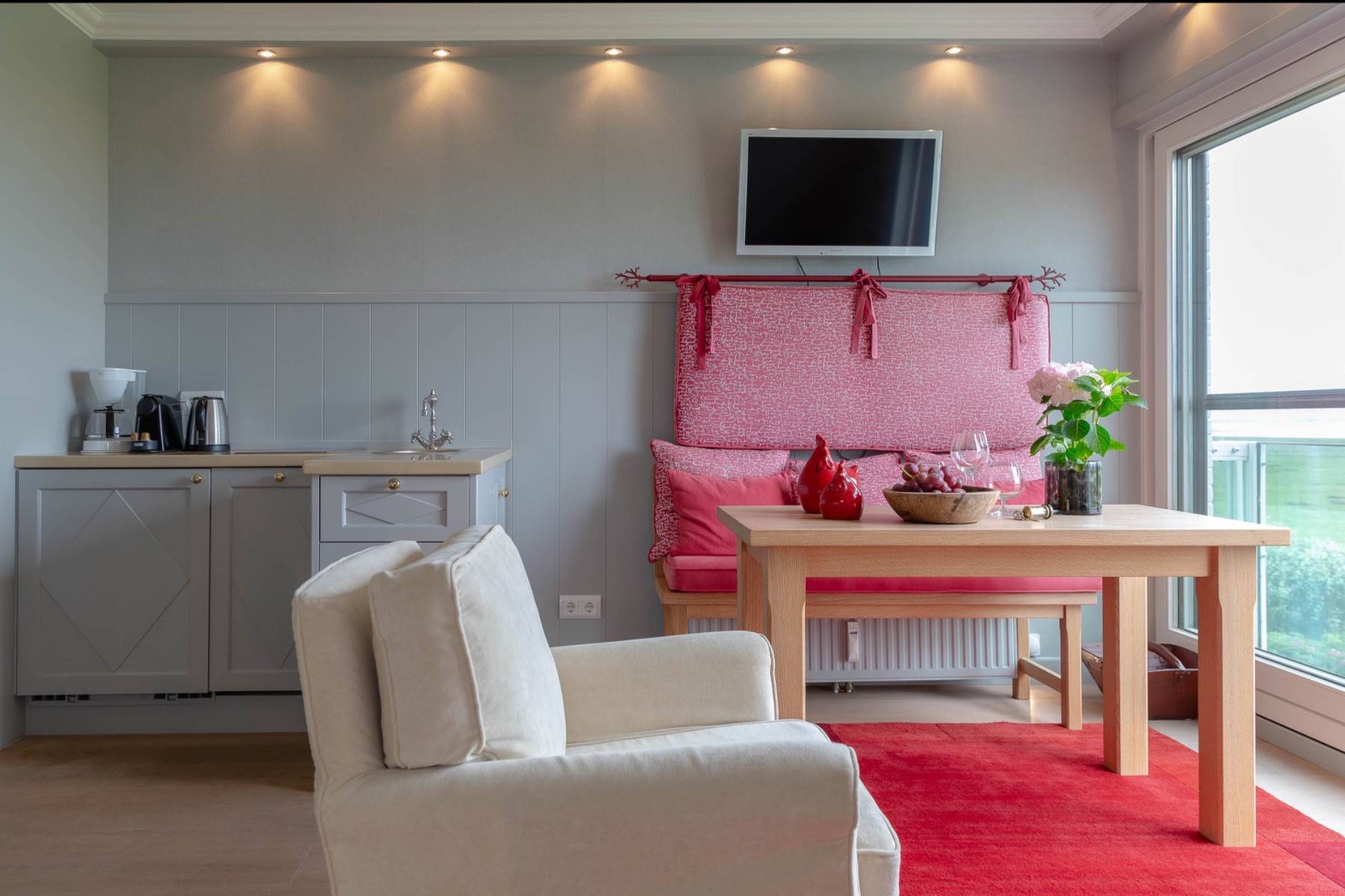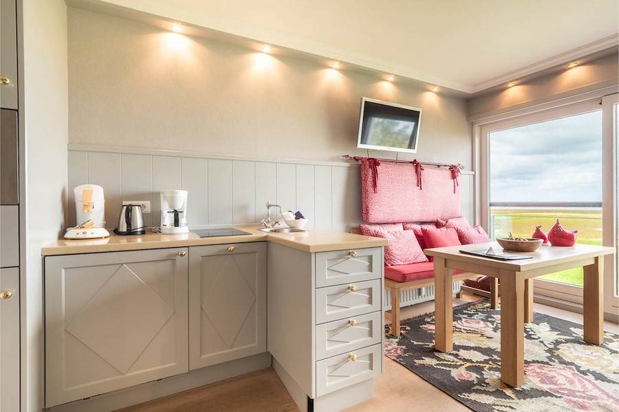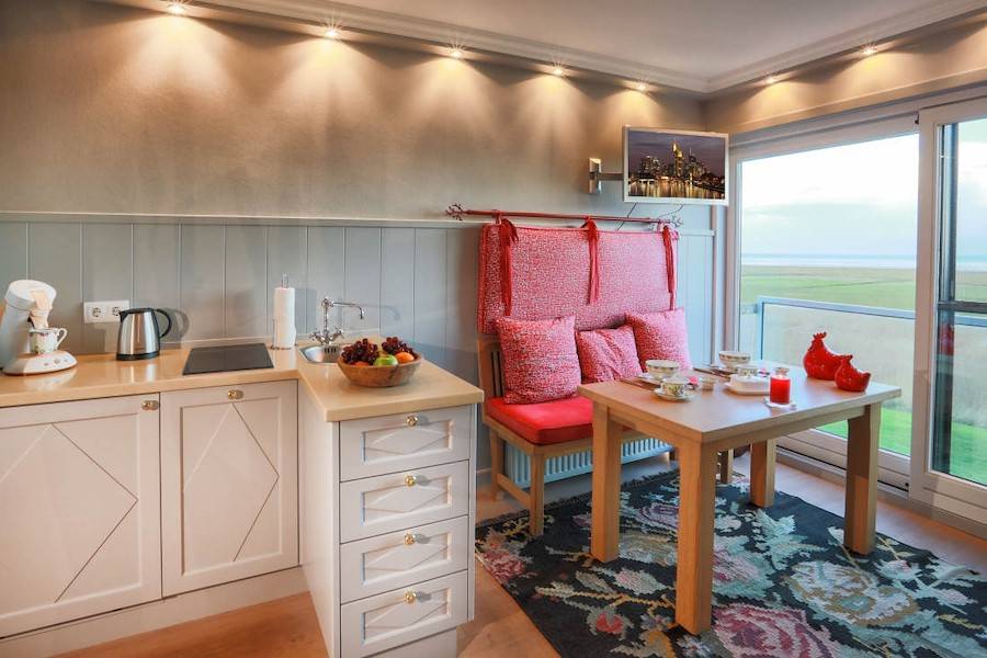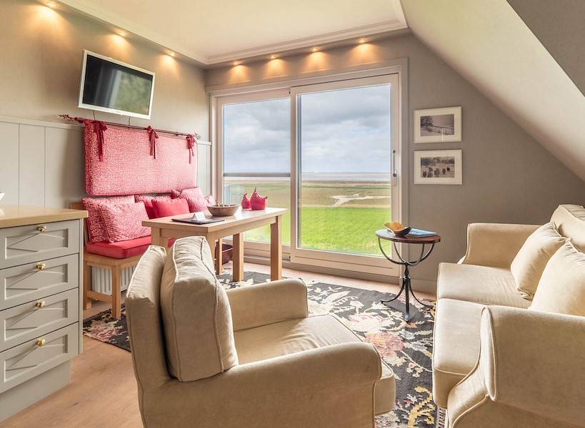 2014 wurde das Maisonetteappartement umfassend renoviert und besticht durch helle, sanfte Farben. Die Ferienwohnung Wattblick vermittelt einen gemütlichen Eindruck mit einem außergewöhnlichen Wohlfühlcharakter. Der Wohn- und Essbereich ist unmittelbar vor einem bodentiefen Fensterelement platziert und führt den Blick unweigerlich über die Weiten des Wattenmeeres. Der Blick auf das Wattenmeer und in die Weite ist einfach unbeschreiblich.