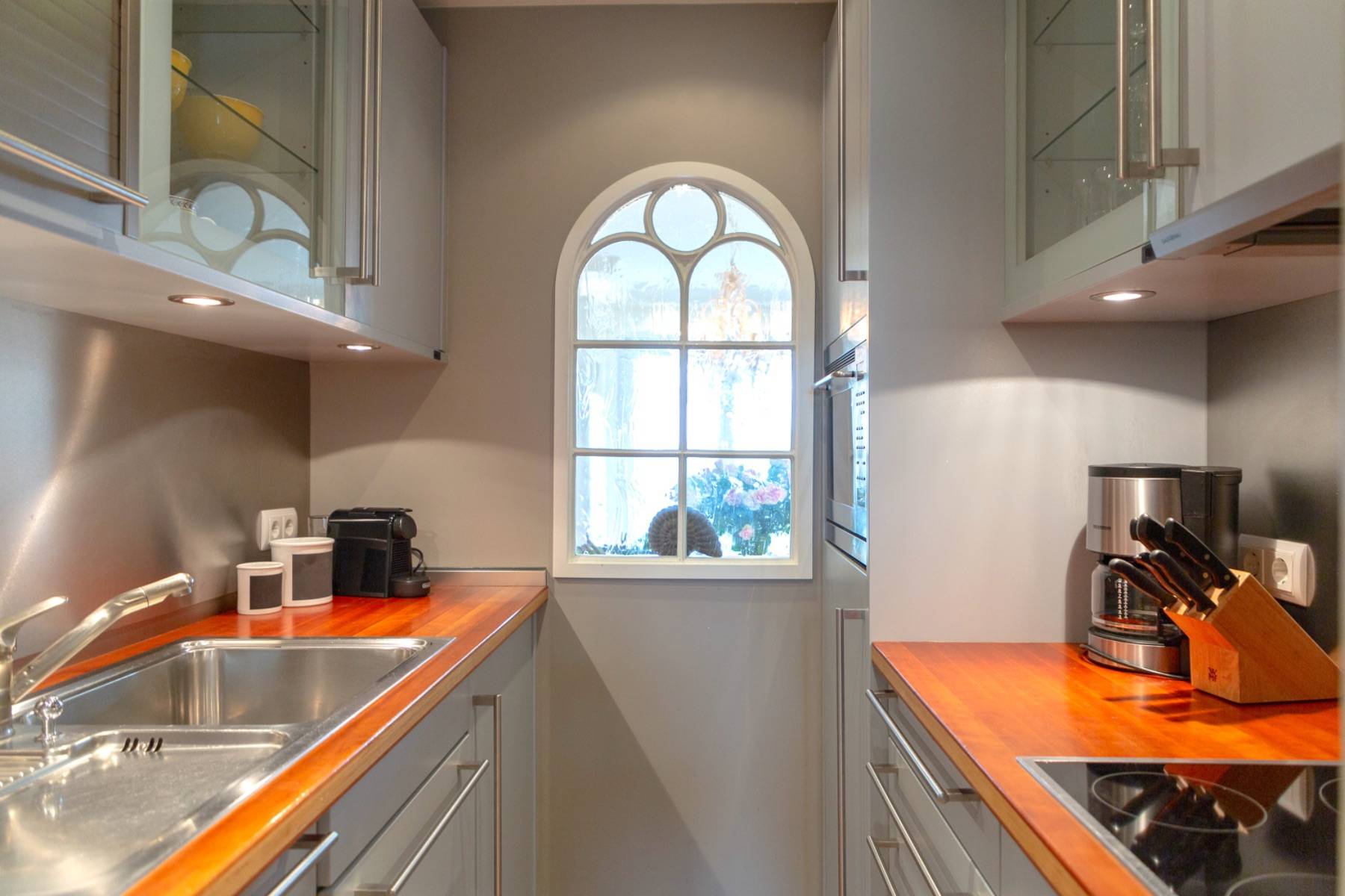 Ein ganz besonderer Eyecatcher ist ein großer, weißer Mylin- Kaminofen neben dem Sofa, der insbesondere in der kühleren Jahreszeit ausreichend Wärme spendet. Da lässt sich das Frühstück oder das Abendessen auf der gemütlichen Sitzecke gut und gerne ausdehnen und genießen. In der separaten Bulthaup- Küche mit Miele- Cerankochfeld kommt beim Zubereiten der Speisen garantiert Freude auf. Eine Mikrowelle mit Backofenfunktion, sowie ein Geschirrspüler stehen als Küchenhelfer zur Verfügung. Kaum ein anderes Feriendomizil bietet einen derartigen Luxus mit führenden Luxusherstellern. Es sind eben die kleinen Details, die den Unterschied ausmachen.