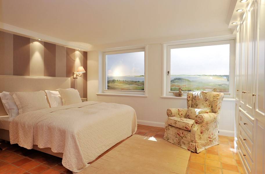 Der Boden im Erdgeschoß ist mit Terracottafliesen in Antikoptik und einem edlen Teppich versehen. Die Wände sind mit einer farbigen Stofftapete angelegt, die Wärme versprüht und das stilvolle und gemütliche Ambiente untermauert. Die bodentiefen Fensterelemente zur Terrasse und die zahlreichen, an der Wand entlang integrierten dimmbaren Einbauspots verleihen den Raum viel Licht. Das Interieur vereint Moderne, Stil und Gemütlichkeit, deren gelungene Symbiose sich durch das gesamte Feriendomizil zieht.