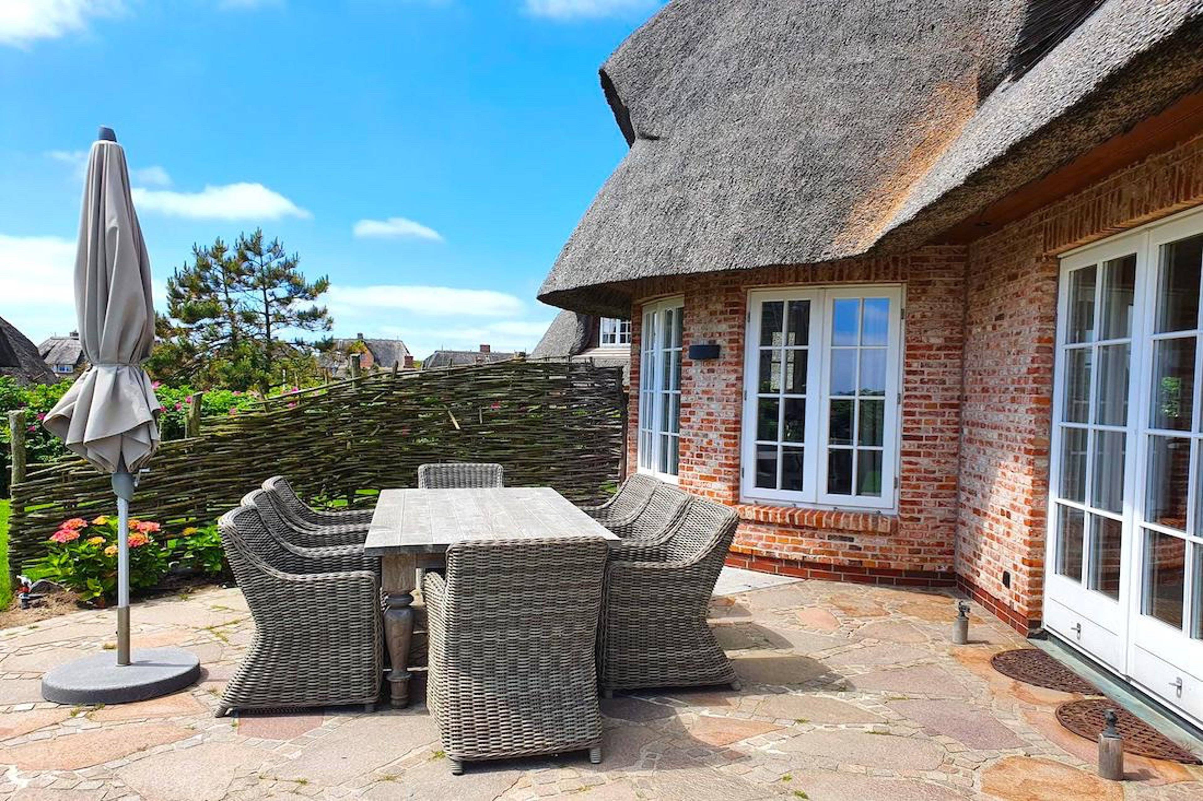 Vom Wohnraum aus gelangen Sie auf die große Terrasse, die dank der erhabenen Lage einen einmaligen Weitblick auf das Wattenmeer ermöglicht. Relaxen Sie auf auf der Sonnenliege und speisen bei schönem Wetter auf der mit Gartenmöbel bestückten Terrasse.