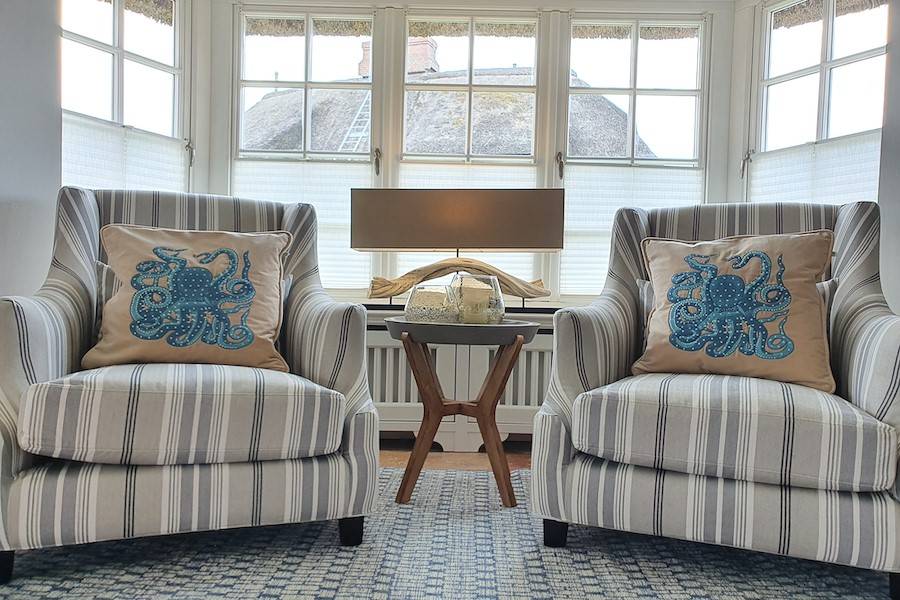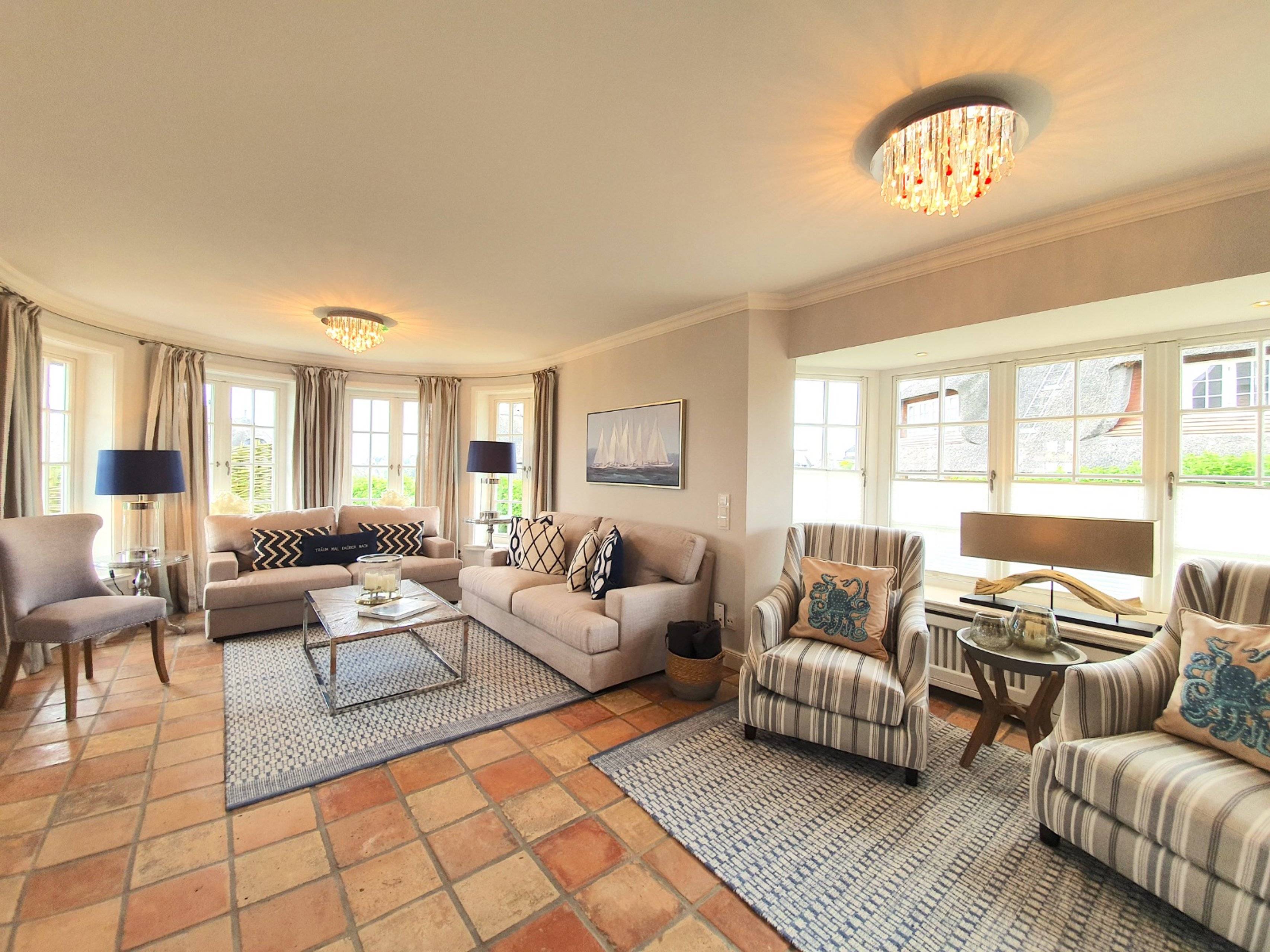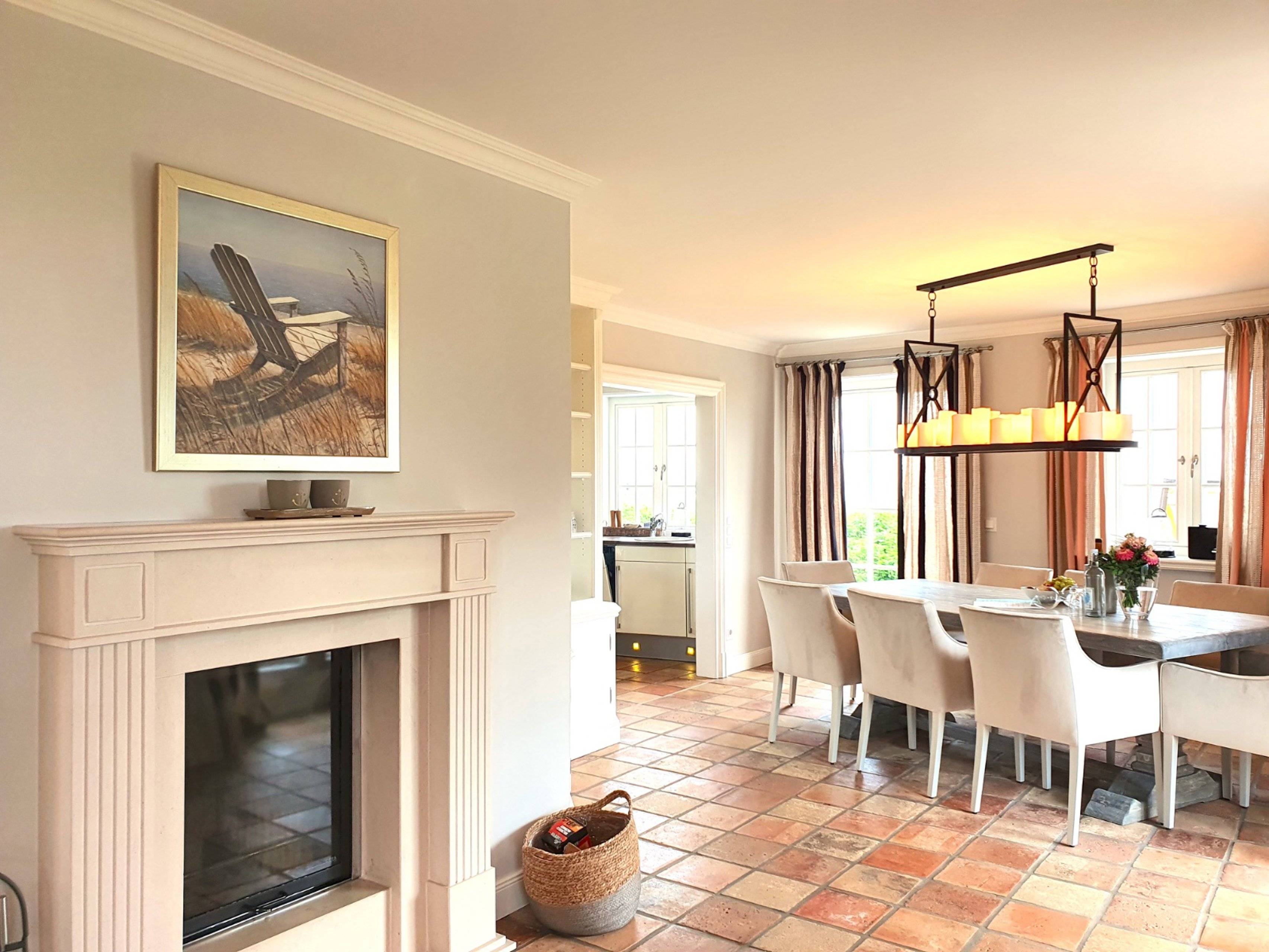 Treten Sie ein in das Luxus Ferienhaus Rantum Royal in Rantum und seinen exklusiven Wohnbereich mit antiken Terracottafliesen und edlen Holzfußböden. Der großzügige Wohnbereich ist geprägt von warmen Farbtönen und einer stil- und geschmackvollen Einrichtung. Die gemütlichen Polstermöbel sind ein idealer Ort für ausgiebige Gespräche mit seinen Liebsten.