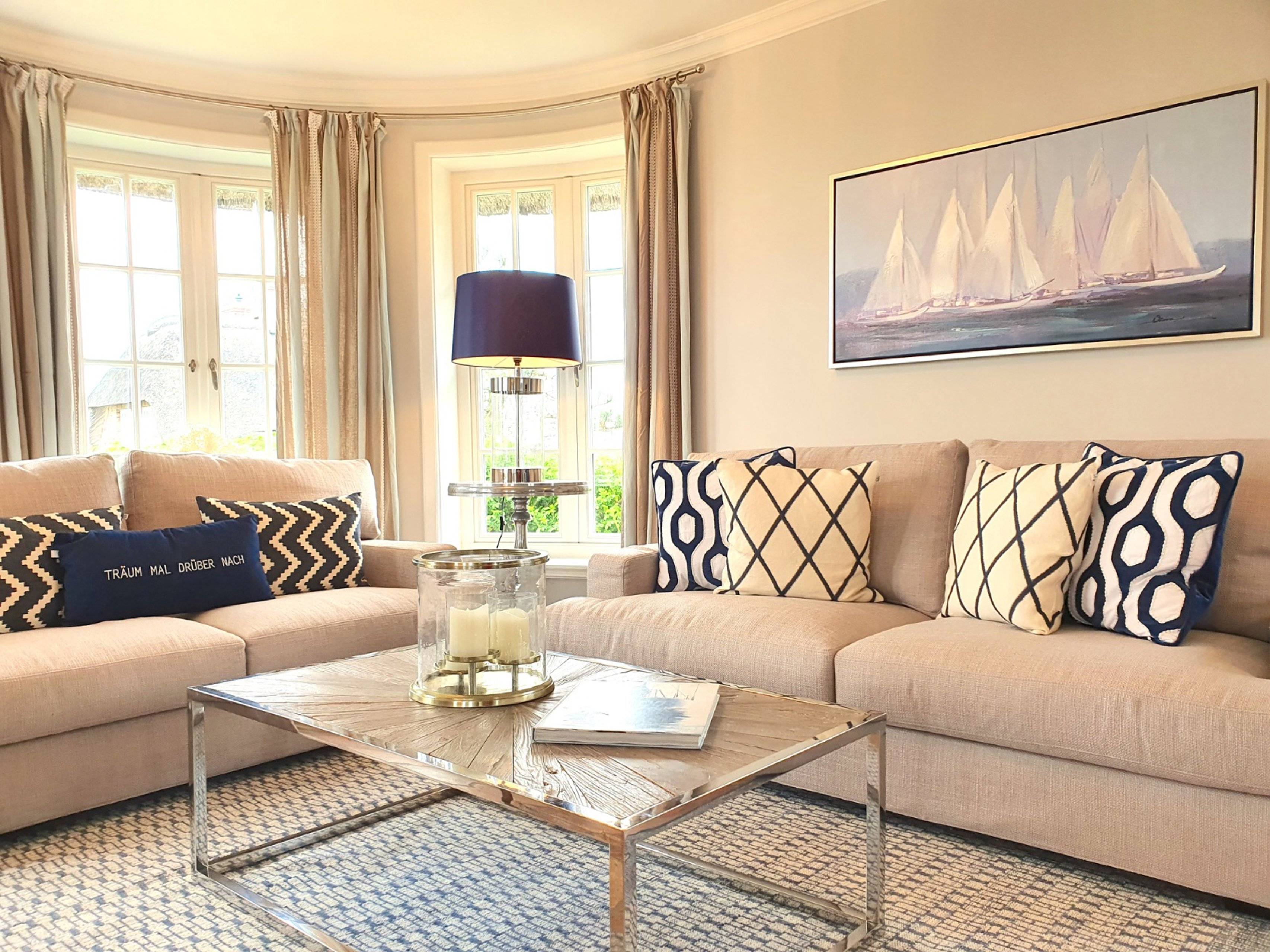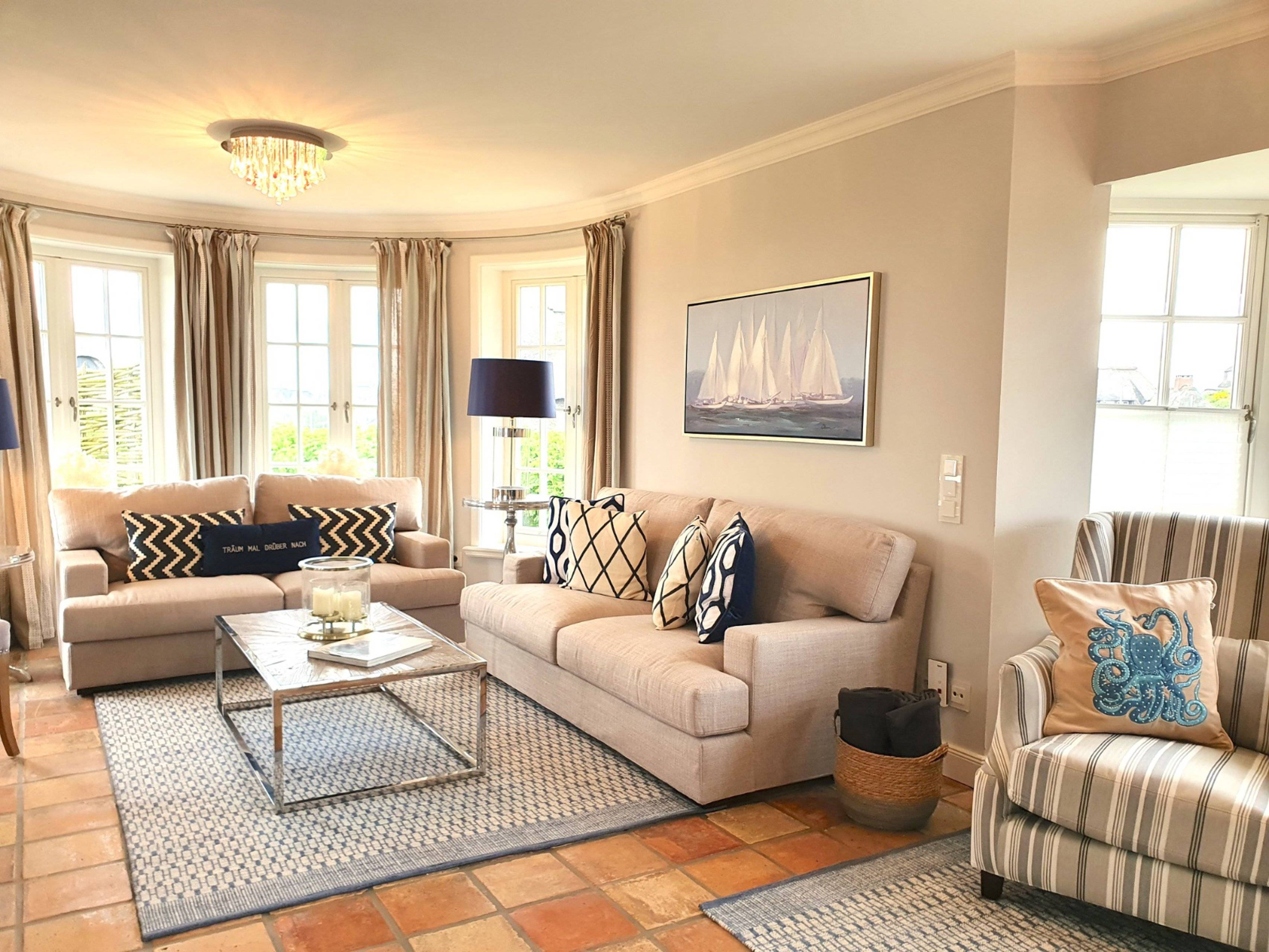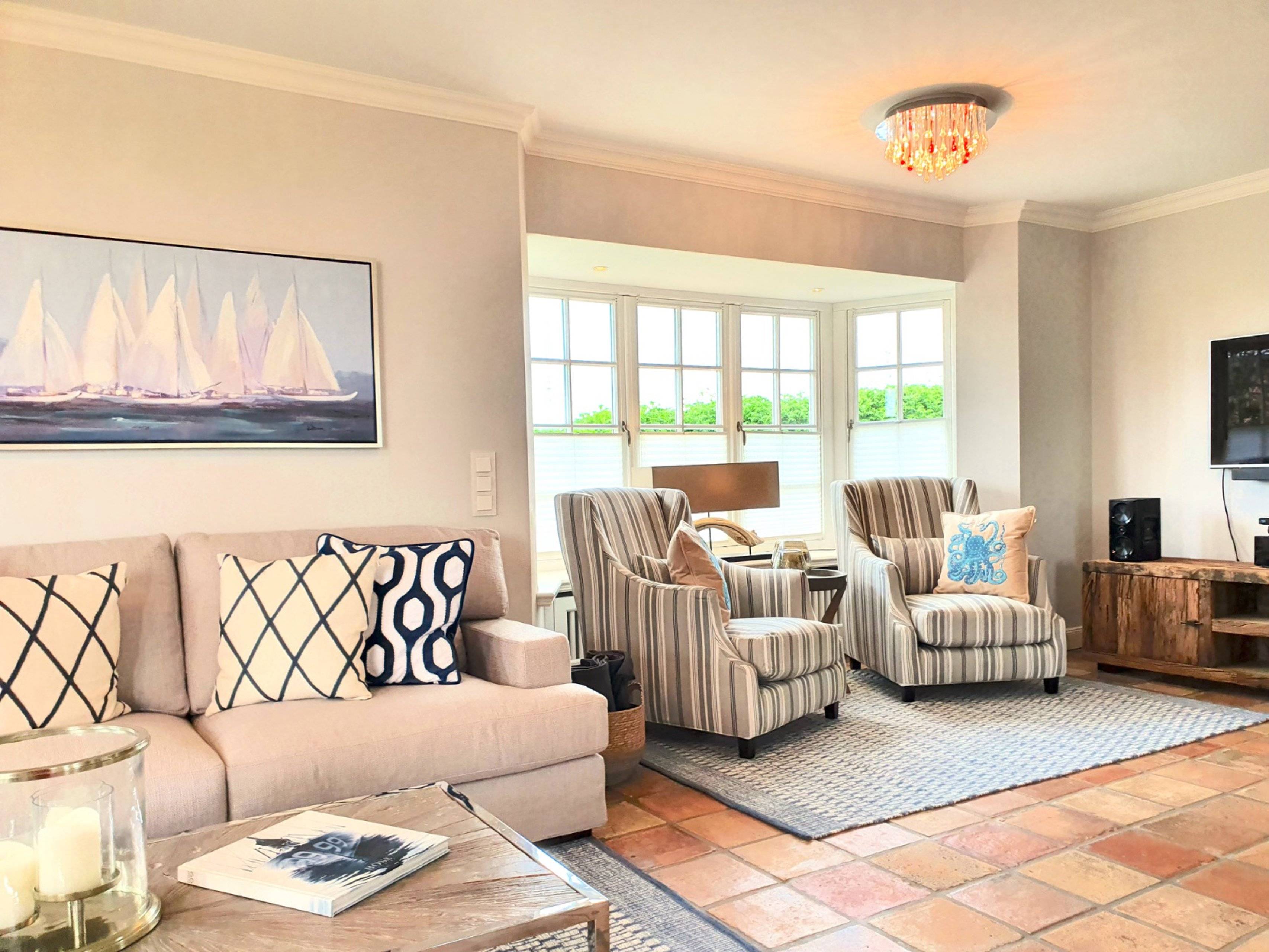 Treten Sie ein in das Luxus Ferienhaus Rantum Royal in Rantum und seinen exklusiven Wohnbereich mit antiken Terracottafliesen und edlen Holzfußböden. Der großzügige Wohnbereich ist geprägt von warmen Farbtönen und einer stil- und geschmackvollen Einrichtung. Die gemütlichen Polstermöbel sind ein idealer Ort für ausgiebige Gespräche mit seinen Liebsten.