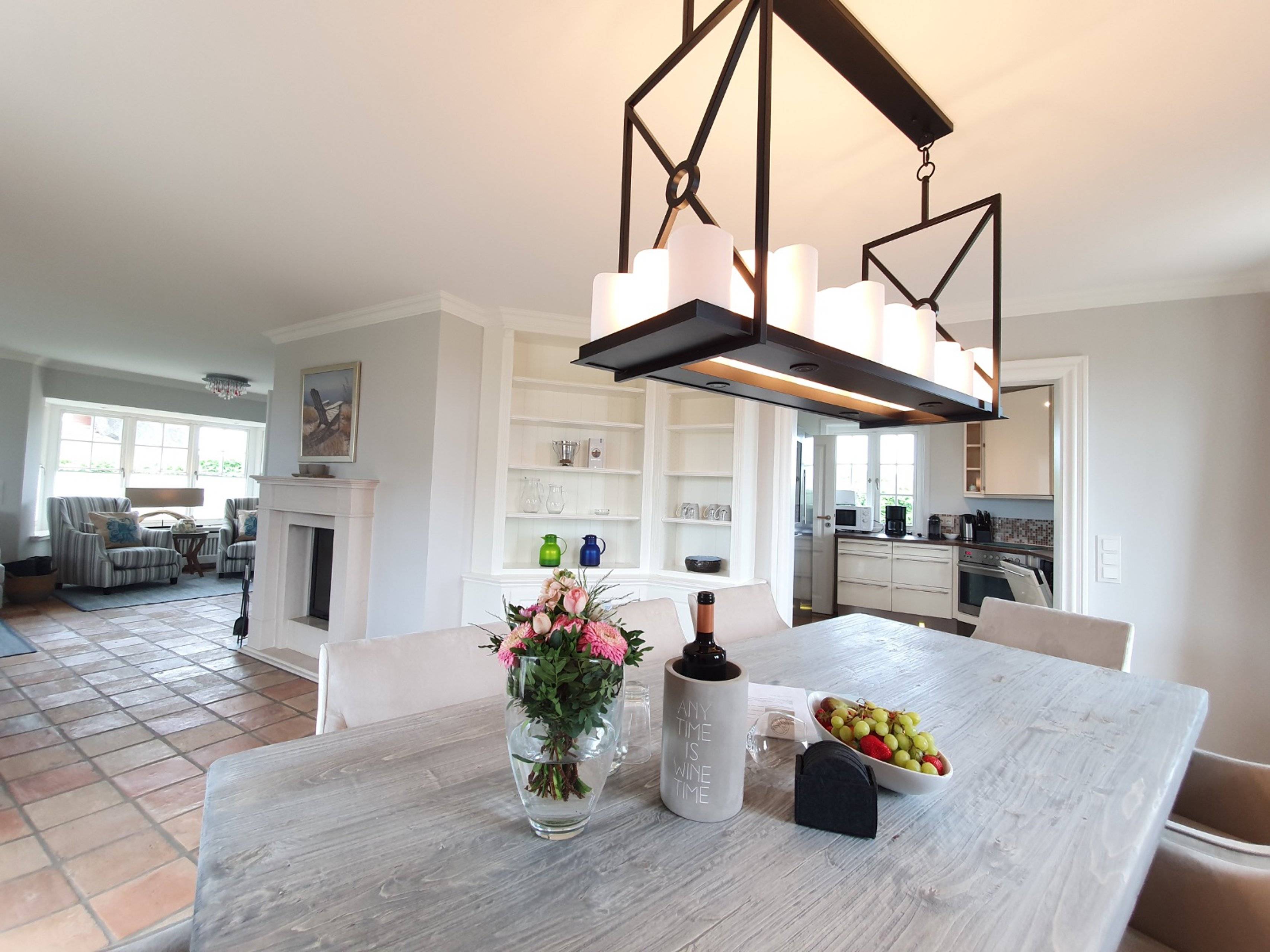 Die moderne Einbauküche verfügt über einen großen Kühl- / Gefrierschrank und einen zusätzlichen Weinkühlschrank, der edle Tropfen temperaturgerecht lagert. Unmittelbar neben der Küche gelangt man an den großen Esstisch, an dem bis zu acht Personen Platz finden.