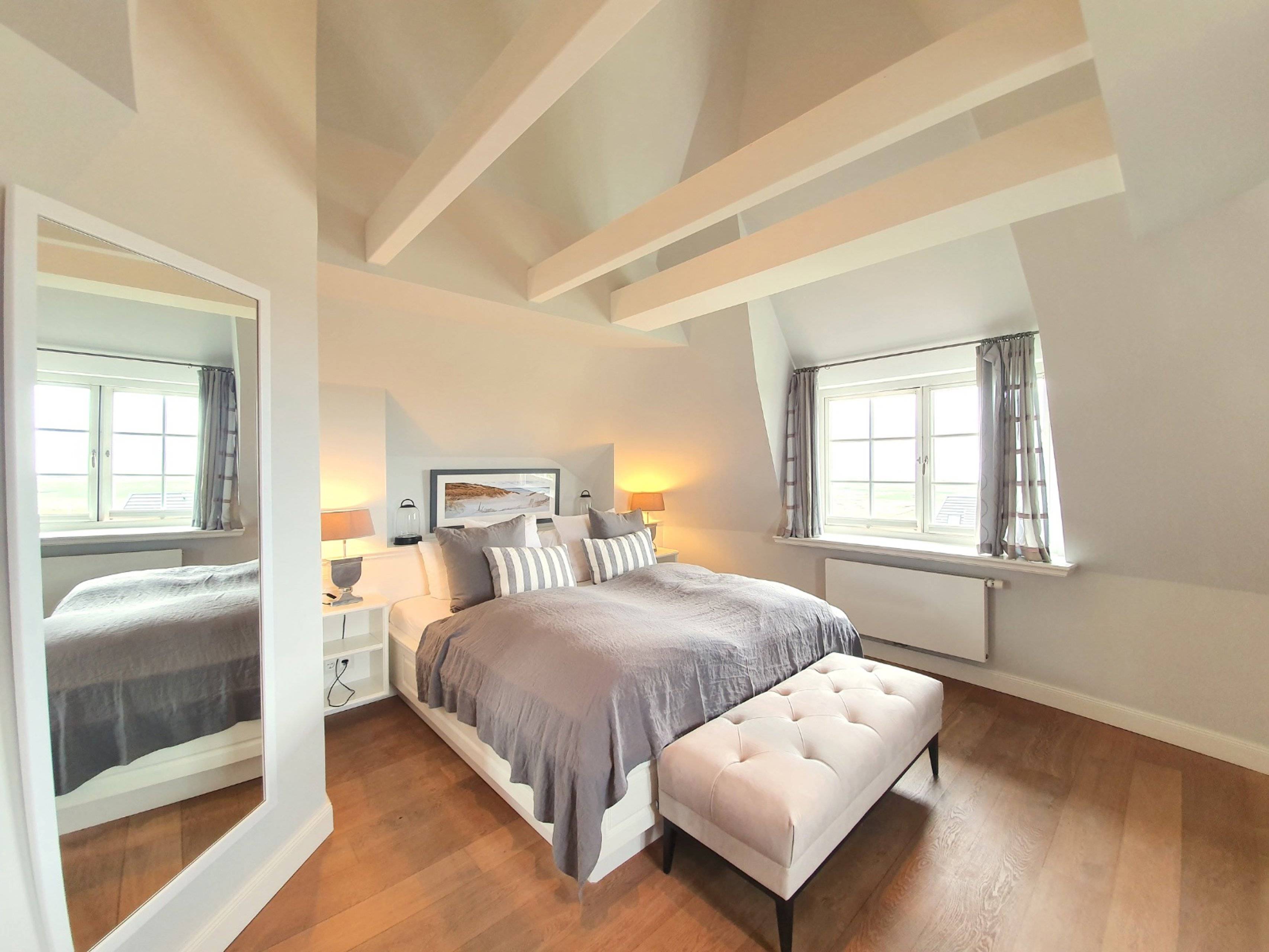Im Warftgeschoss sind zwei individuelle Schlafräume mit großen Doppelbetten und Flatscreens vorhanden. Zudem gehören zwei mit Mosaikfliesen ausgelegte Bäder für genügend Diskretion und Freiraum hinzu. Zur idealen Entspannung nach einem erlebnisreichen Tag oder einem ausgiebigen Strandspaziergang sorgt die hauseigene Sauna.
