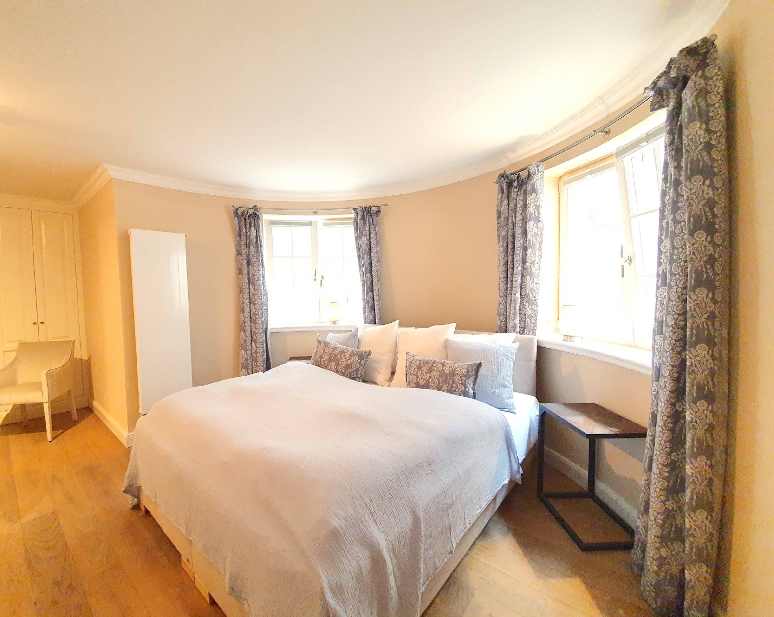 Doppelbett Fenster Flatscreen Heizung Kleiderschrank Polsterbank Rauchmelder Spiegel Vorhänge