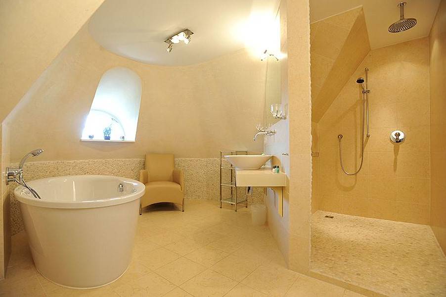 Ein großes Hauptschlafzimmer mit Doppelbett und einem Fernseher, sowohl ein zweites Schlafzimmer mit einem französischen Doppelbett befindet sich im Dachgeschoss. Im Vollbad ist die freistehende Badewanne in einem halbrunden Turmzimmer platziert, nebst einer großen Dusche mit optionaler Regendusche. Ein zweites Duschbad, welches ebenso mit modernem Marmor und Kieselsteinen verkleidet ist, befindet sich auf gleicher Ebene.