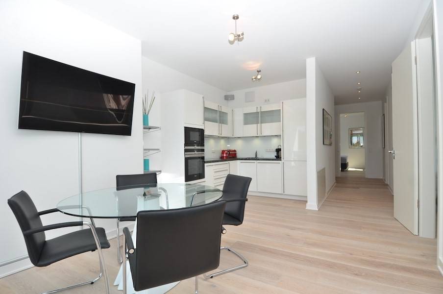 Bereits der Eingangsbereich mit großzügiger Garderobe und eigener Sauna versprüht einen Hauch von Luxus. Der angrenzende, hochwertig ausgestattete, lichtdurchflutete Wohnbereich lädt mit einer bequemen Sitzecke von Leolux, einem Samsung Curved ULTRA HD Smart –TV UE 55 / 4K – 900 HZ, einem DVD - Blu -Ray - Player sowie einem Sonos Wireless Hifi Sound-System für alle Smartphones zum Ausspannen ein. Genießen Sie von hier aus den herrlichen Ausblick auf die Ostsee.