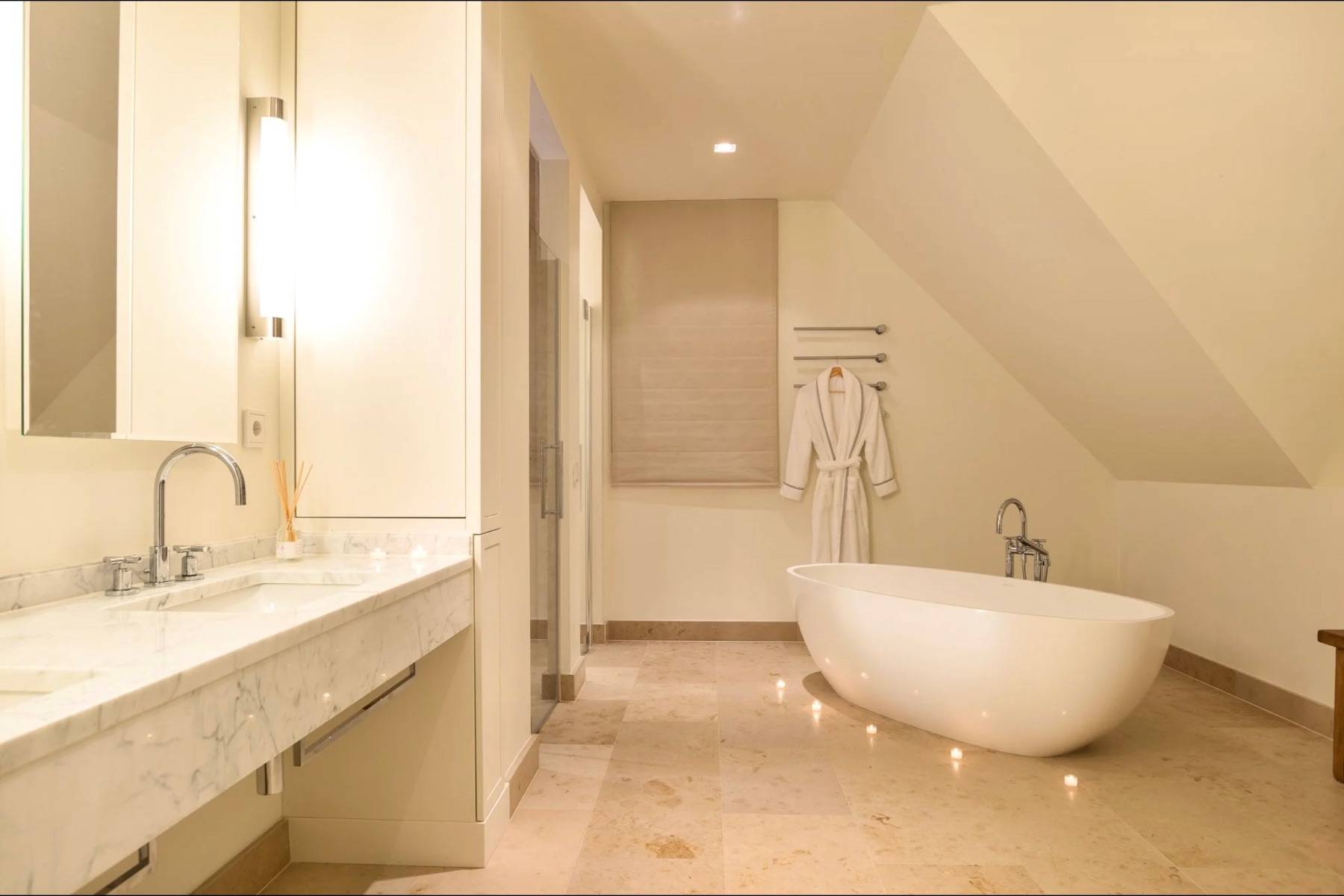 Bademantel Badetuch Badewanne freistehend Doppelwaschbecken Dusche Fenster Fußbodenheizung Haartrockner Handtuch Handtuchheizkörper Plissees Spiegel WC