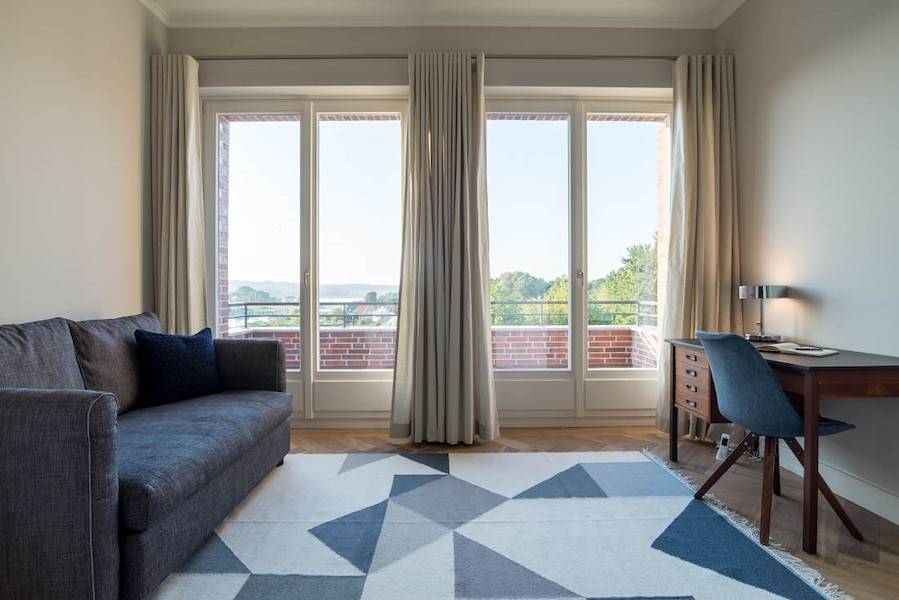 Balkonzugang Fenster Fußbodenheizung Schreibtisch Sofa Stuhl Vorhänge
