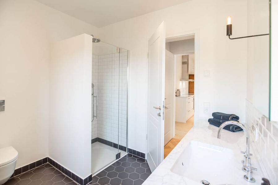 Badetuch Doppelwaschbecken Dusche Fenster Fußbodenheizung Haartrockner Handtuch Plissees Spiegel WC
