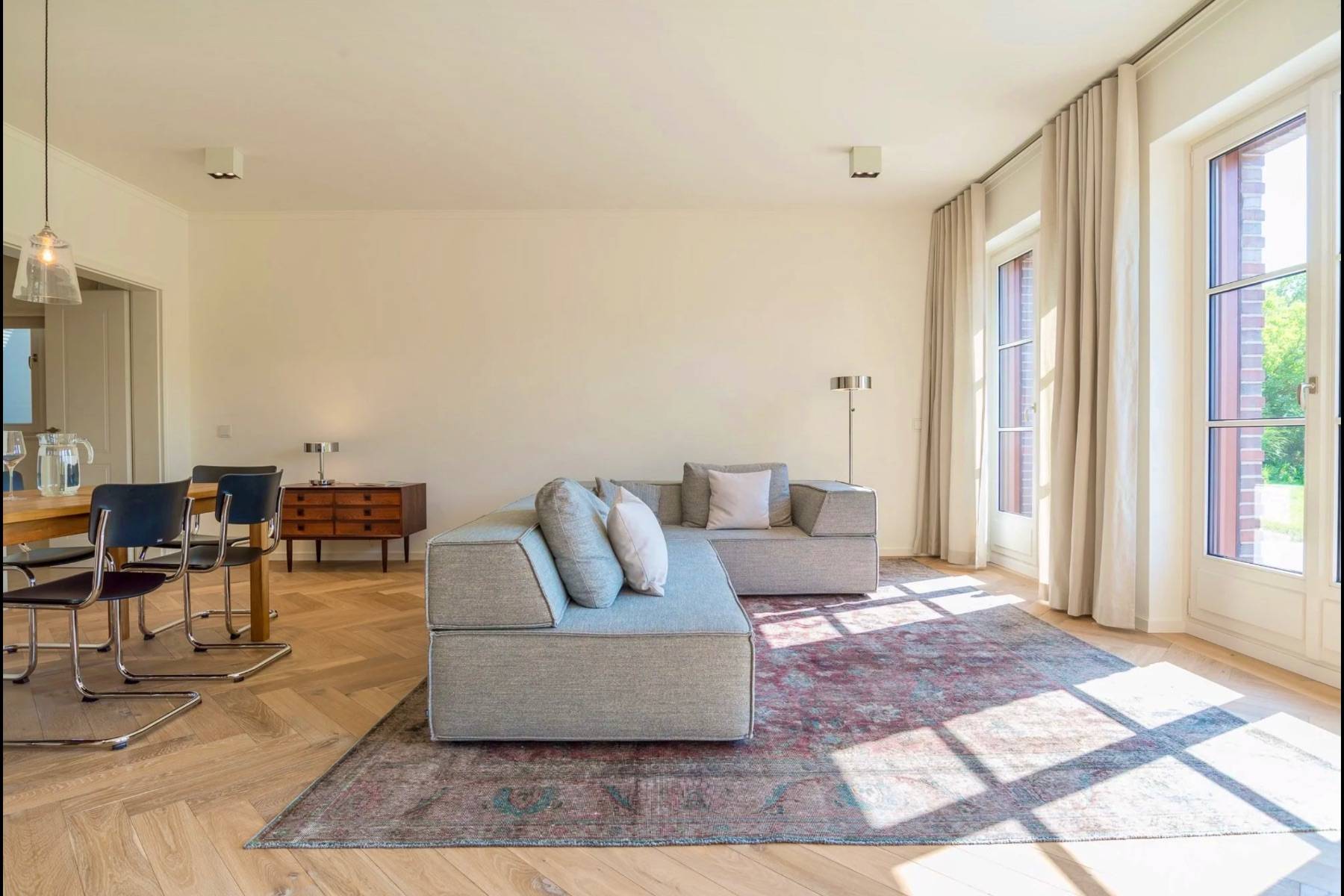 Über einen eigenen Hauseingang gelangt man in die 100 qm große Wohnung, deren Boden mit edlem Parkett in Fischgrät- Muster und einer Fußbodenheizung versehen ist. Tageslicht strömt durch die bodentiefen Sprossenfenster in den weitläufigen Wohnraum, in dem ein schlichtes, aber bequemes Sofa zum entspannen einlädt. Der Blick nach draußen in den grünen Garten wirkt beruhigend. Der Urlaub hat begonnen.