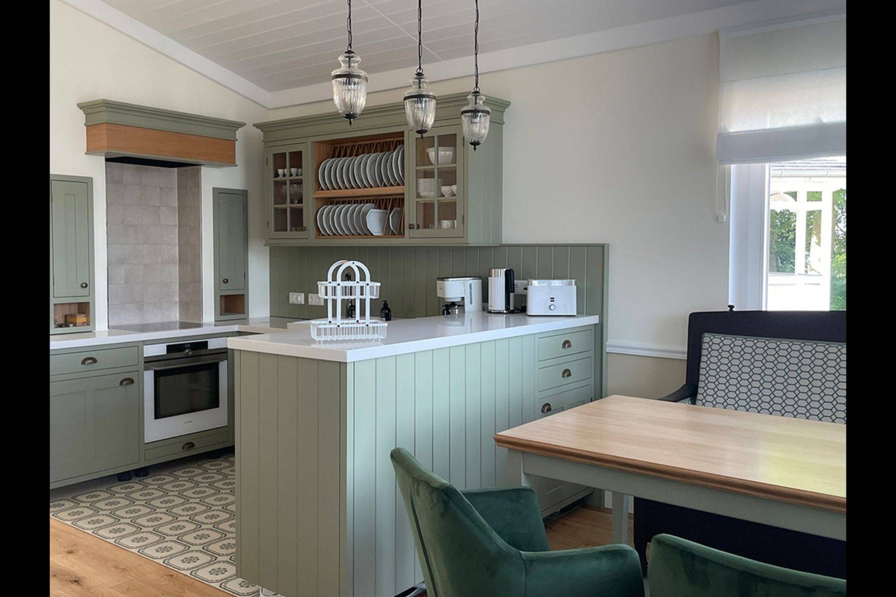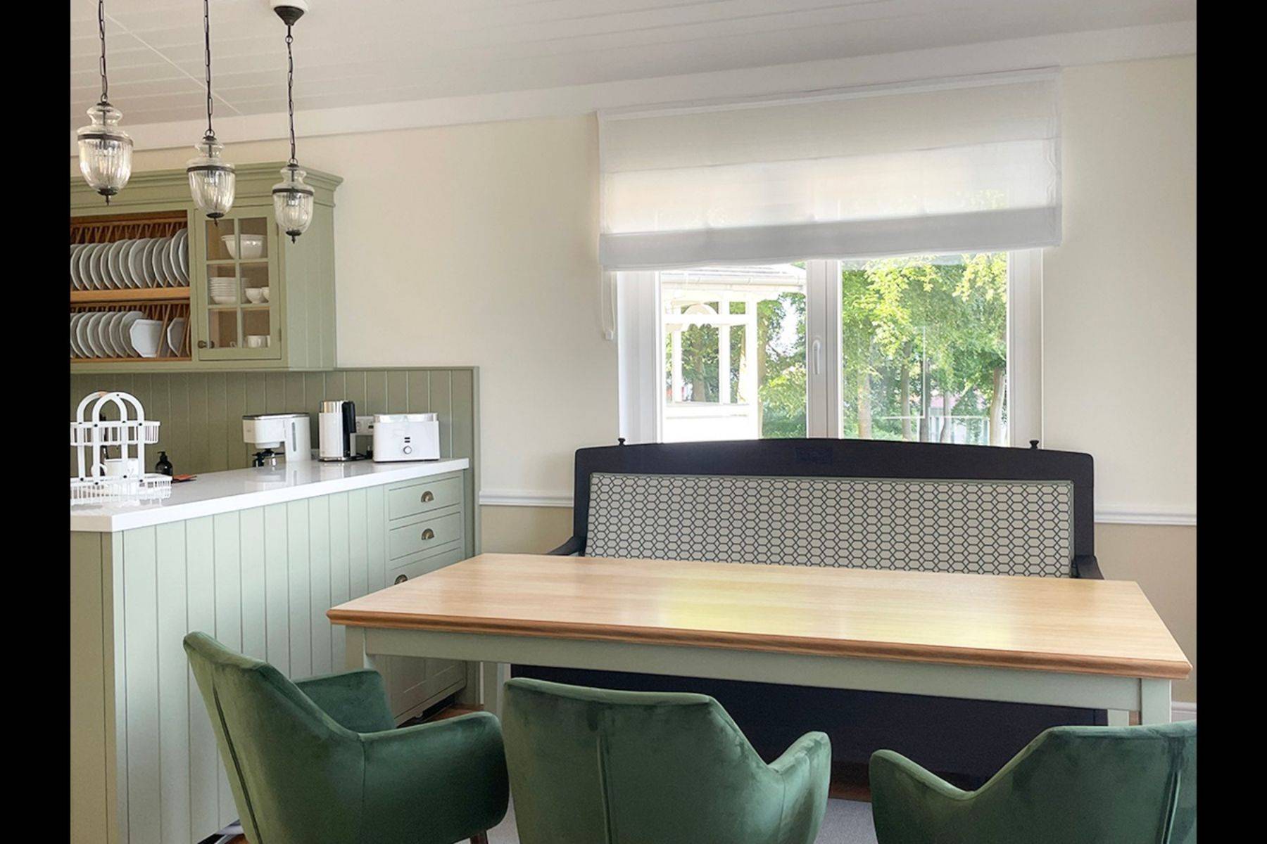 Die gemütliche Wohnküche im englischen Landhausstil ist voll ausgestattet, der Essbereich bietet als Besonderheit ein schwedisches Küchensofa.