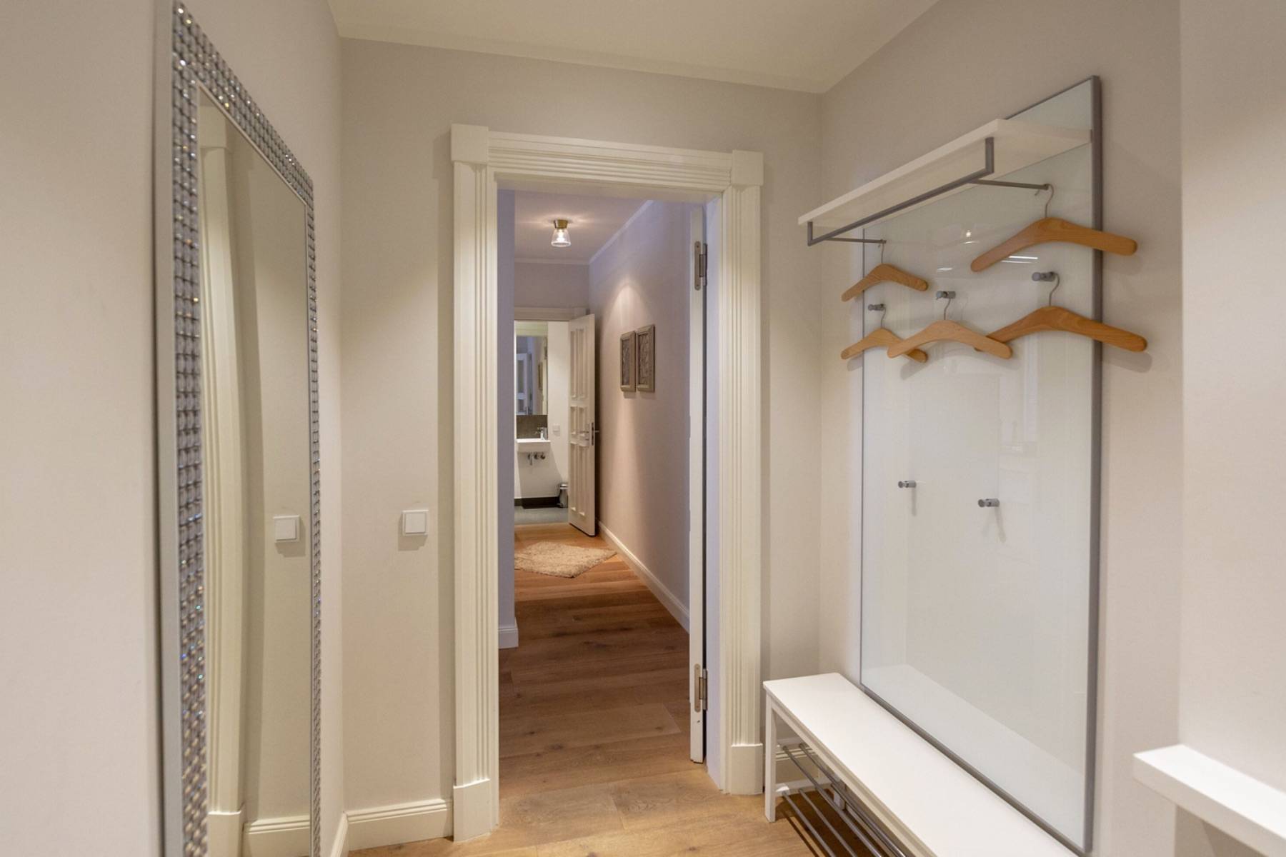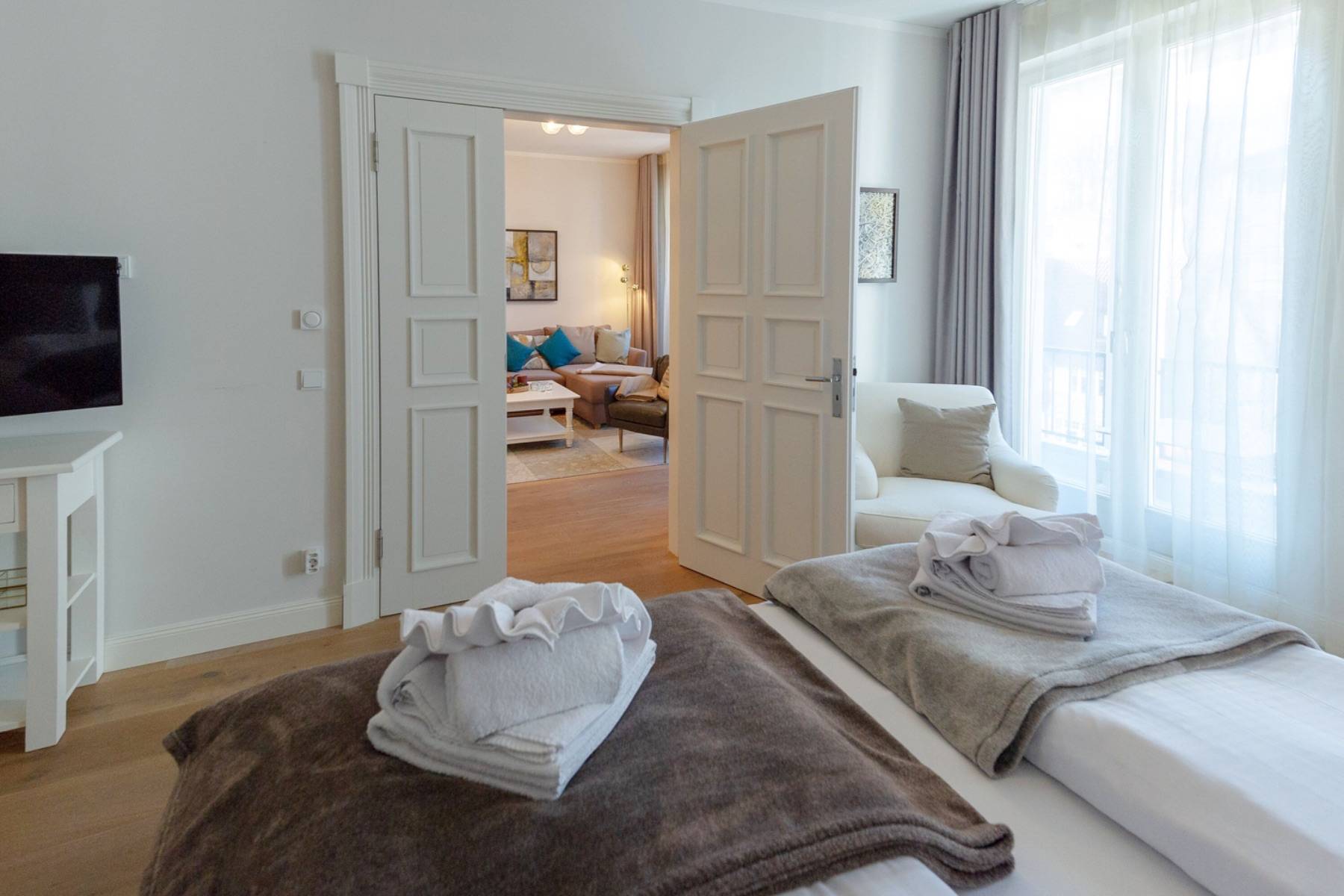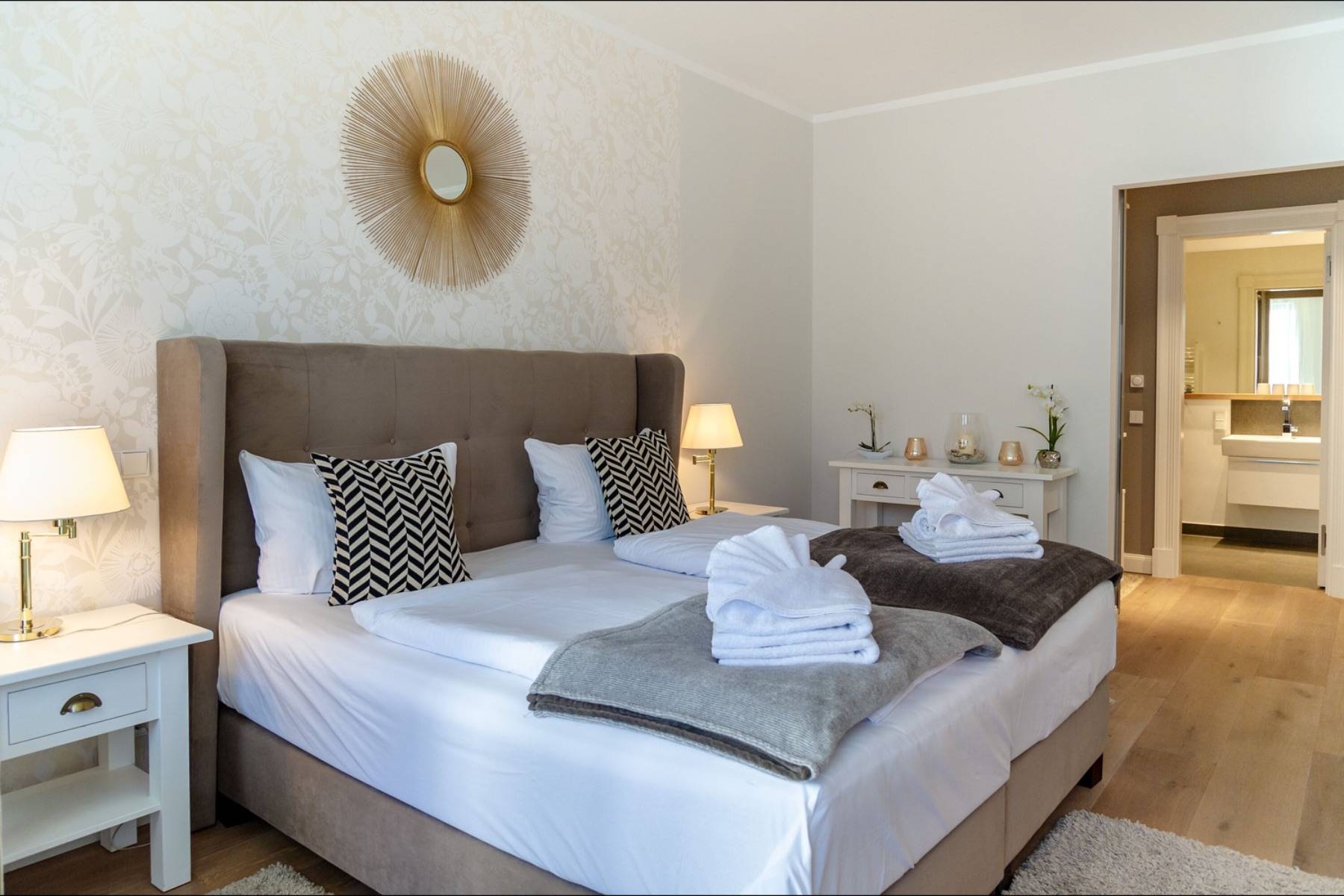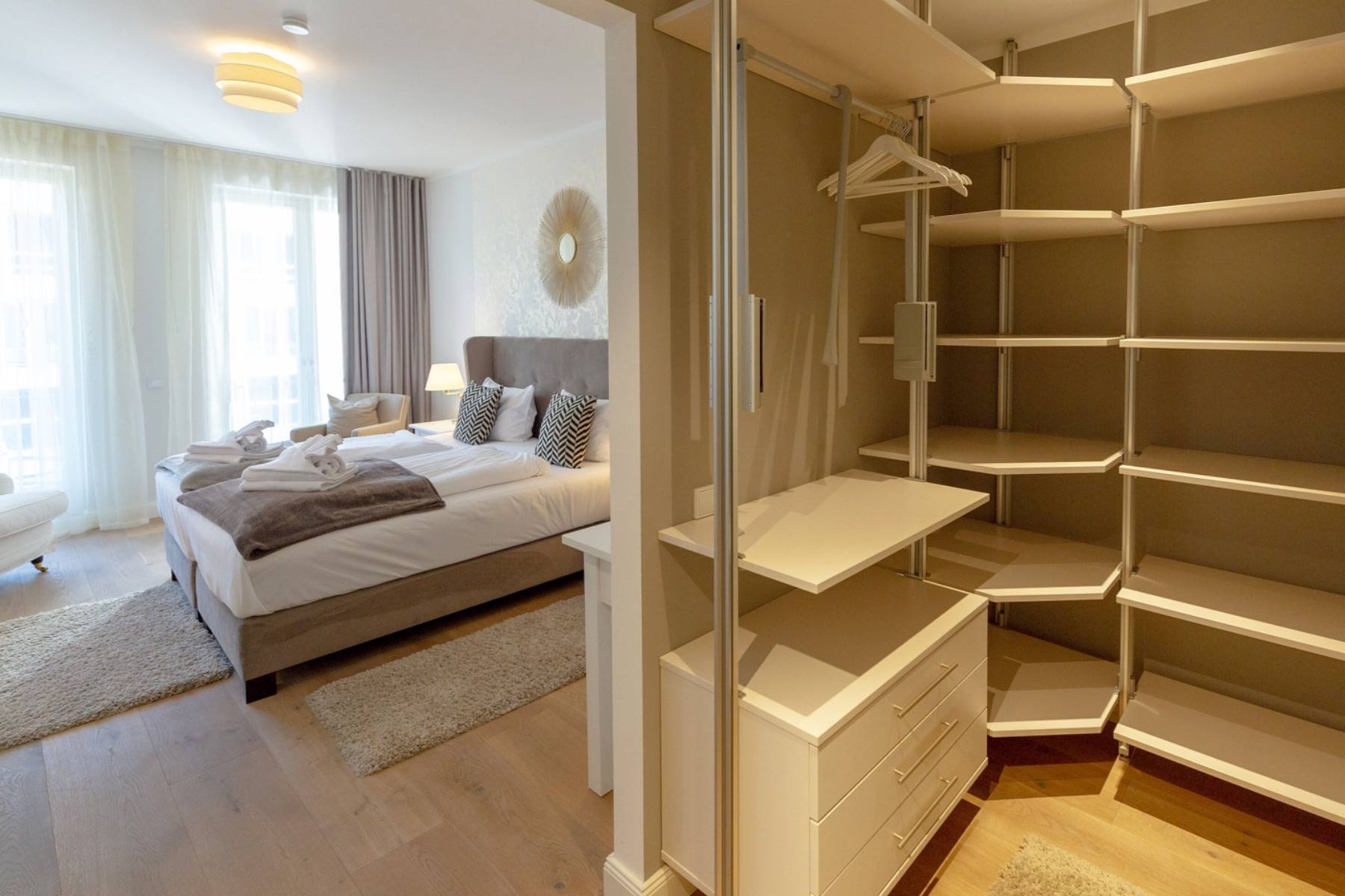 Ein 200 x 200 cm großes Boxspringbett befindet sich um 22 qm großen Schlafzimmer, welches mit einem zweiten Flatscreen ausgestattet ist. Die Urlaubsgarderobe lässt sich im angrenzenden Ankleidezimmer verstauen. Daneben gelangt man in das moderne Badezimmer mit ebenerdiger Dusche, einem Handtuchheizkörper und Kosemtikspiegel. Darüber hinaus beherbergt die Wohnung ein separates Gäste- WC.