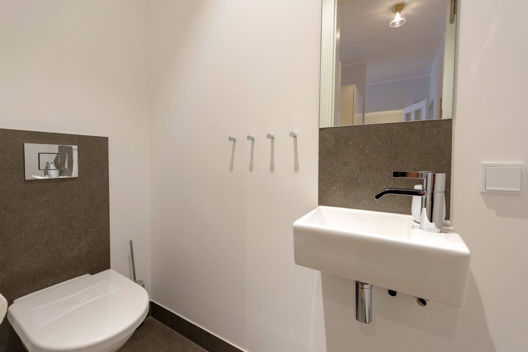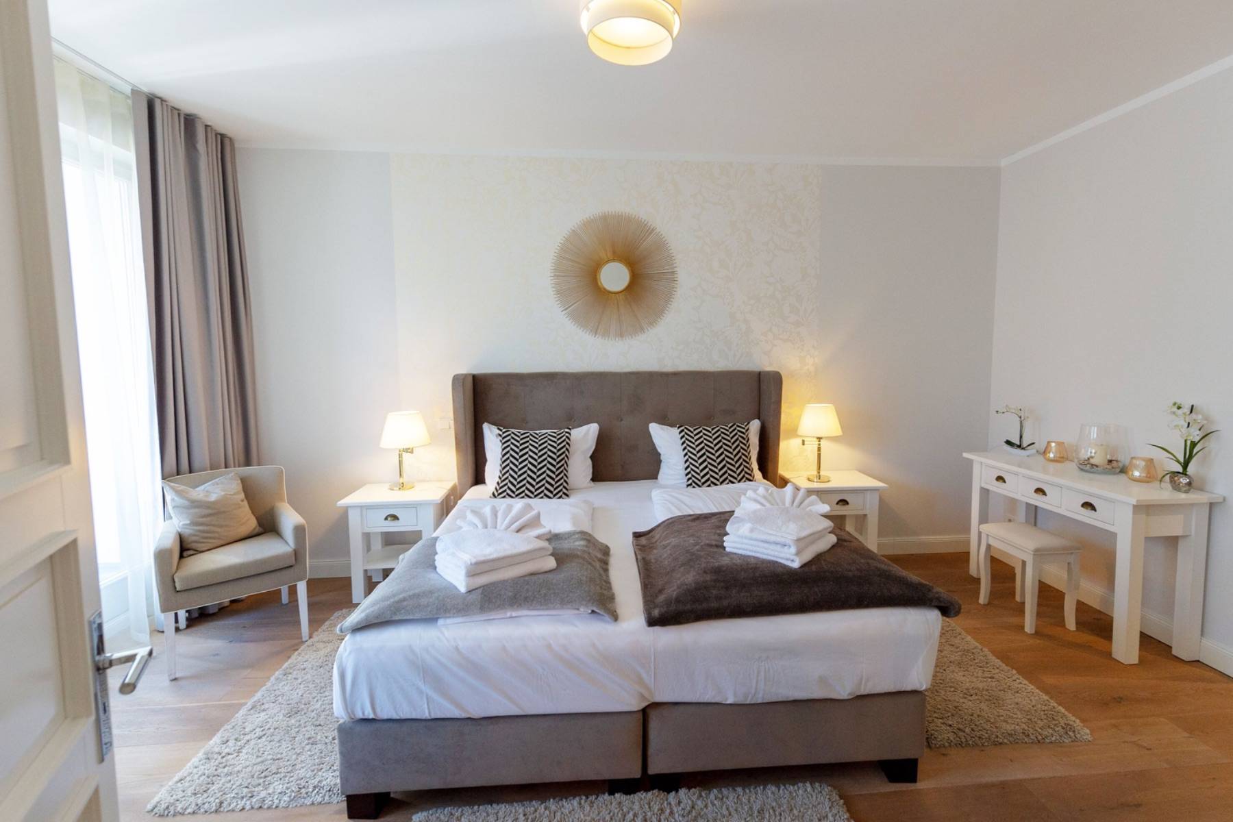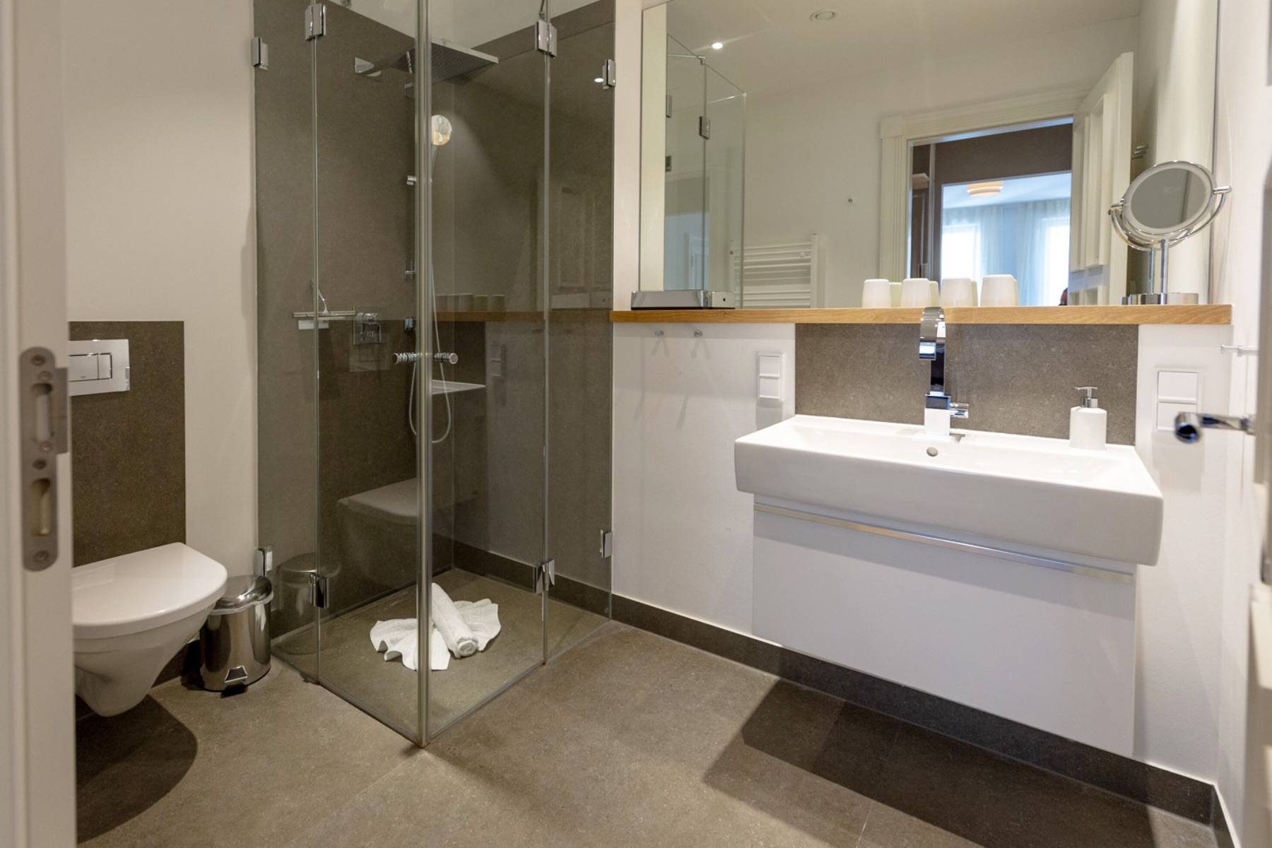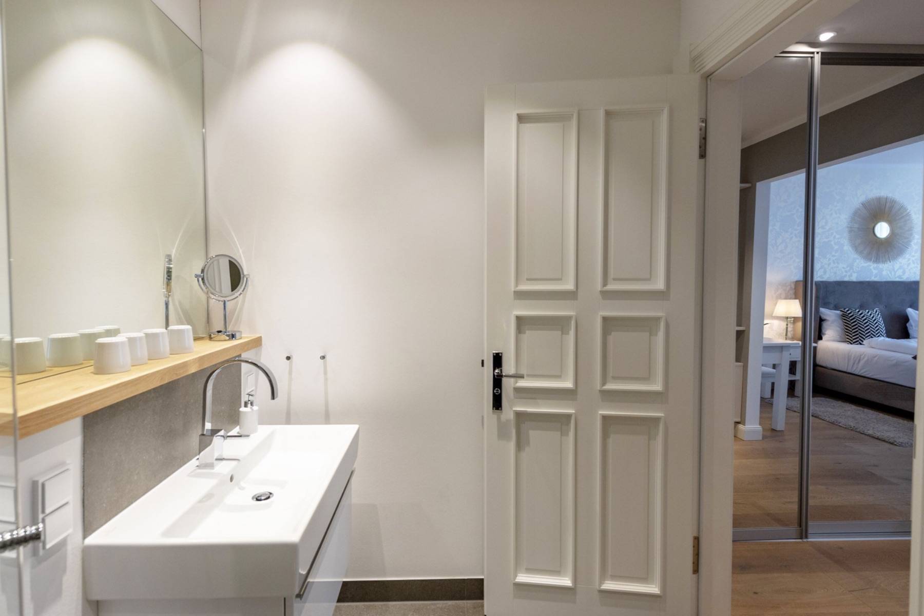 Ein 200 x 200 cm großes Boxspringbett befindet sich um 22 qm großen Schlafzimmer, welches mit einem zweiten Flatscreen ausgestattet ist. Die Urlaubsgarderobe lässt sich im angrenzenden Ankleidezimmer verstauen. Daneben gelangt man in das moderne Badezimmer mit ebenerdiger Dusche, einem Handtuchheizkörper und Kosemtikspiegel. Darüber hinaus beherbergt die Wohnung ein separates Gäste- WC.