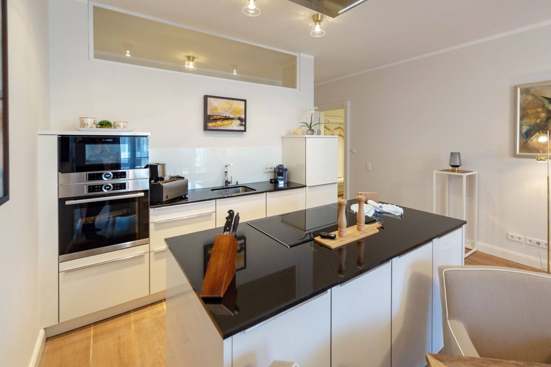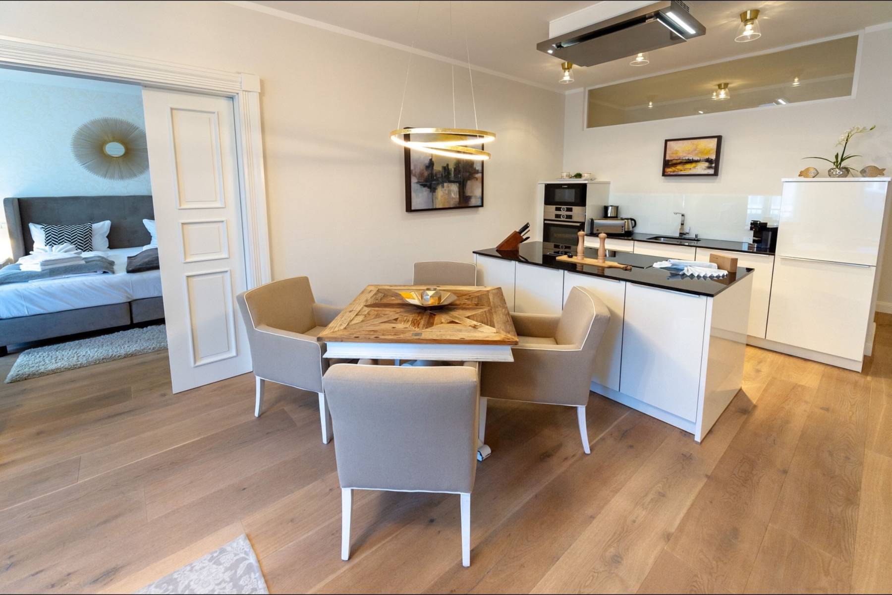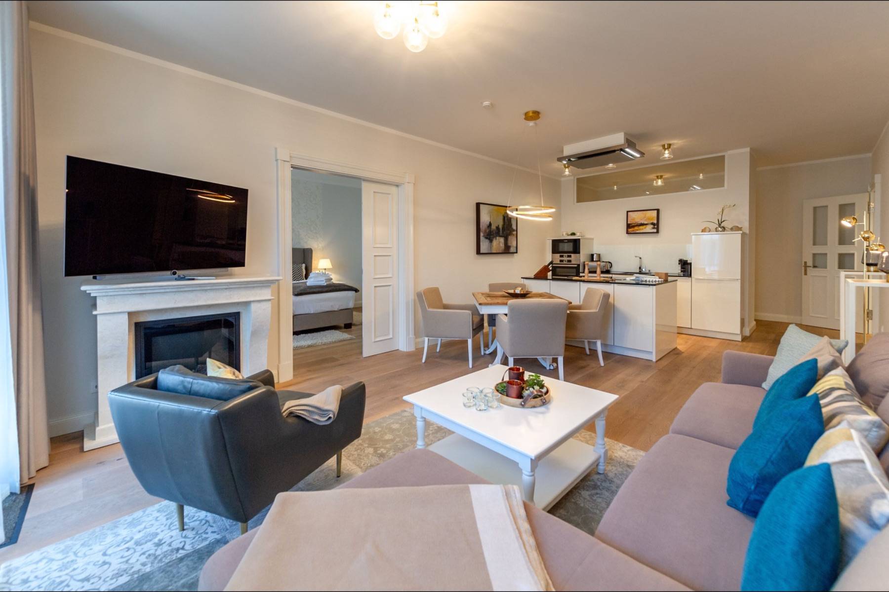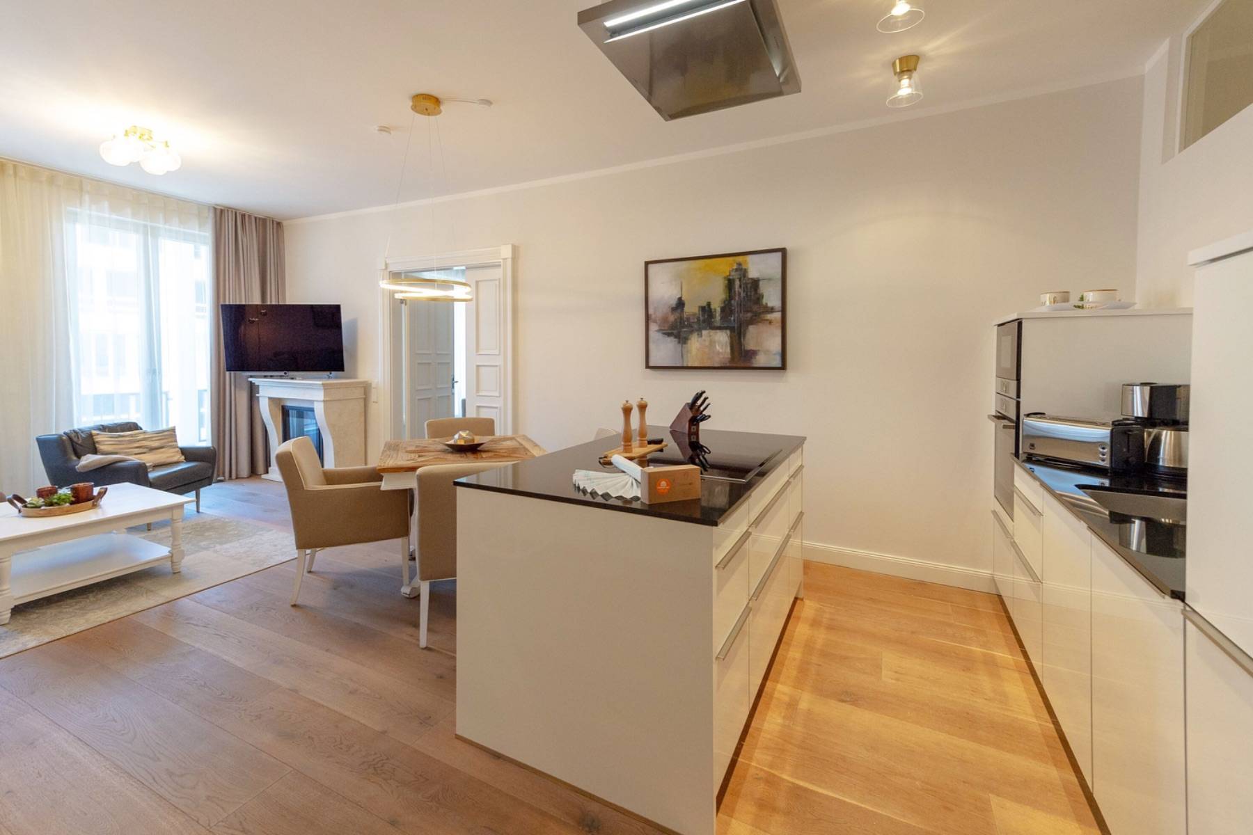 Die moderne Wohnung ist mit warmen Farben und Eichenparkett versehen. Die ausgewählten Möbel sorgen für Komfort und Gemütlichkeit wie im eigenen Zuhause. In dem über 40 qm großen Wohn- und Kochbereich ist eine moderne Luxusküche mit Kochinsel platziert, die keine Wünsche offen lässt. Das zubereitete Essen wird am daneben stehenden Esstisch mit bequemen Polsterstühlen zelebriert. Das Wohnzimmer geht fließend ineinander über, in dem ein großes Sofa und ein Sessel vor dem Elektrokamin und dem großen Loewe- Flachbildschirm zum entspannen einladen. Im Handumdrehen lässt sich das Sofa in ein 160 cm breites Schlafsofa umwandeln, auf dem bis zu zwei Personen übernachten können.