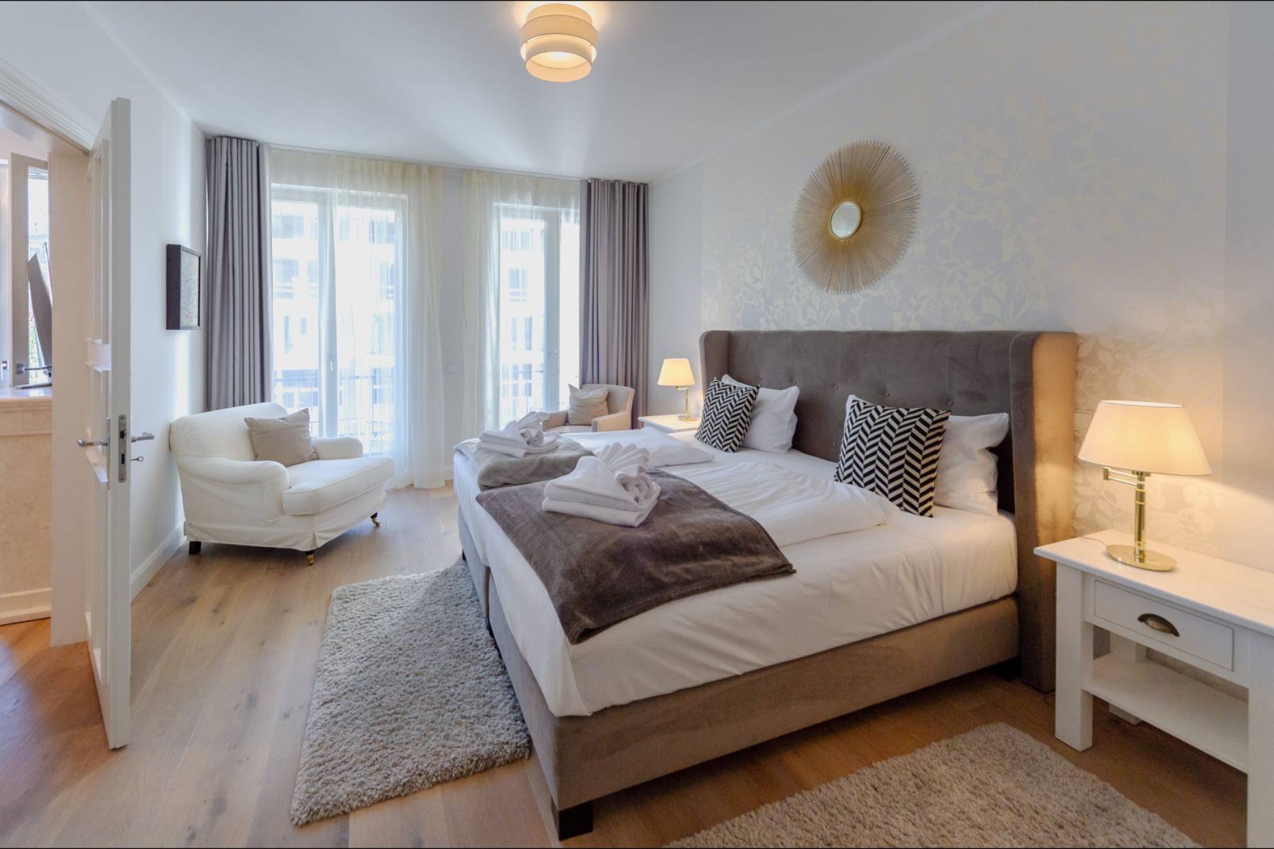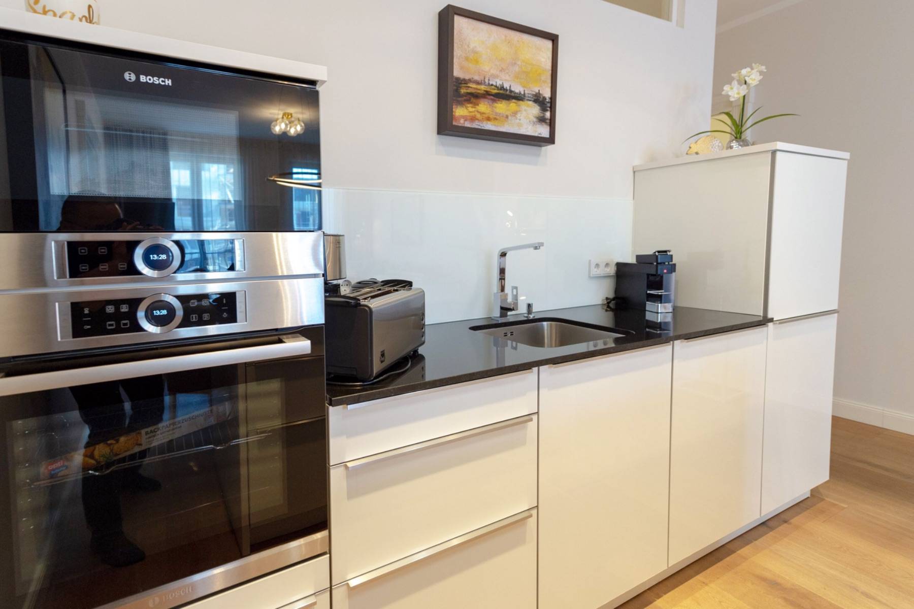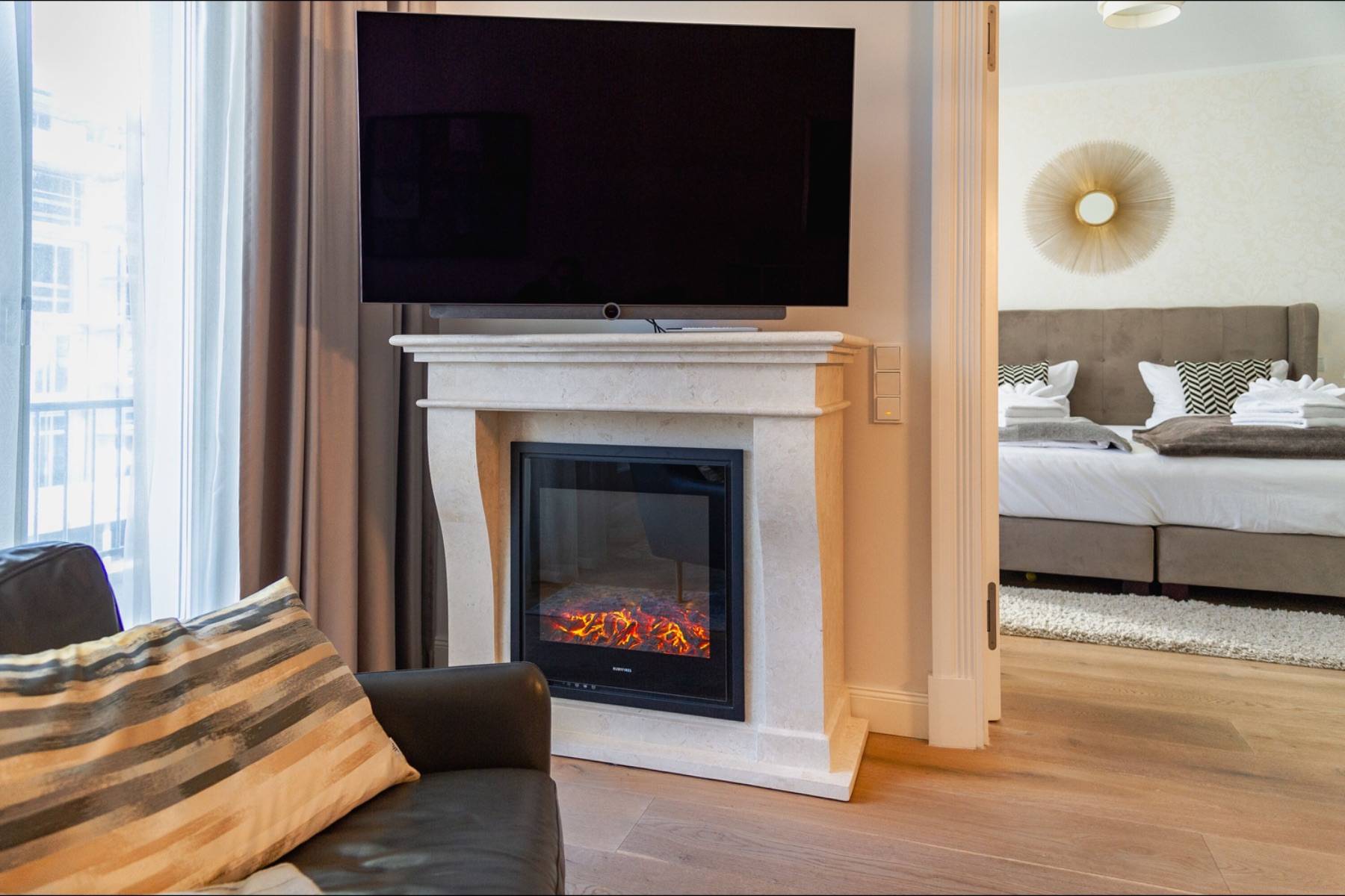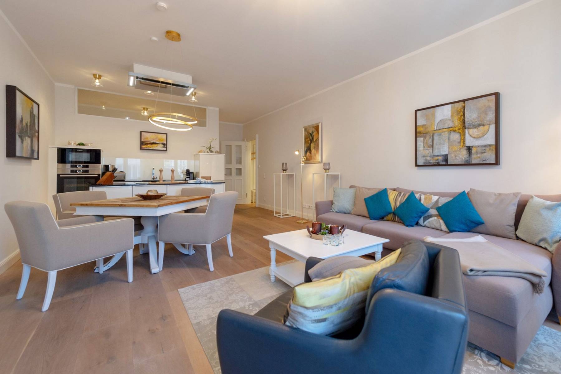 Die moderne Wohnung ist mit warmen Farben und Eichenparkett versehen. Die ausgewählten Möbel sorgen für Komfort und Gemütlichkeit wie im eigenen Zuhause. In dem über 40 qm großen Wohn- und Kochbereich ist eine moderne Luxusküche mit Kochinsel platziert, die keine Wünsche offen lässt. Das zubereitete Essen wird am daneben stehenden Esstisch mit bequemen Polsterstühlen zelebriert. Das Wohnzimmer geht fließend ineinander über, in dem ein großes Sofa und ein Sessel vor dem Elektrokamin und dem großen Loewe- Flachbildschirm zum entspannen einladen. Im Handumdrehen lässt sich das Sofa in ein 160 cm breites Schlafsofa umwandeln, auf dem bis zu zwei Personen übernachten können.