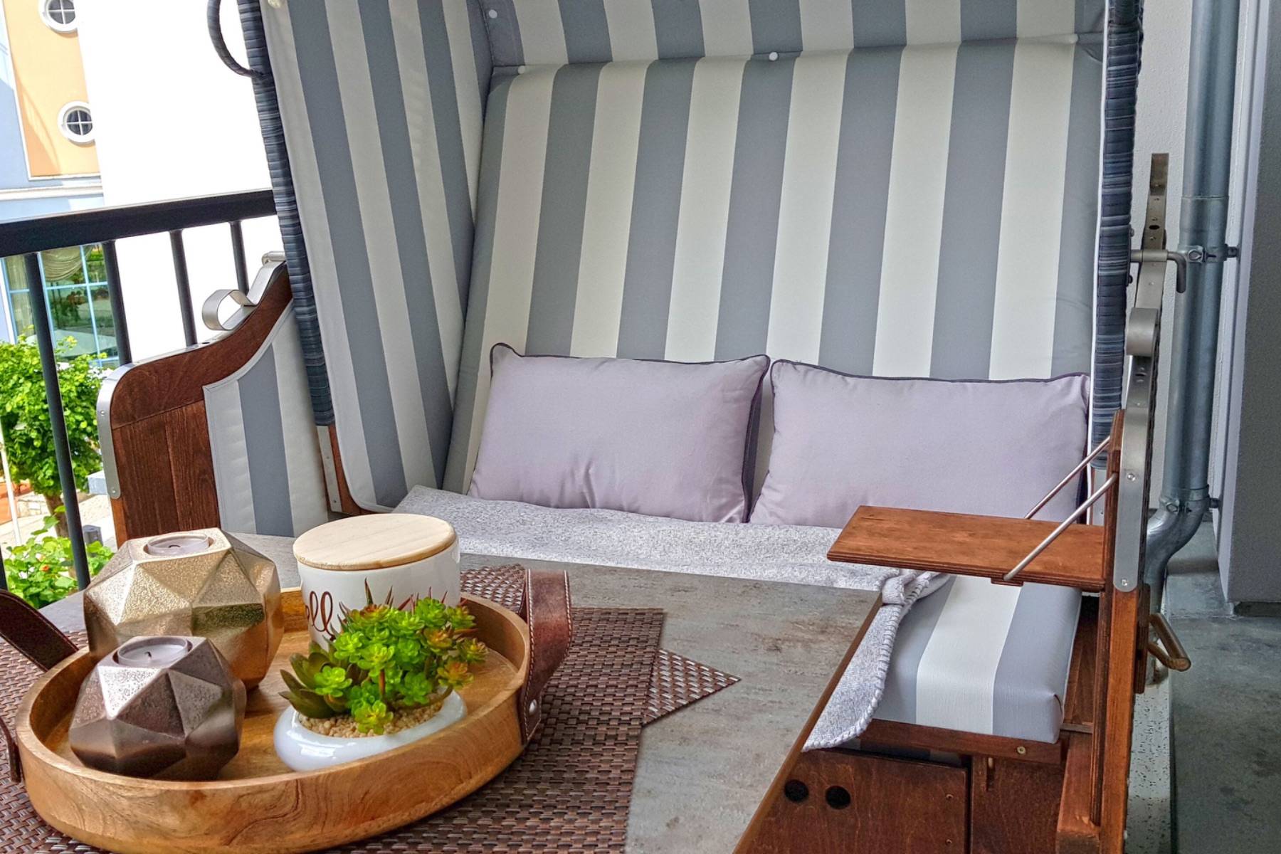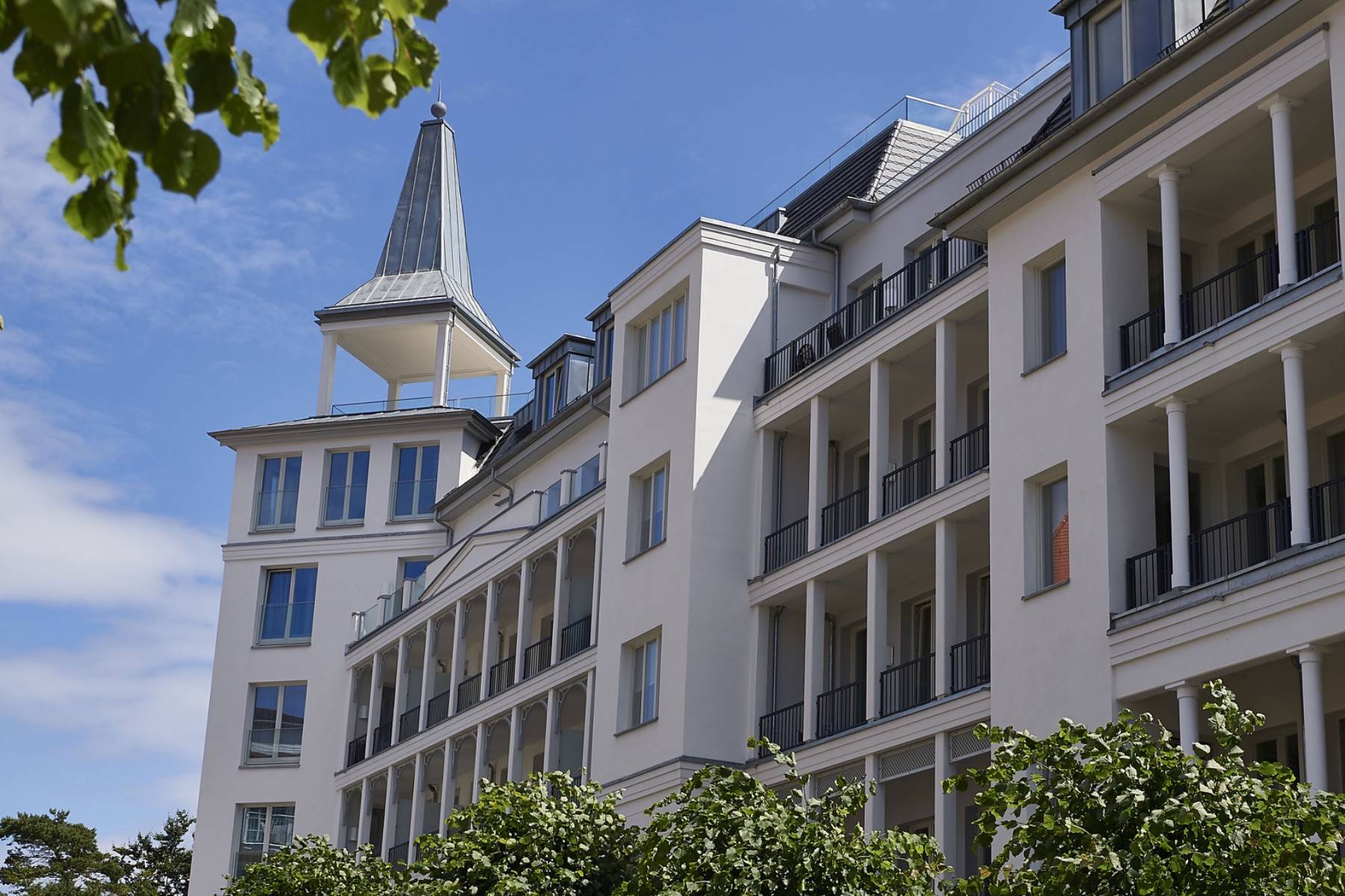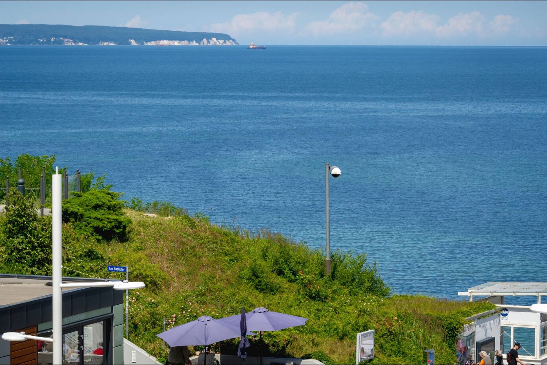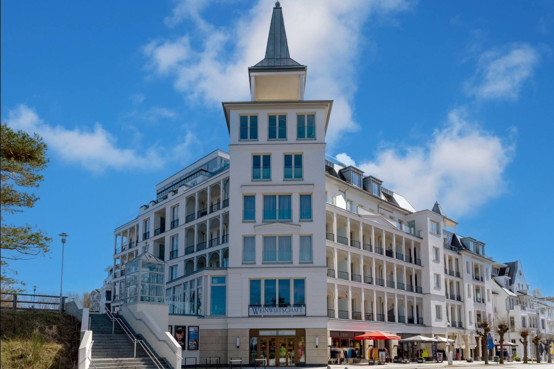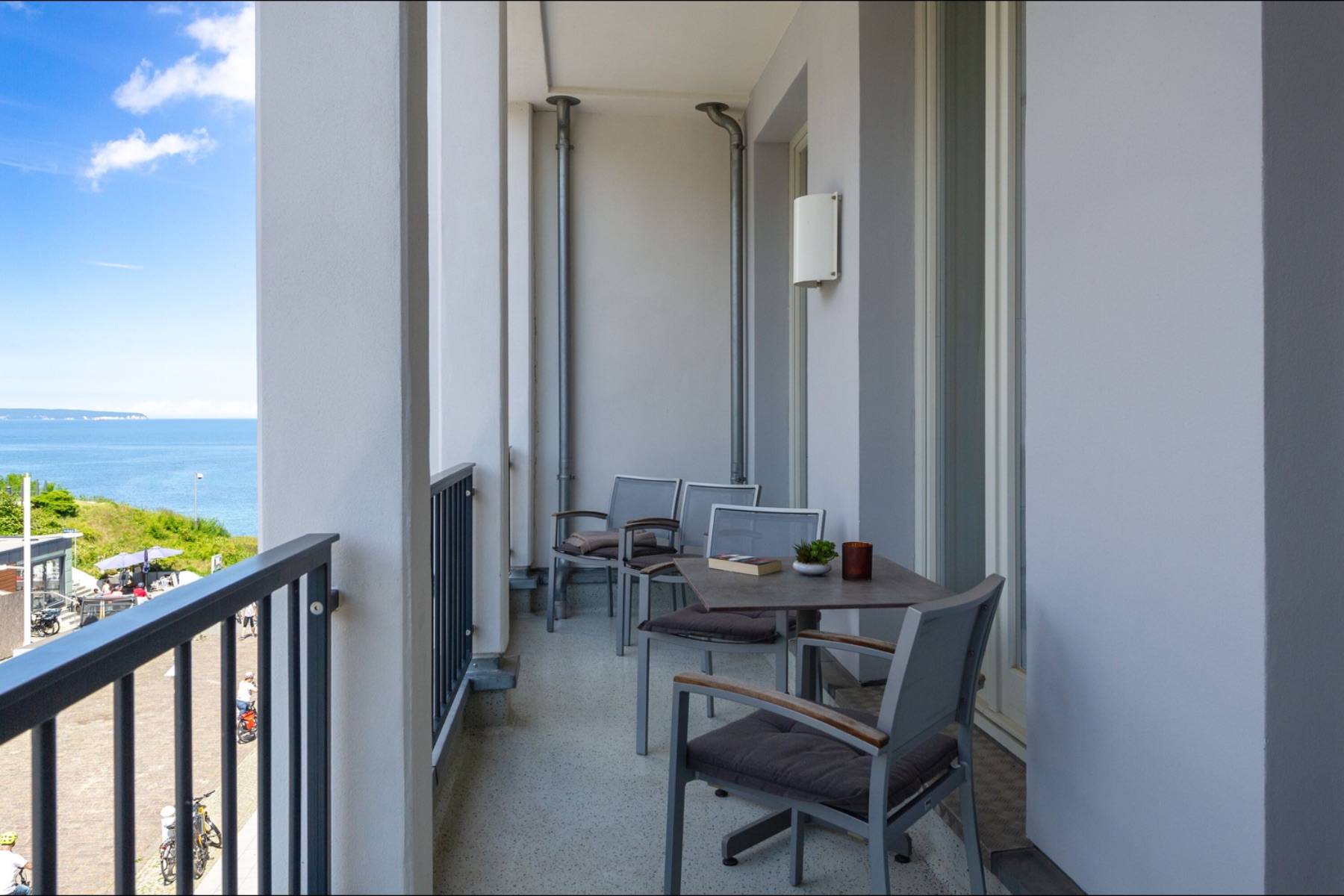 Von der großen möblierten Loggia hat man einen verträumten seitlichen Blick auf die Ostsee bis zu den weltberühmten Kreidefelsen, sowie das Treiben in der prachtvollen Wilhelmstraße, die von alten Villen und Bäumen zum Flanieren einlädt.