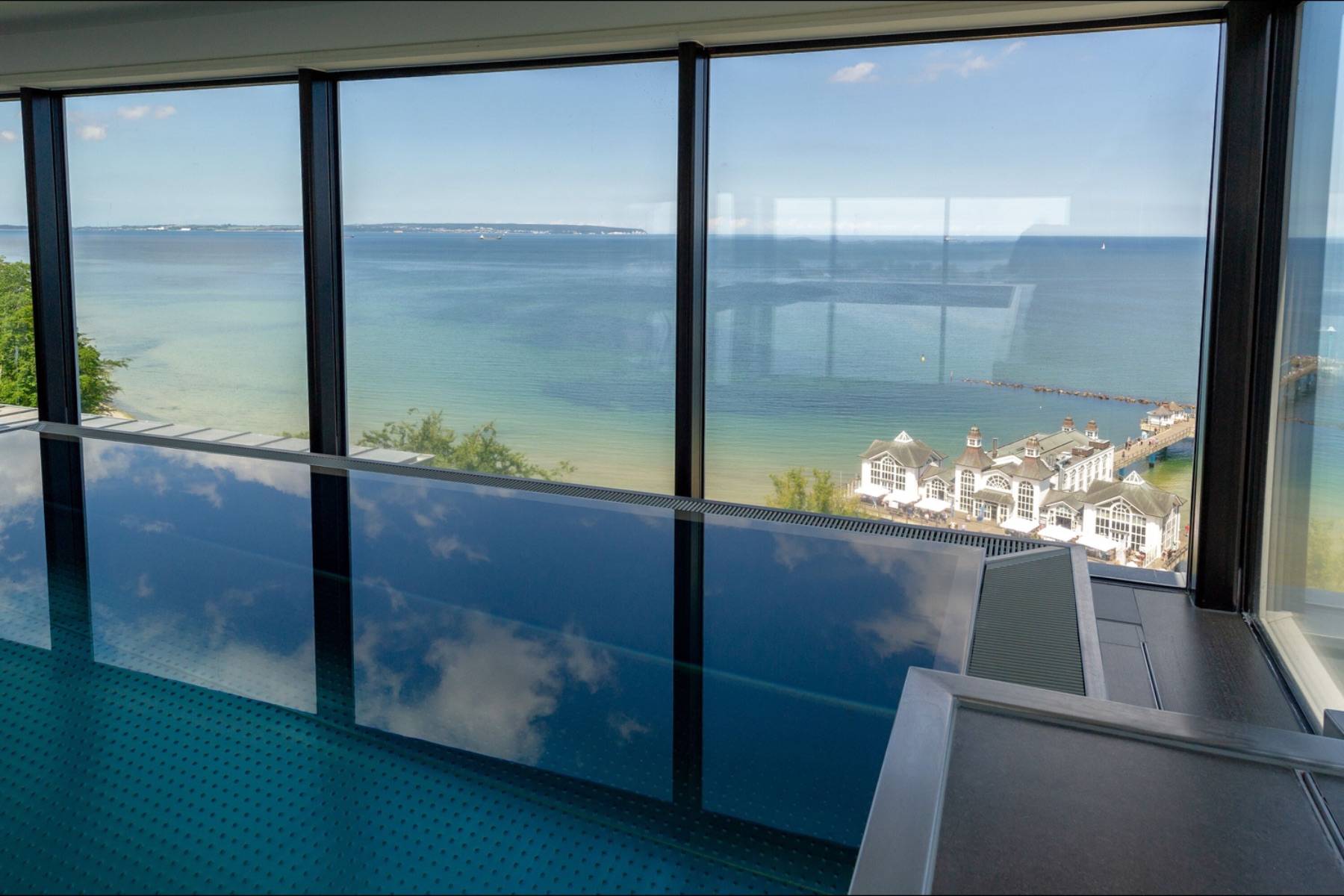 Gäste der Ferienwohnung Auszeit in Sellin steht in den Sommermonaten ein solarbeheizter Pool im Garten zur Verfügung. Alternativ dürfen Sie auch den Indoorpool auf der Dachterrasse der Villa mit atemberaubenden Meerblick und zwei Saunen nutzen.