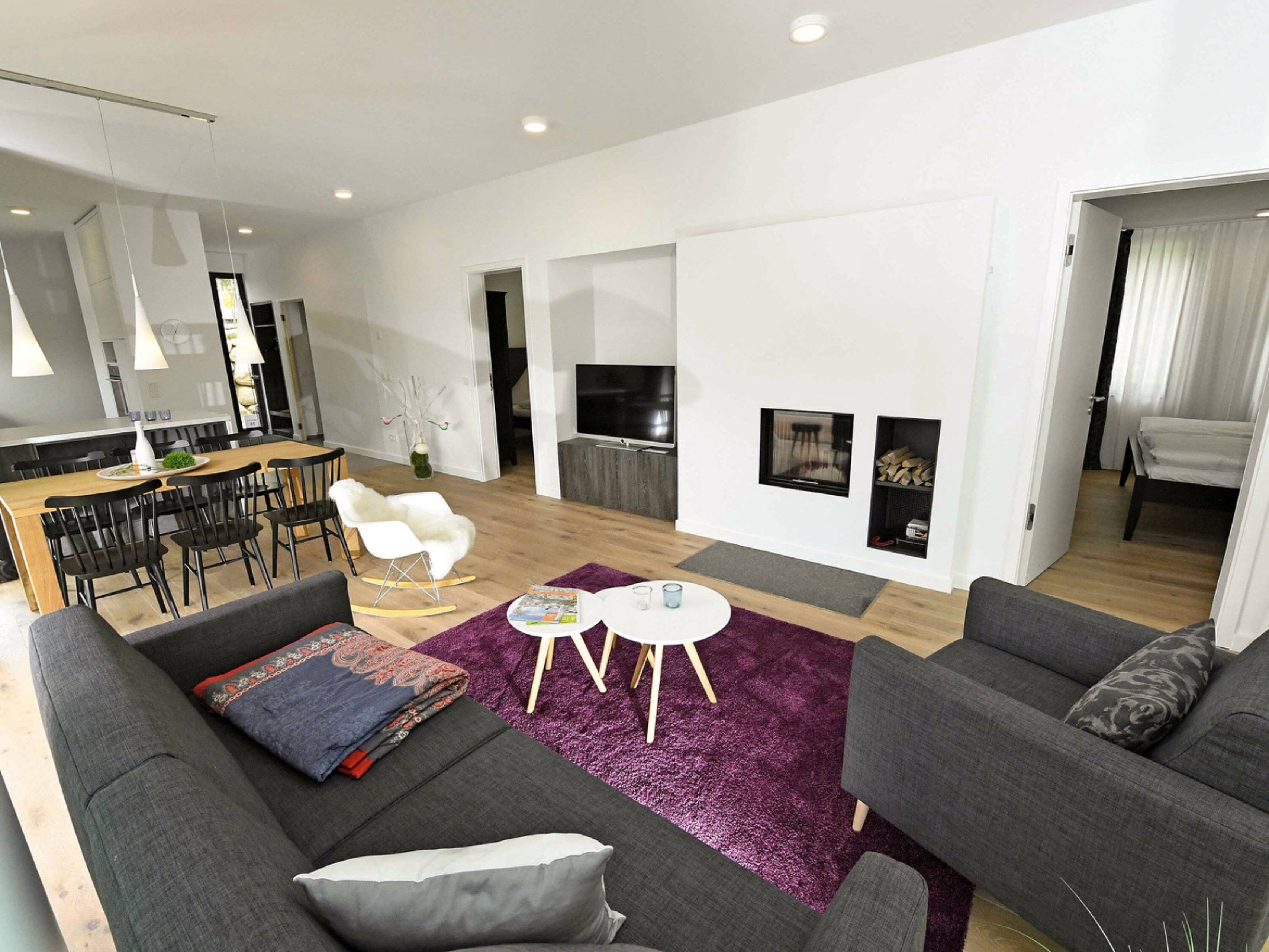 Fenster Flatscreen Fußbodenheizung Kamin Sessel Sofa Terrassenzugang Vorhänge