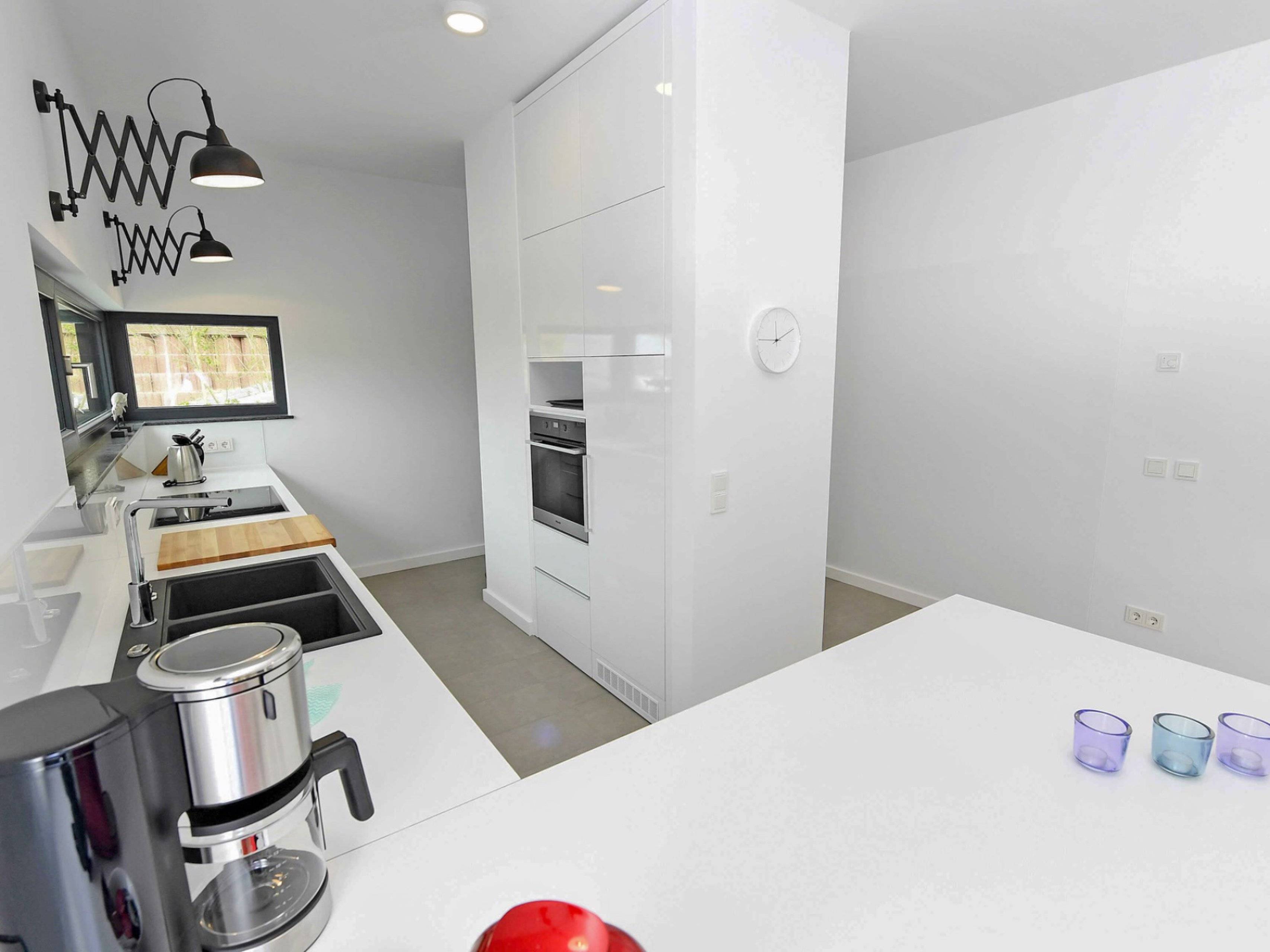 Die in den Wohnbereich integrierte voll ausgestattete und aufwändig gefertigte Einbauküche verfügt über einen Kühlschrank, eine Geschirrspülmaschine, ein 4-Zonen-Cerankochfeld mit Backofen, Kaffeemaschine, Wasserkocher, Toaster und diverses Kleininventar, das die sehr gute Ausstattung komplettiert.