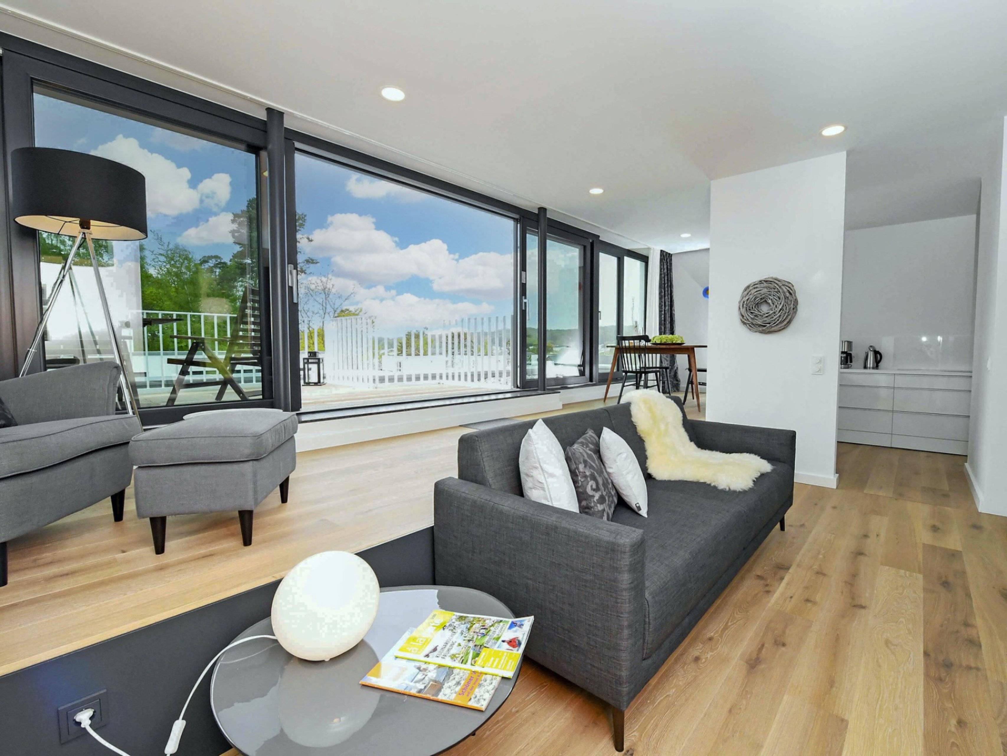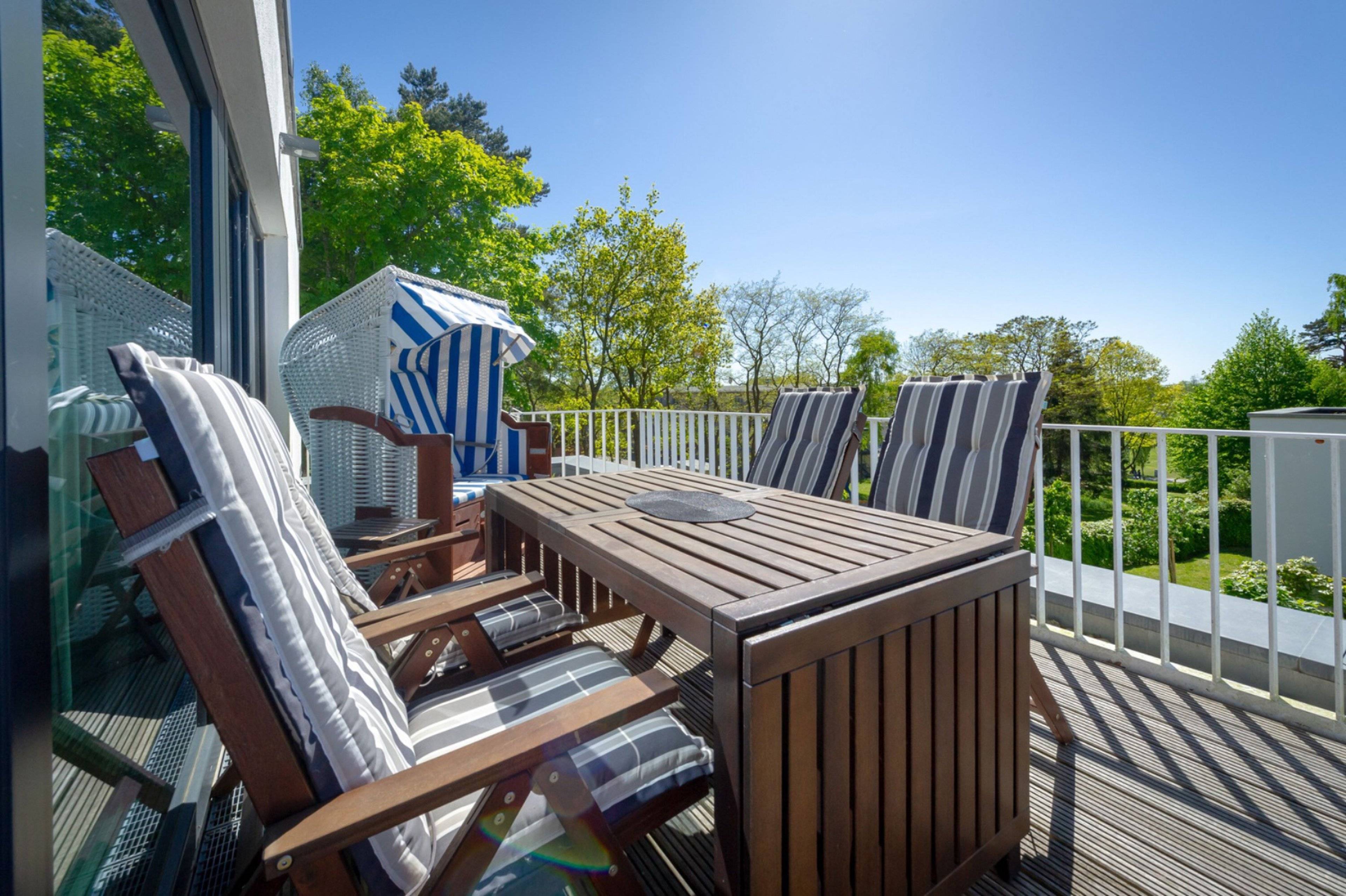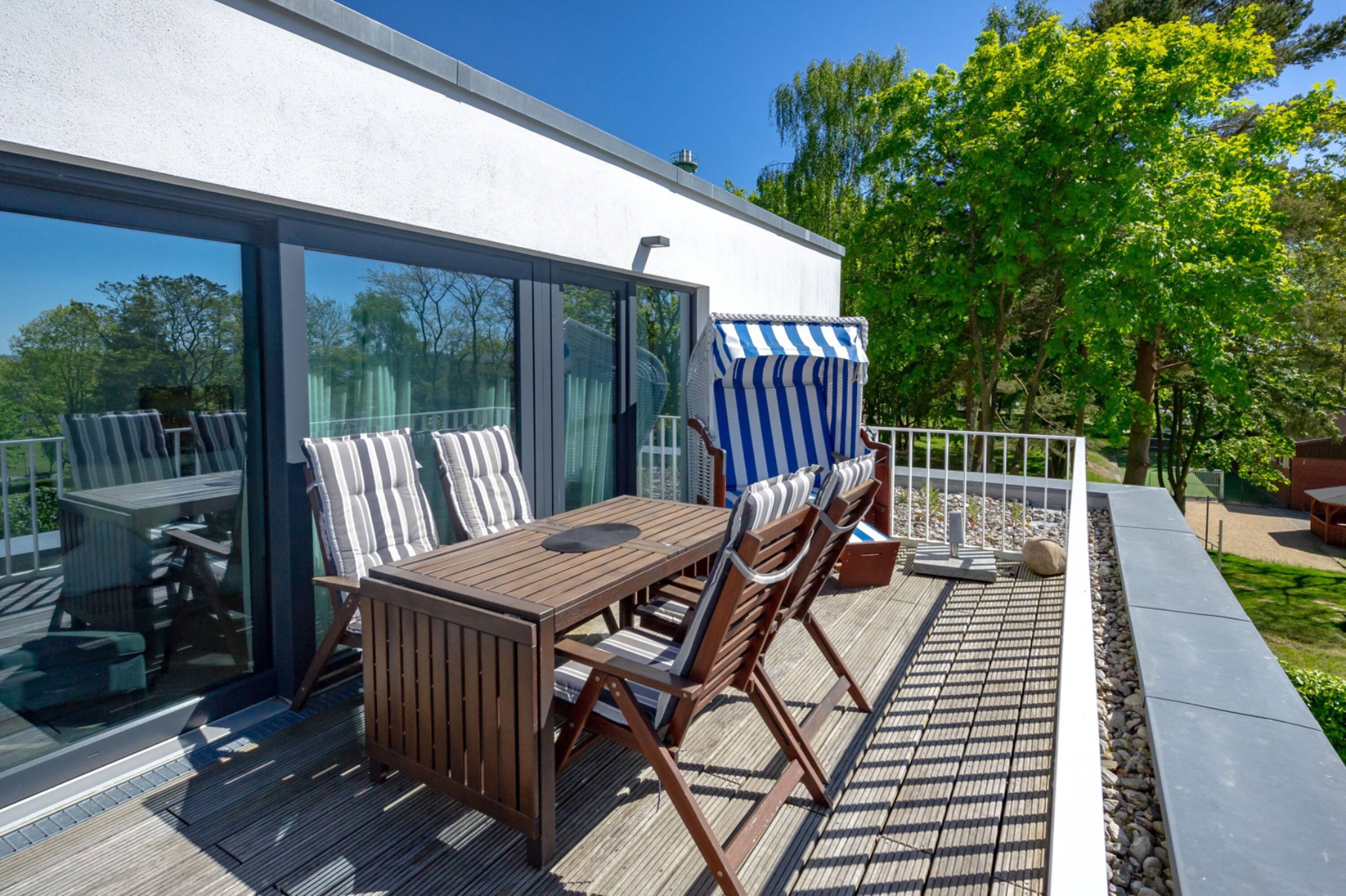 Die vom Wohnbereich zu erreichende Halbebene verfügt über einen Essbereich mit Esstisch sowie einen Lesebereich mit zwei Sesseln. Auf der Dachterrasse mit Südwestausrichtung genießen Sie den wunderschönen Ausblick über Sellin.