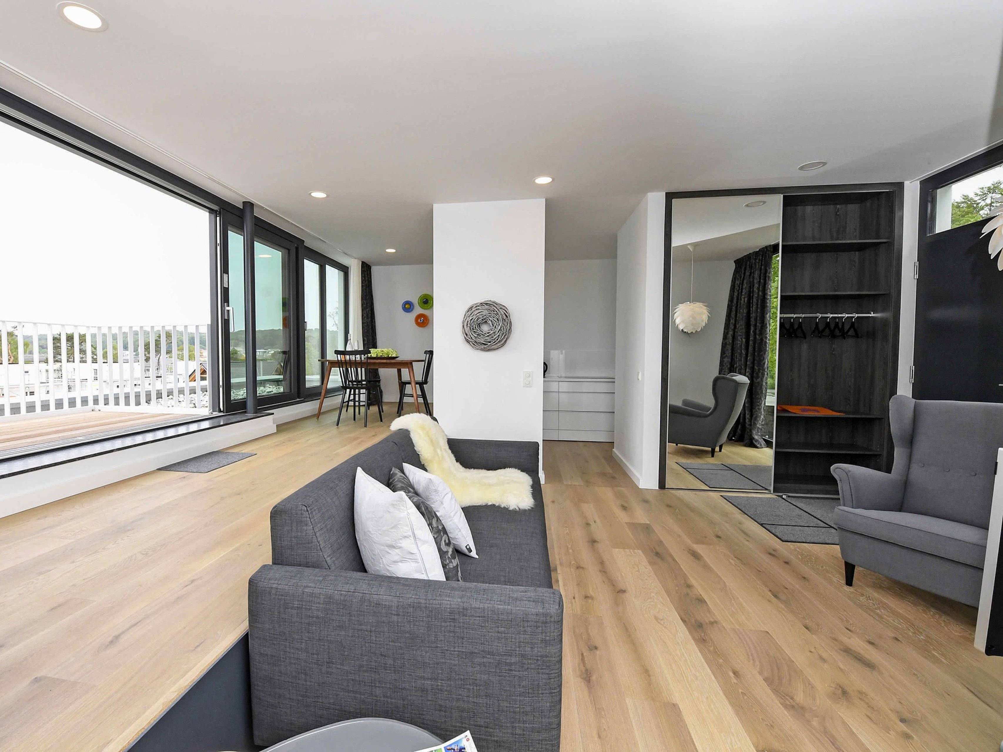 Die Rauch- und Tierfreie Ferienwohnung im Bauhausstil ist mit einer Fußbodenheizung und einem großen Balkon ausgestattet, die nicht nur für moderne Gäste zur Verfügung steht.