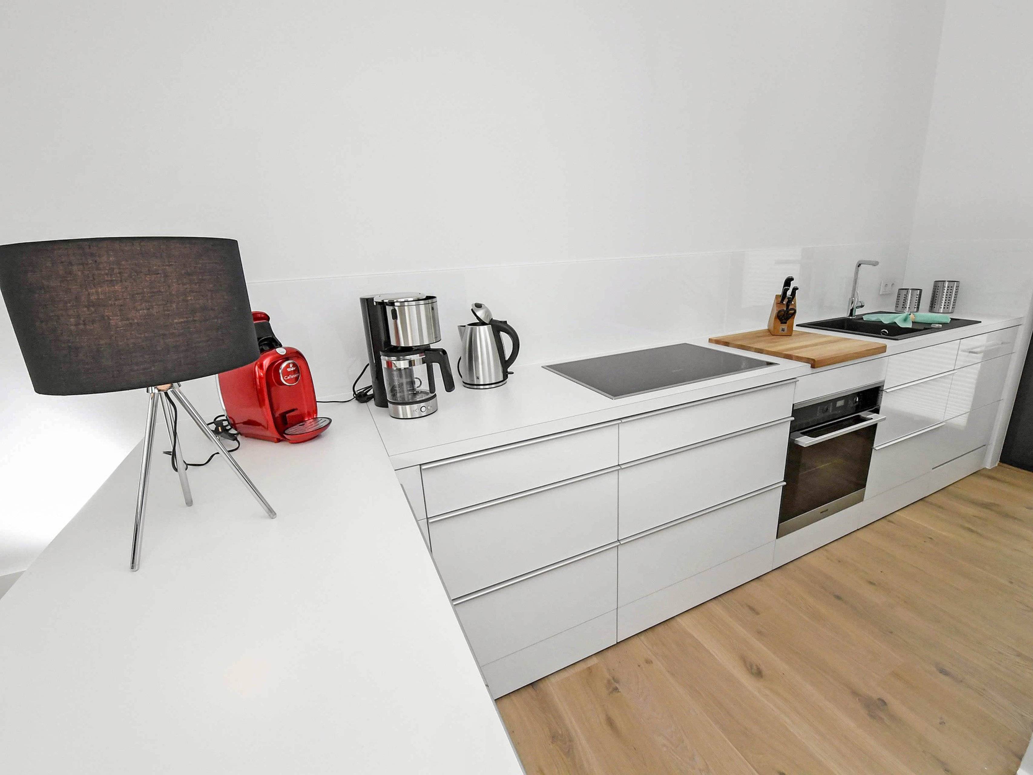 In der angrenzenden voll ausgestatteten und aufwändig gefertigten Einbauküche sind Kühlschrank, Geschirrspülmaschine, 4-Zonen-Cerankochfeld mit Backofen, Waschmaschine, Kaffeemaschine, Wasserkocher, Toaster und diverses Kleininventar vorhanden, das die sehr gute Ausstattung komplettiert.