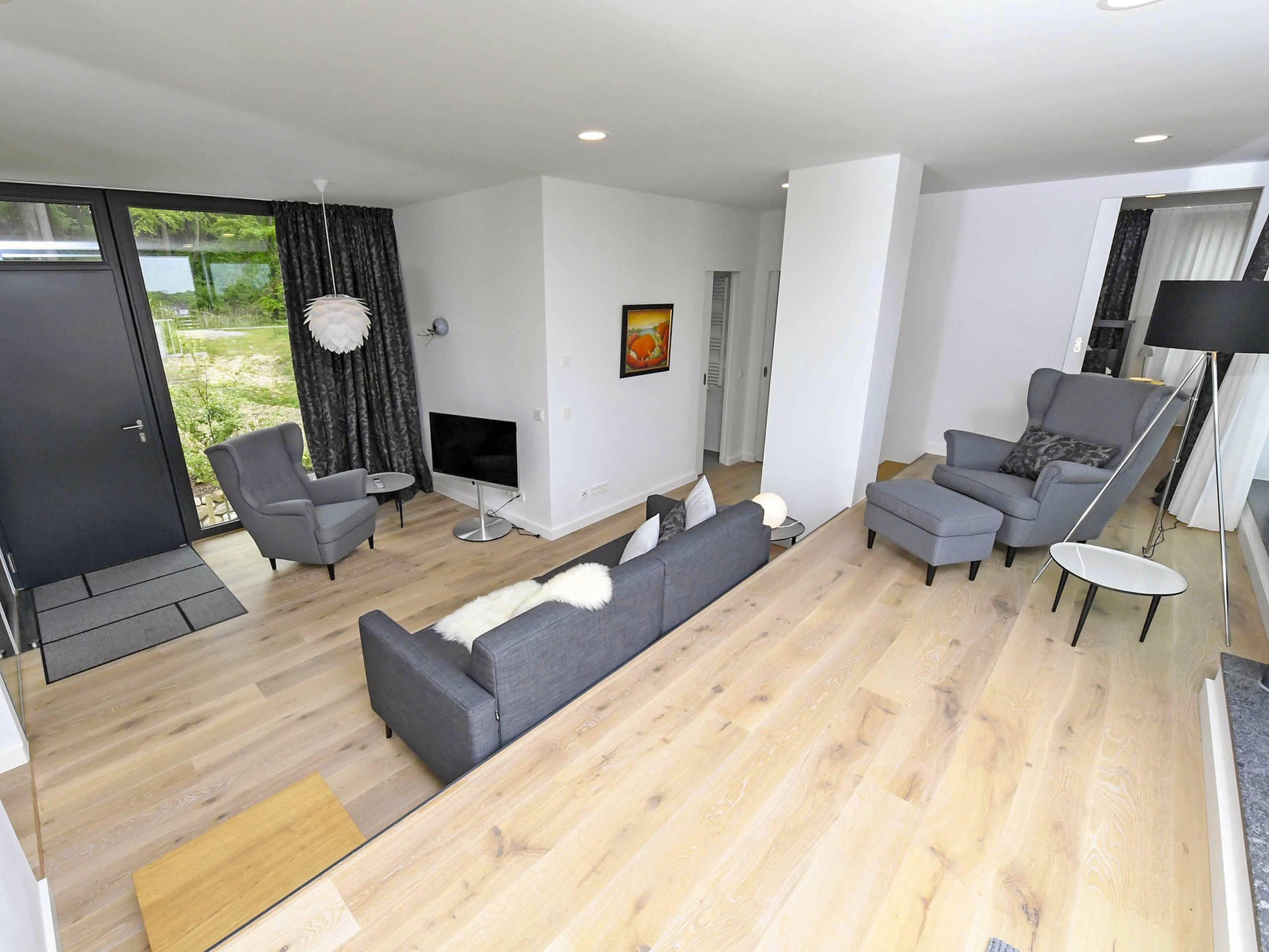 Die großzügige Wohnung im Obergeschoss mit ca. 76 m² Wohnfläche betreten Sie über eine Außentreppe mit separatem Eingang. Die Eingangsebene verfügt über einen offenen Wohnbereich mit hochwertiger Sitzgruppe. Ein Plasma-TV ist vorhanden.