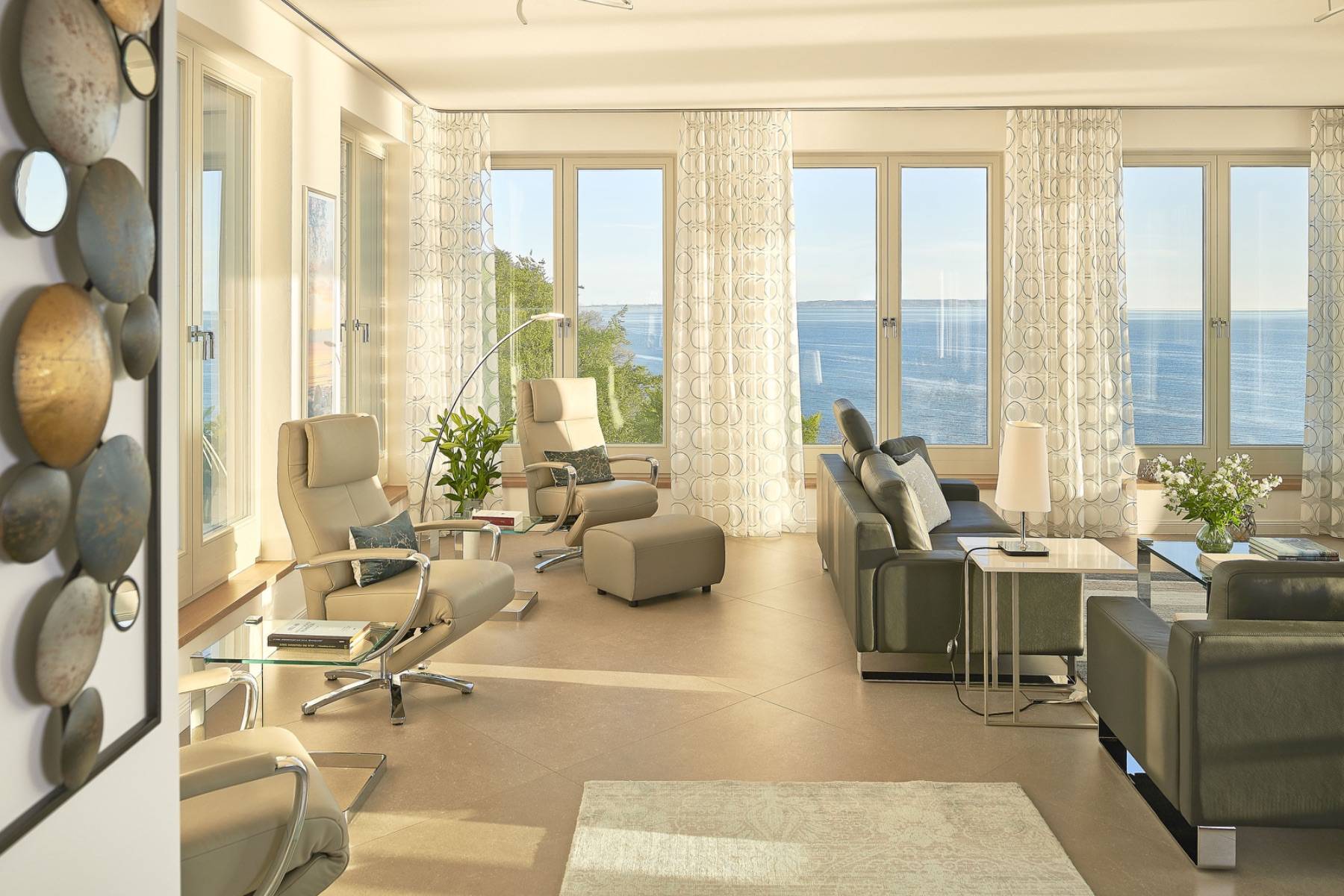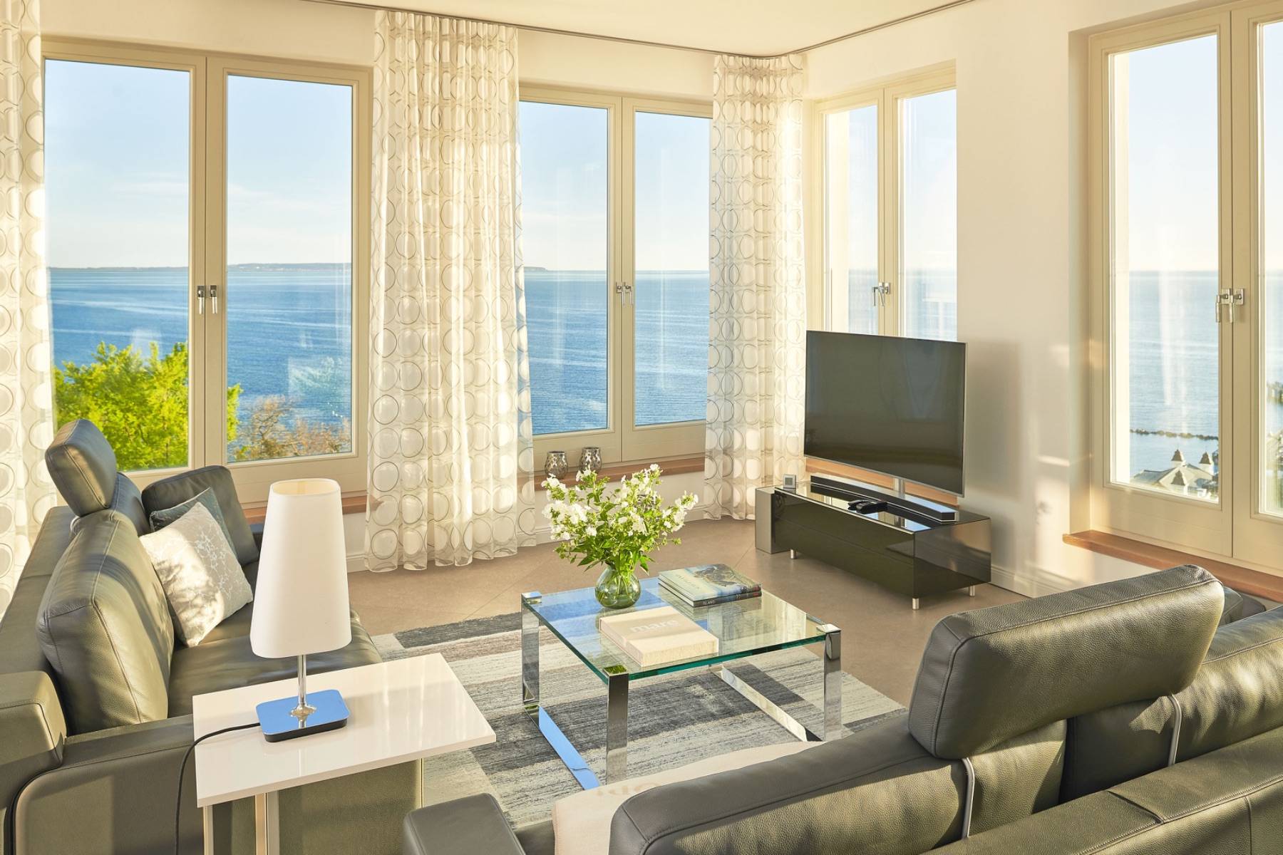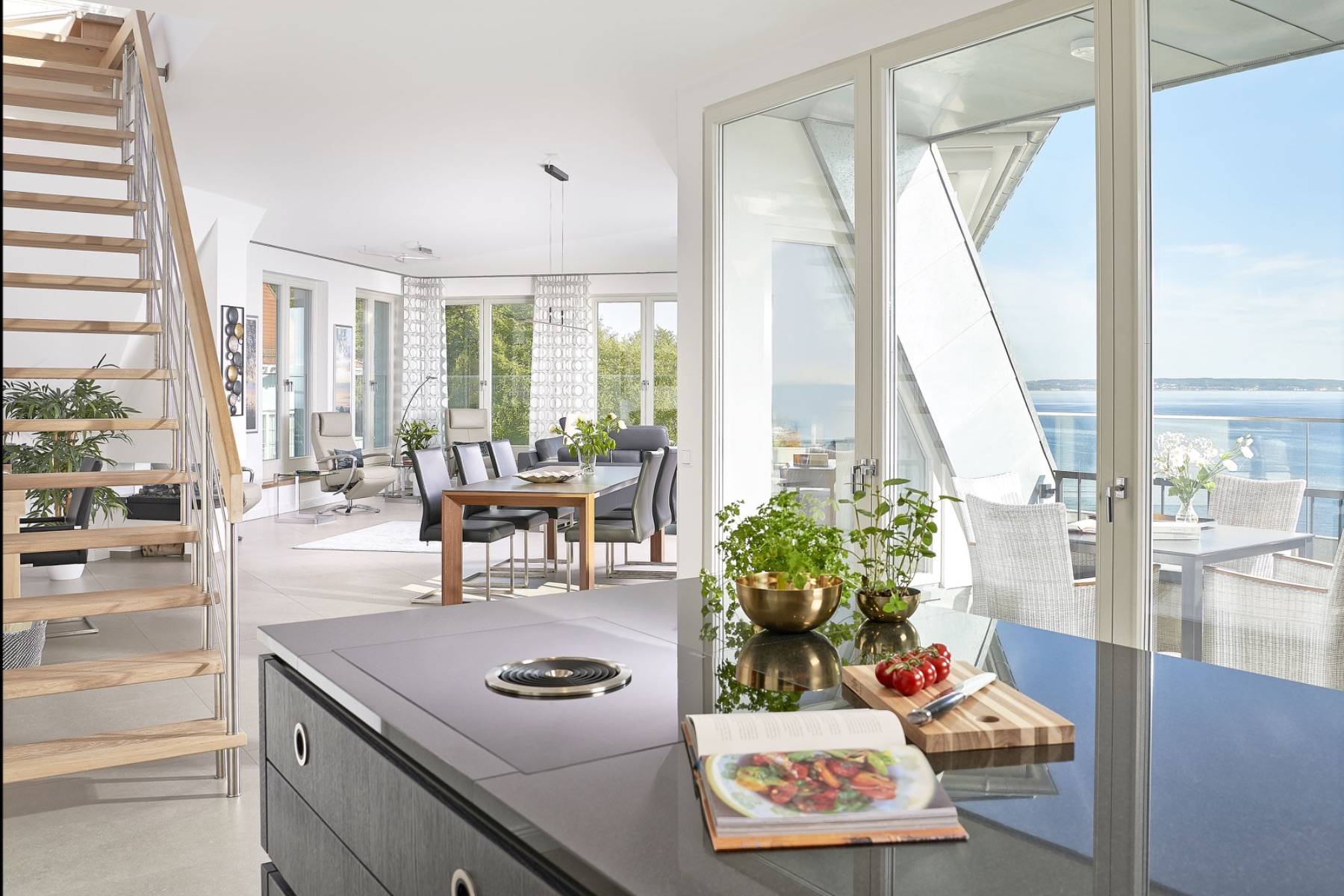 Ein spektakulärer Einblick zum Ausblick: der weitläufige Wohnbereich ist mit zahlreichen Fenstern umrahmt, die den Blick auf die Weiten der Ostsee und in den Himmel lenken. Außerdem ist die Luxusküche von Warendorf auch ein Eyecatcher, die mit Elektrogeräten von Miele und Neff bestückt ist.