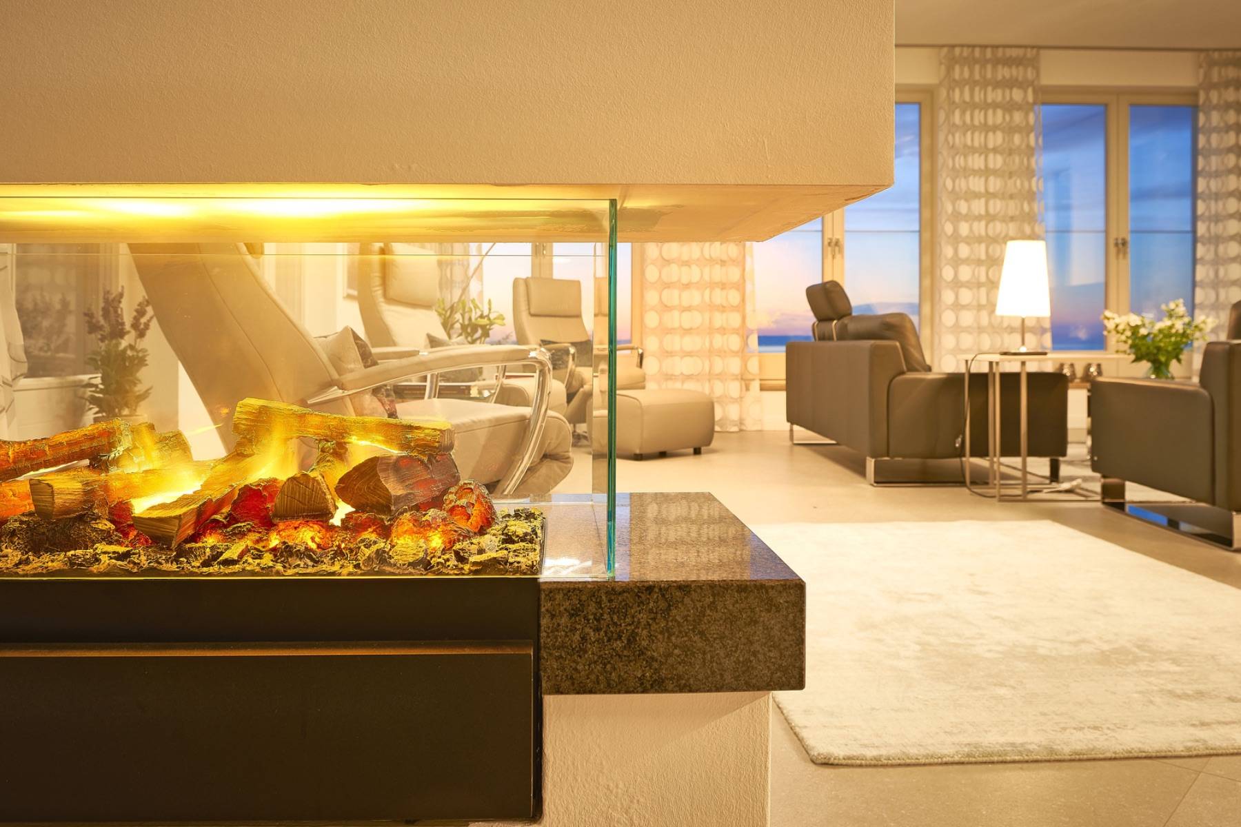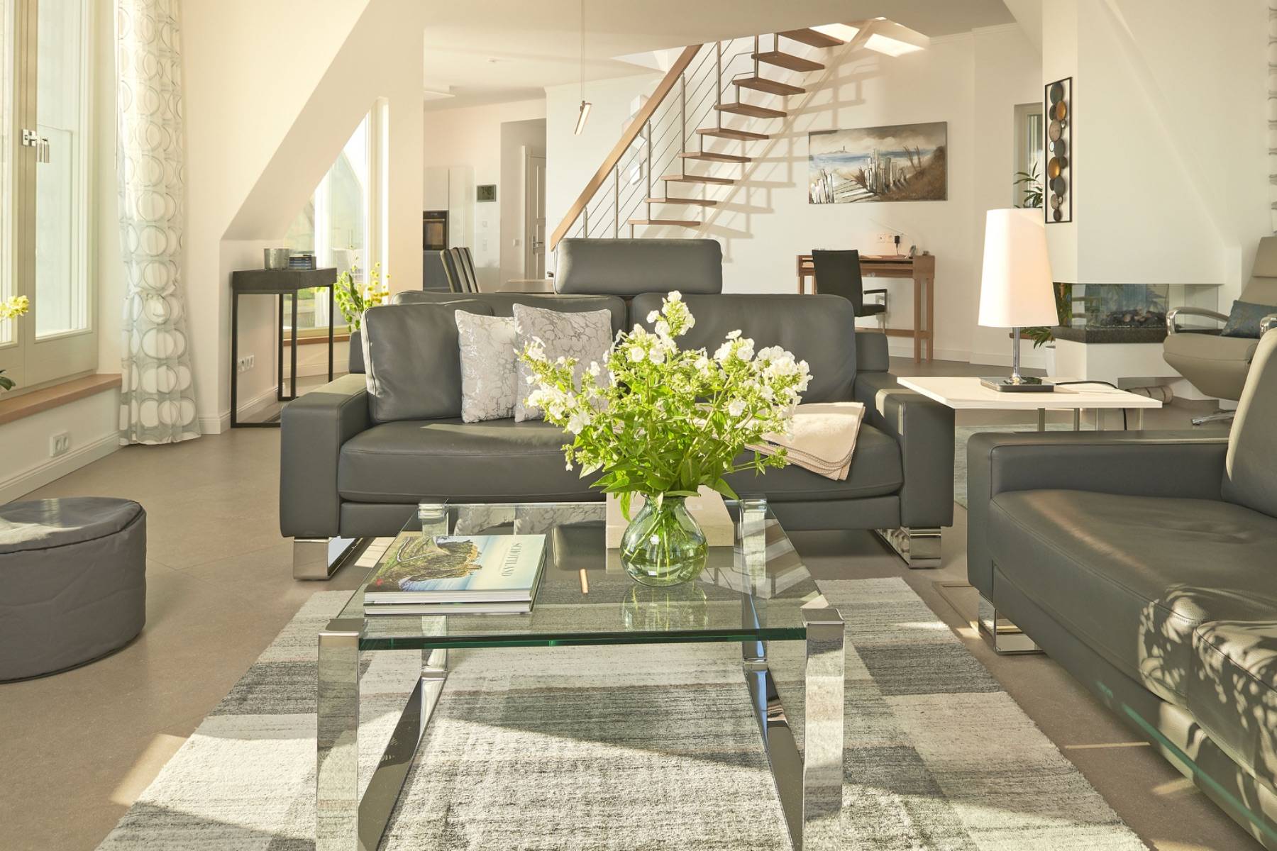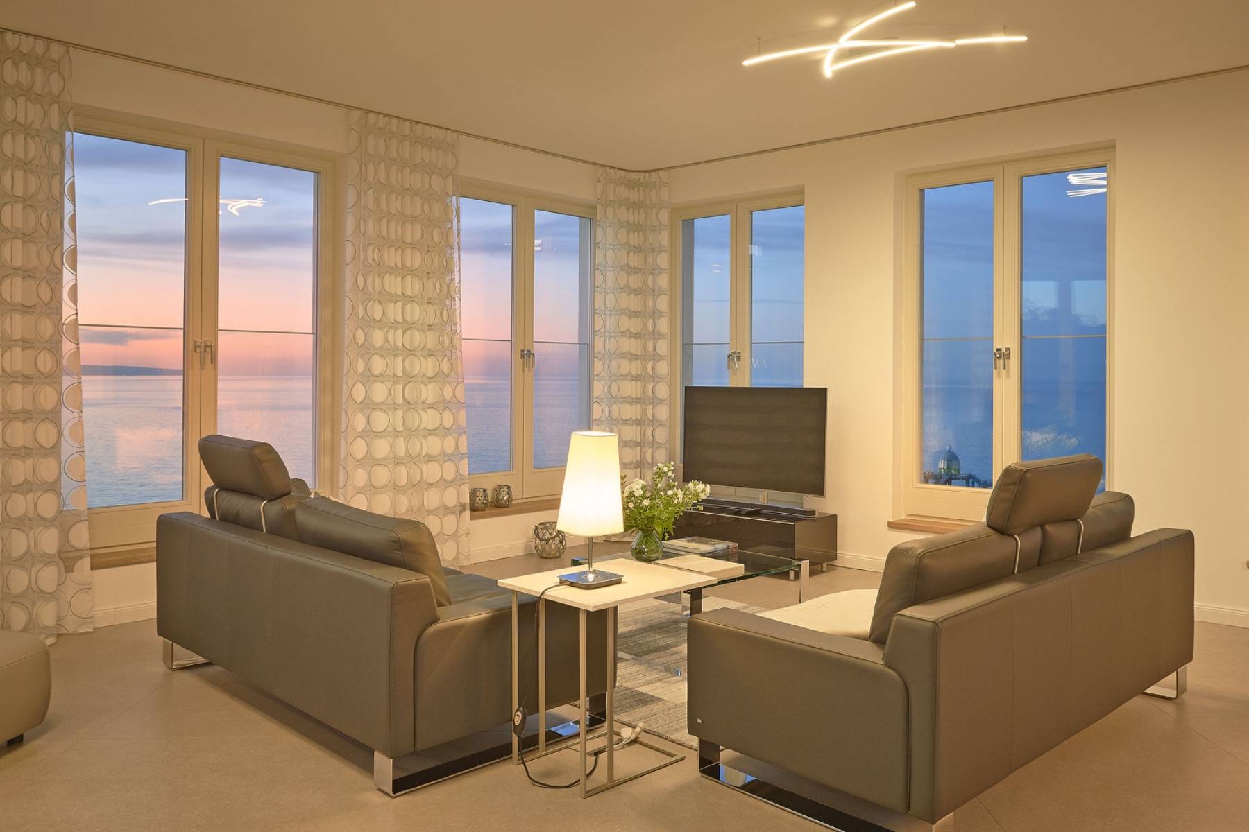 Ein spektakulärer Einblick zum Ausblick: der weitläufige Wohnbereich ist mit zahlreichen Fenstern umrahmt, die den Blick auf die Weiten der Ostsee und in den Himmel lenken. Außerdem ist die Luxusküche von Warendorf auch ein Eyecatcher, die mit Elektrogeräten von Miele und Neff bestückt ist.