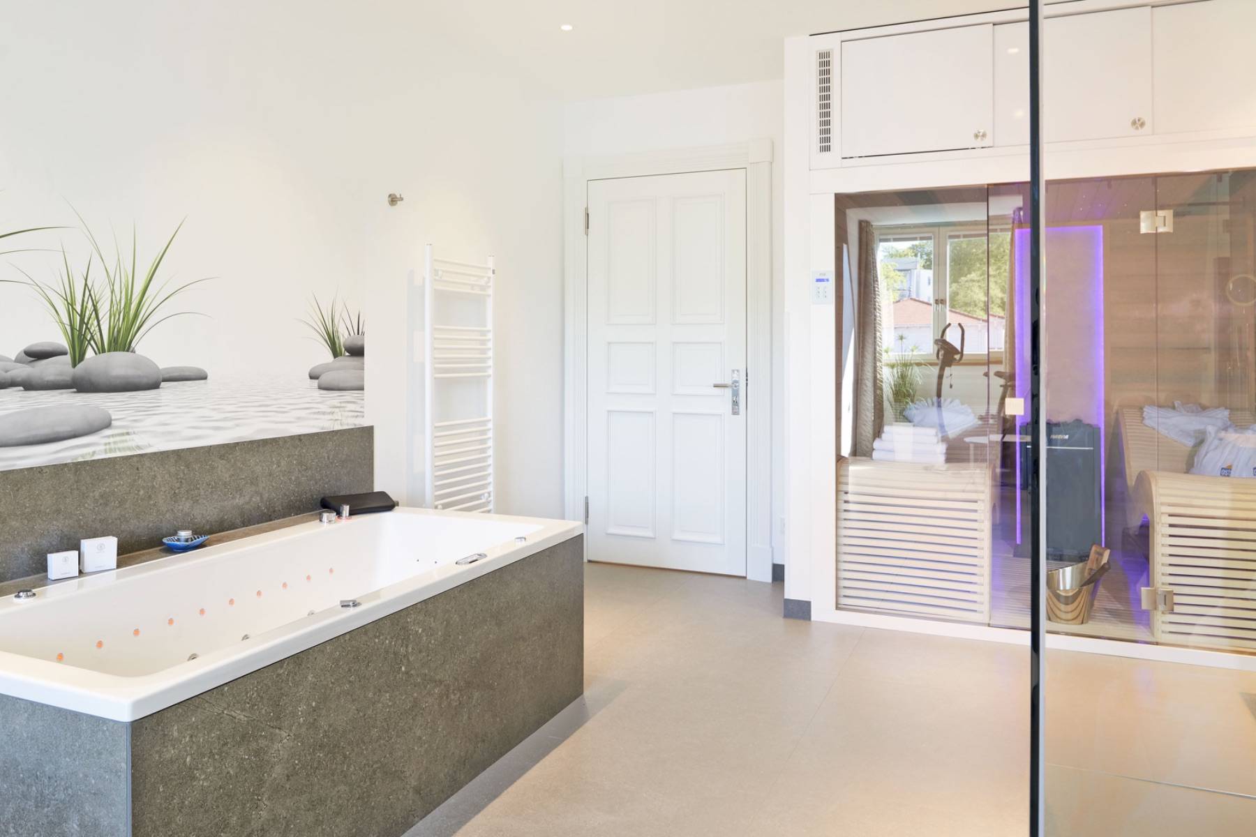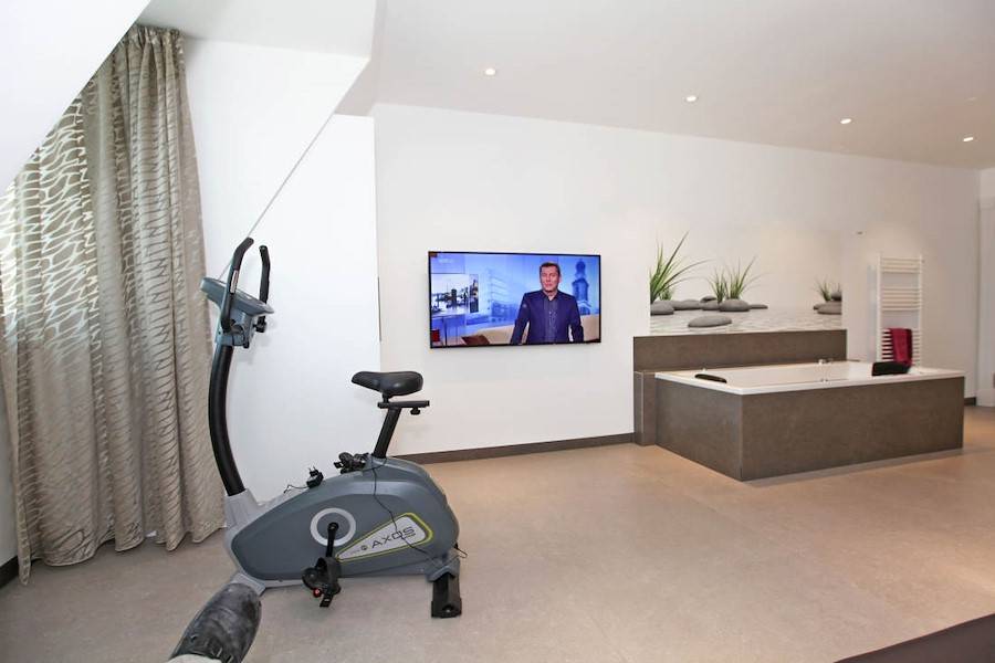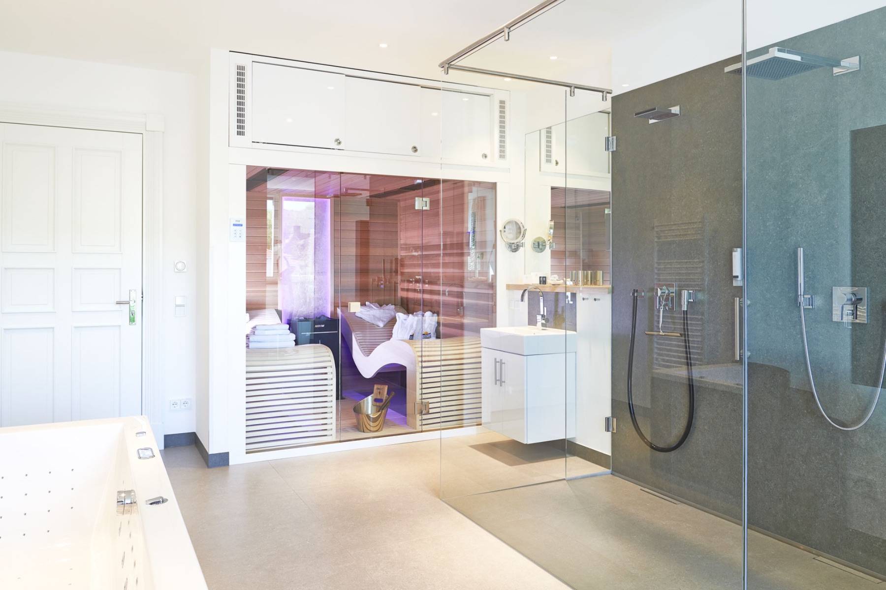 Zum Übernachten laden zwei großzügige Schlafzimmer mit Boxspringbetten und komfortablen Matratzen ein. Zudem ist jedes Schlafzimmer mit einem modernen Bad en suite versehen. Eine zentrale Rolle spielt der eigene Wellnessbereich, in dem eine Sauna zum entspannen verführt. Ganz gleich, ob man die finnische Variante bevorzugt, ein Dampfbad oder die angenehme Wärme einer Infrarotsauna wählt. Weiterhin gibt es eine Walk- In- Dusche, ein Whirlpool, ein Fahrrad und ein Flachbildschirm.