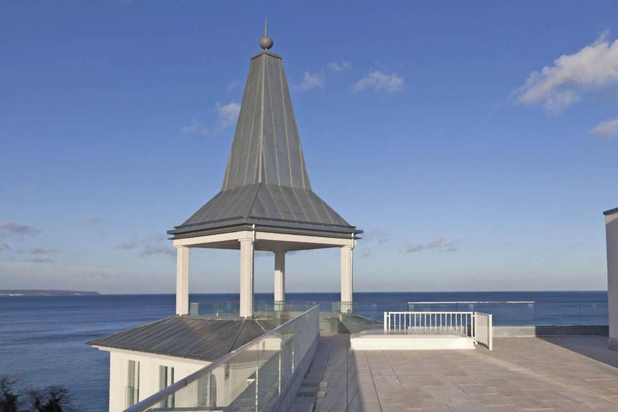 Wer jedoch mehr Meer möchte, sollte der Treppe im Wohnbereich folgen. Hoch oben auf der Dachterrasse kann man seinem Freudenschrei freien Lauf lassen. Auf der eigenen Dachterrasse kommt man in den einzigartigen Genuß eines spektakulären Panoramameerblicks, der bis zu den weltberühmten Kreidefelsen reicht. Auf den Loungemöbeln unter dem Turmdach, kann man strahlend den Sonnentag auskosten.