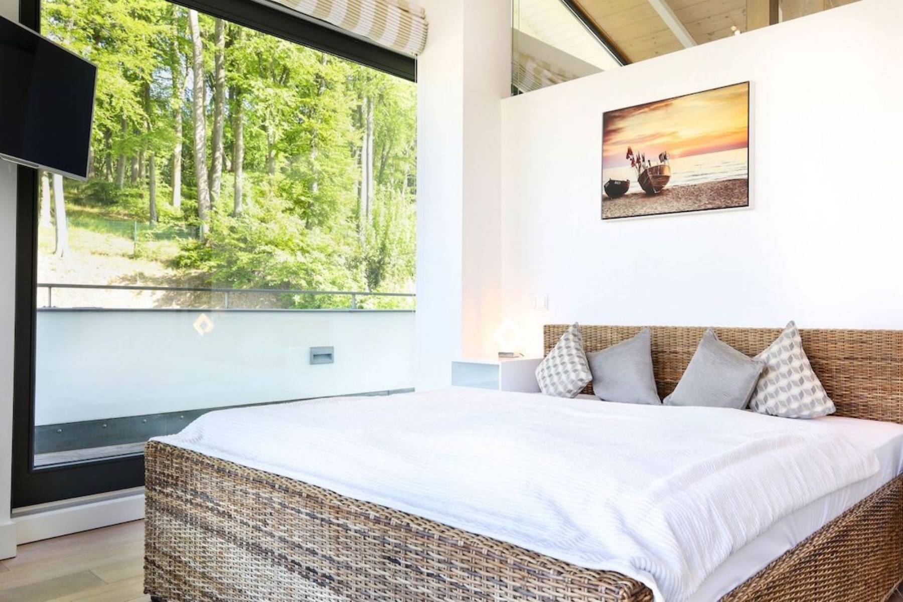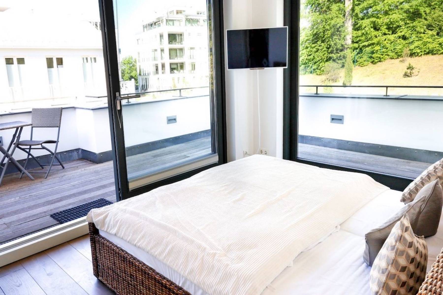 Doppelbett Fenster Flatscreen Fußbodenheizung Plissees Rauchmelder Terrassenzugang Waldblick