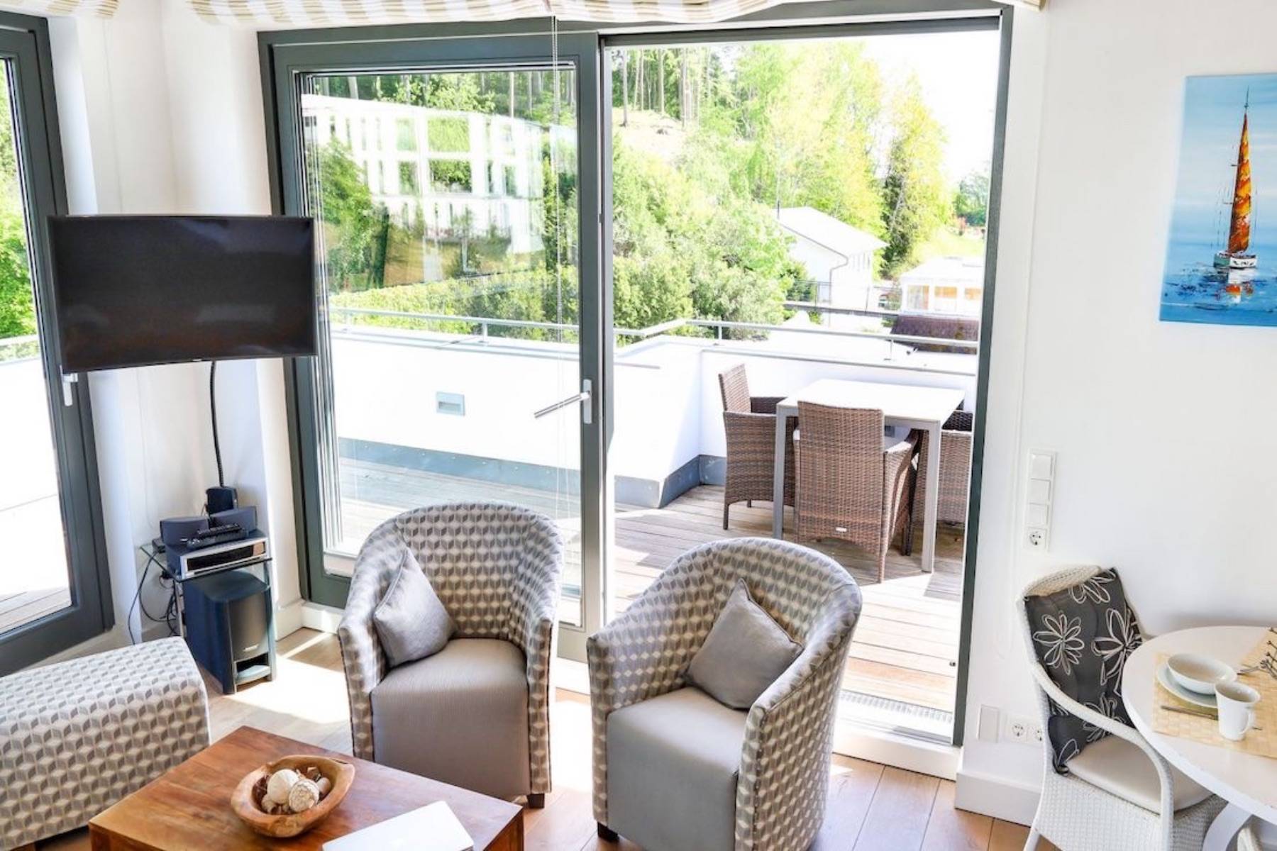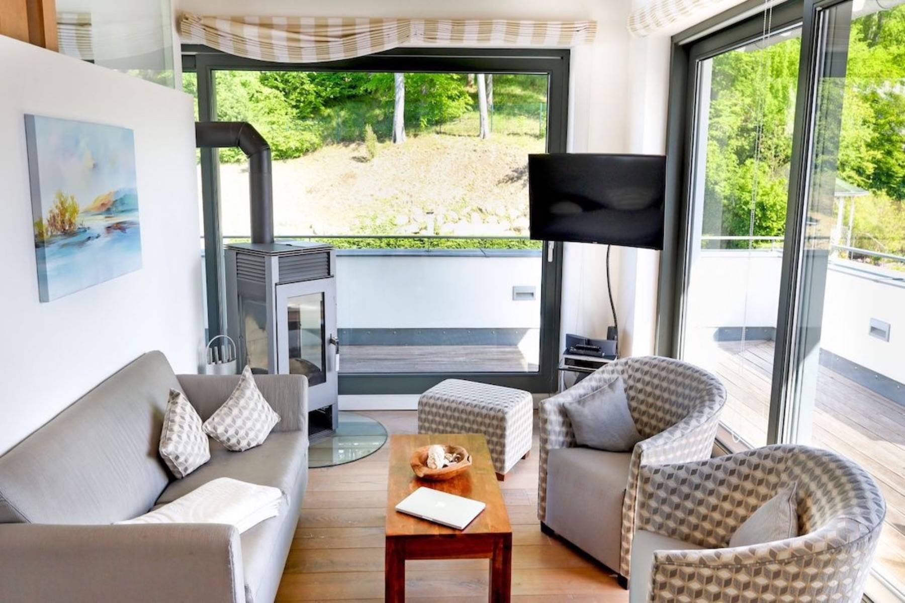 Balkonzugang DVD- Player Fenster Flatscreen Fußbodenheizung Hifi- Anlage Bose Kaminofen Sessel Sofa Terrassenzugang TV- Sat/ Kabel Vorhänge Waldblick
