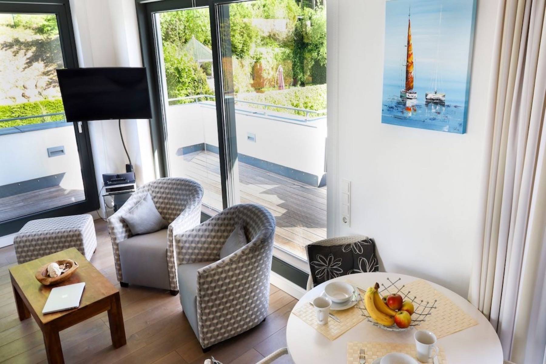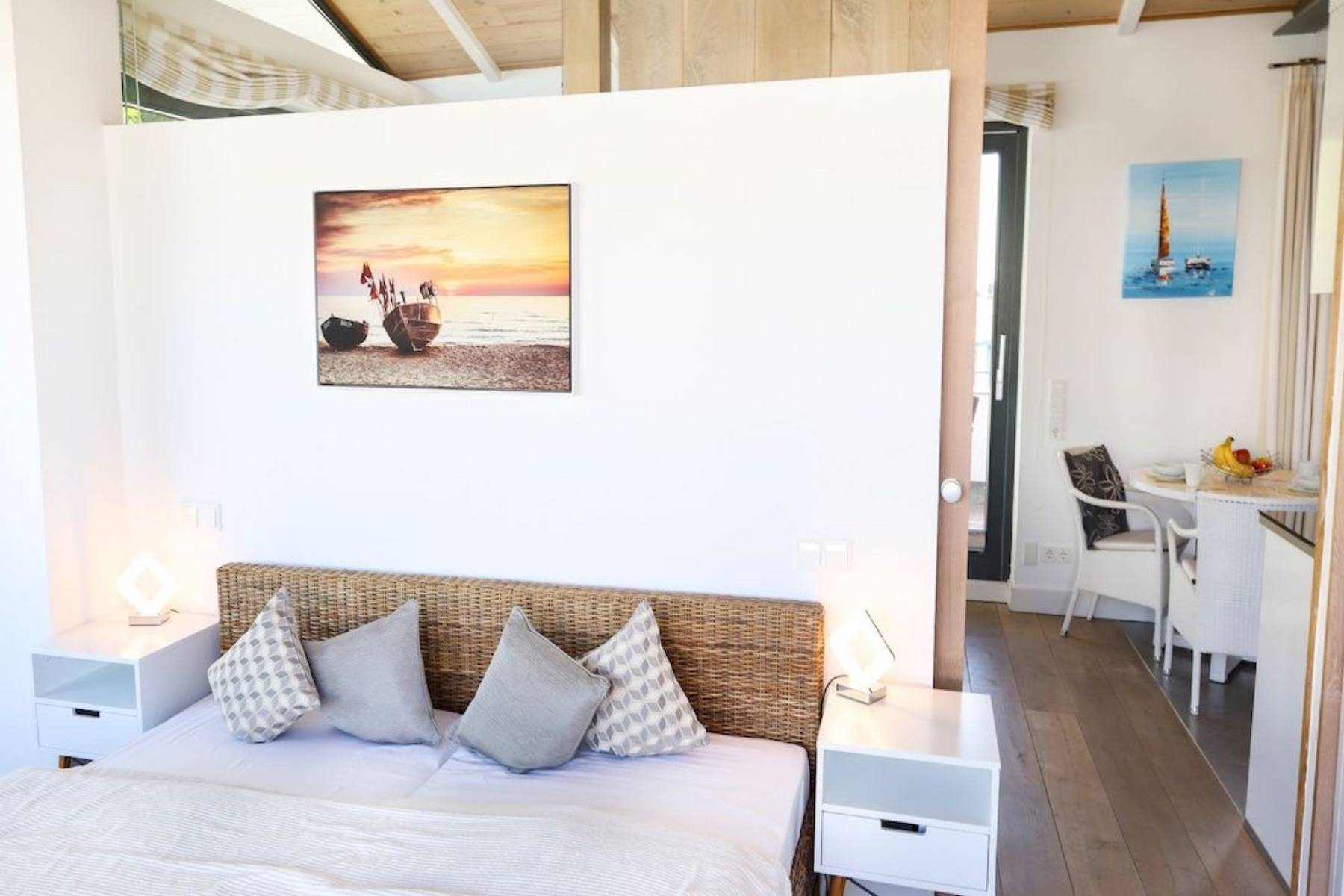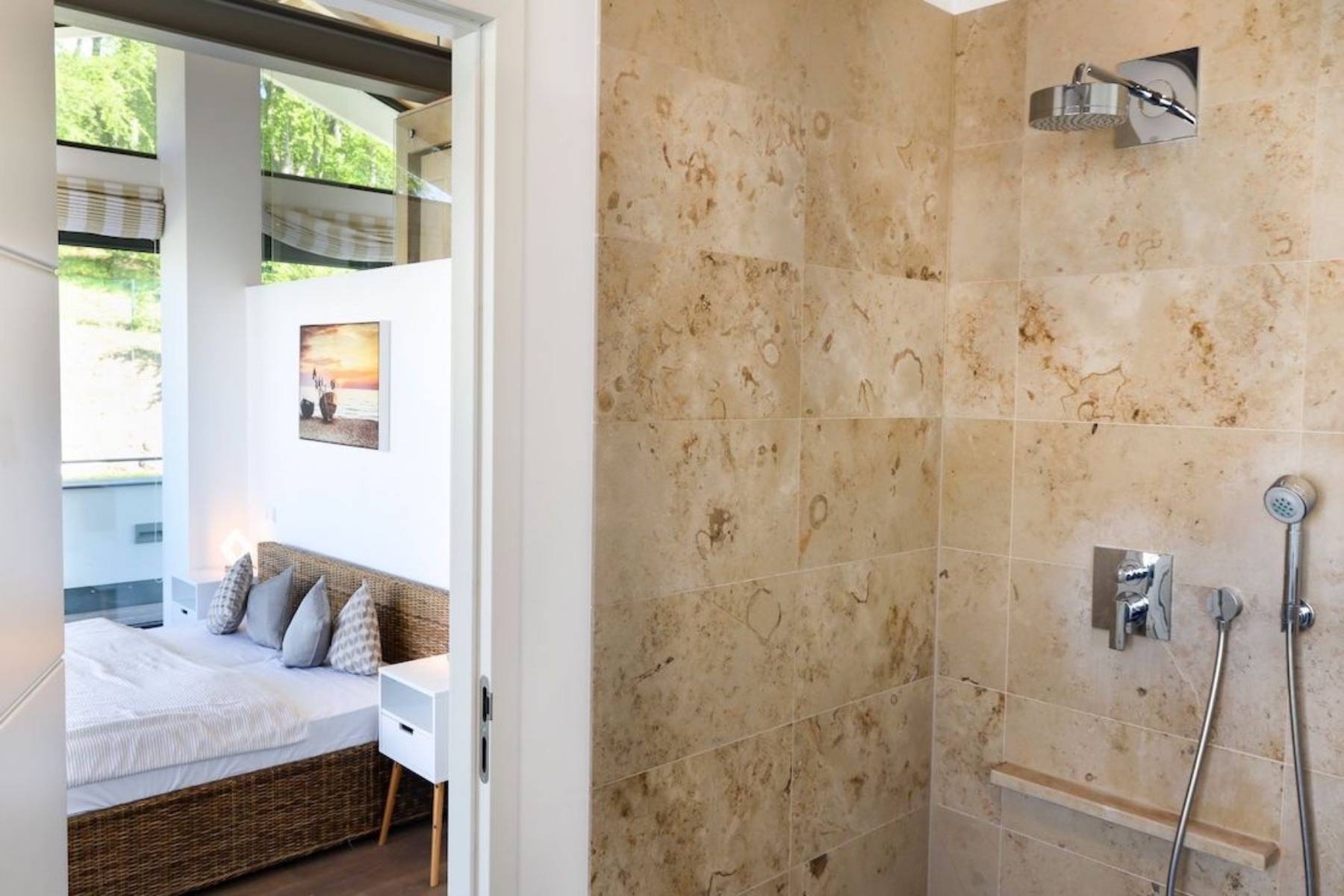 Nur wenige Meter vom Badestrand entfernt, parken Sie das Fahrzeug in der Garage und fahren bequem mit dem Aufzug in die Endetage. Dort erwartet Sie das Penthouse Paulus für gemütliche Stunden zu zweit.