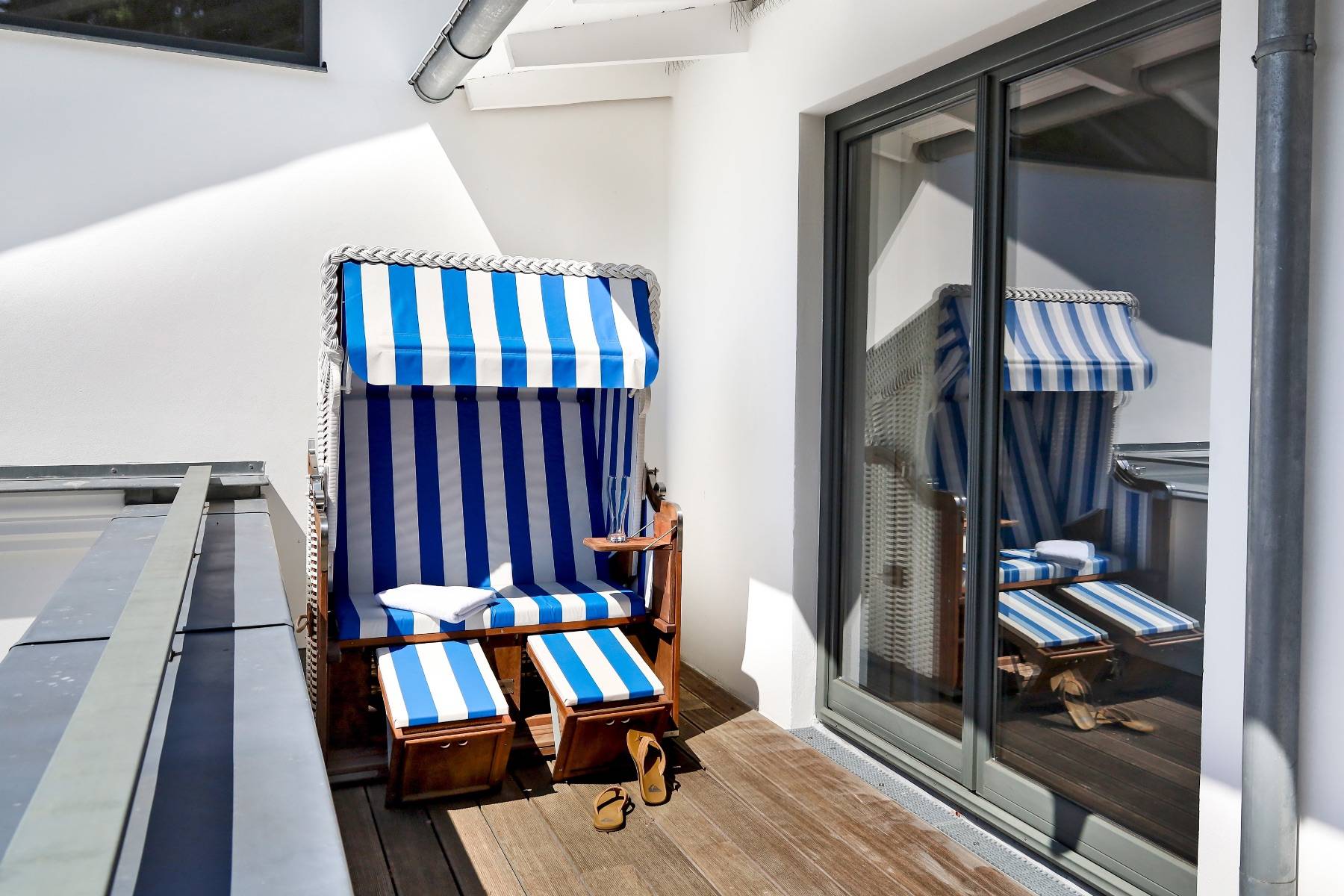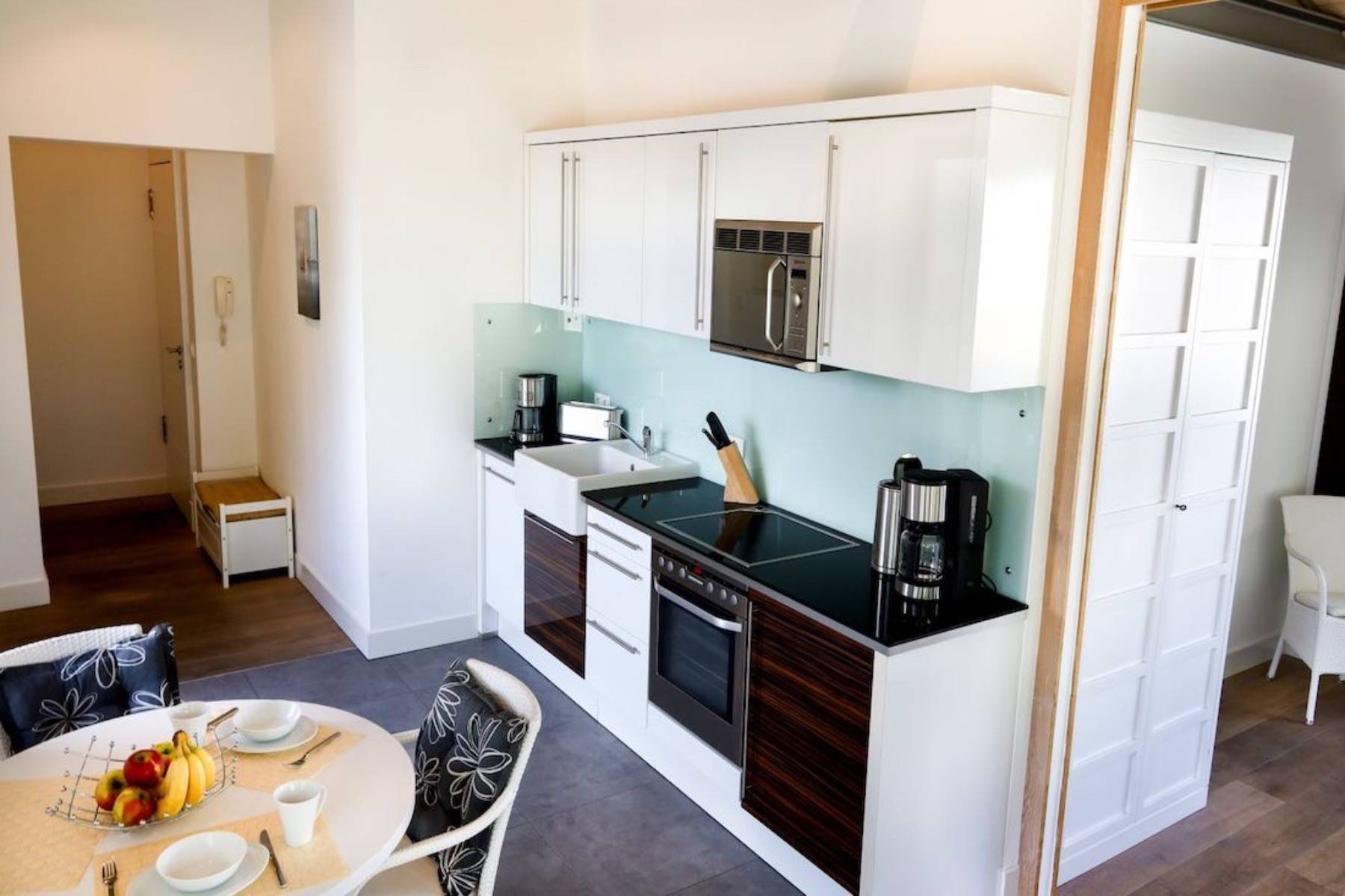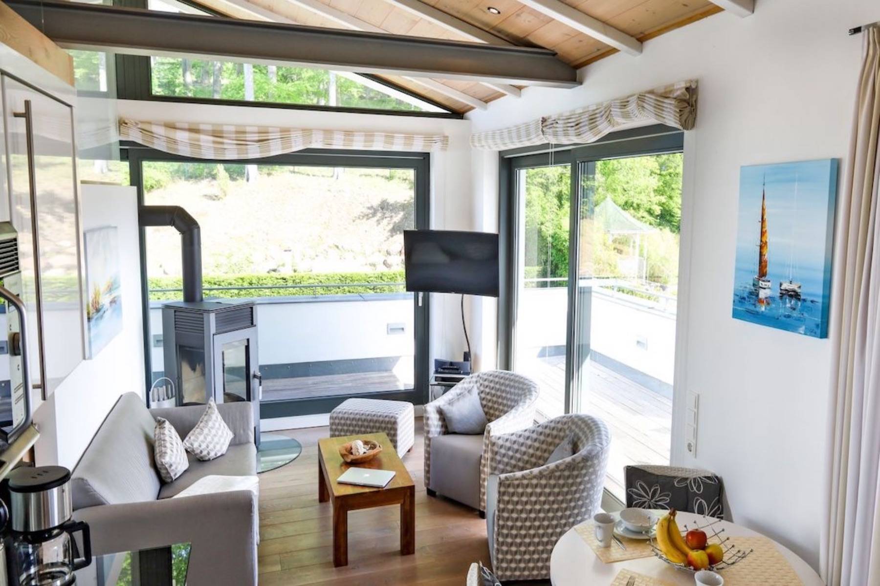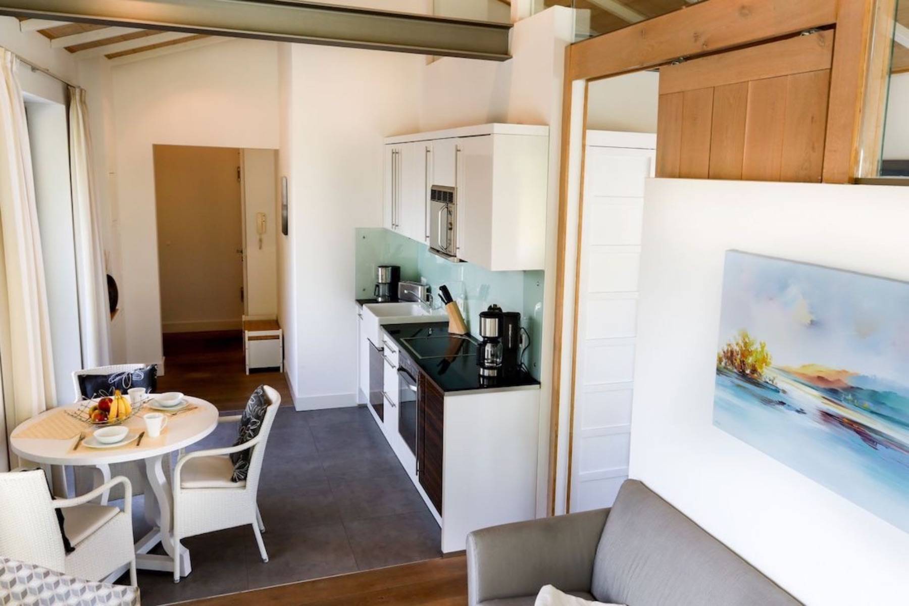 Nur wenige Meter vom Badestrand entfernt, parken Sie das Fahrzeug in der Garage und fahren bequem mit dem Aufzug in die Endetage. Dort erwartet Sie das Penthouse Paulus für gemütliche Stunden zu zweit.